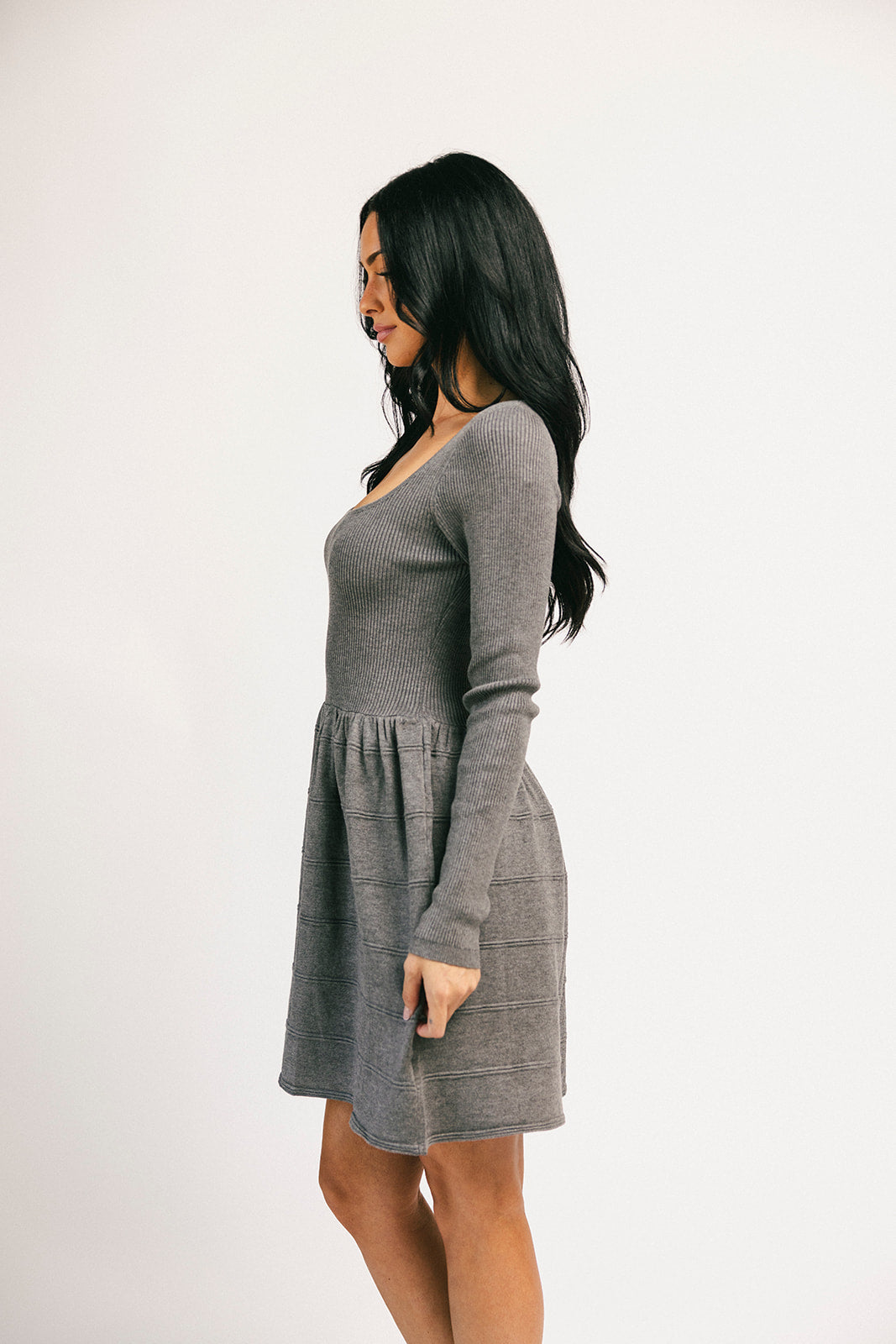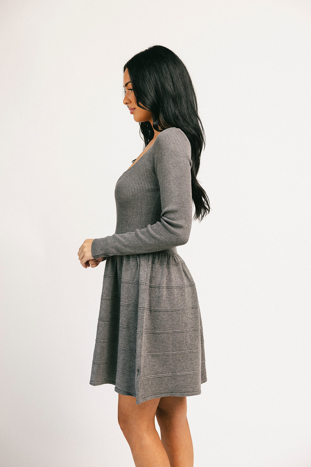 • grå // minilängd, rund halsringning, ribbad överdel, a-linjeformad kjol
