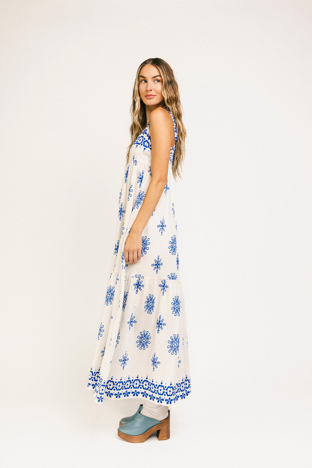 Klädekvivalenten till en sommarromans, denna mönstrade klänning i kungligt blått och vitt är gjord för stranddagar + semestrar. Med sin lätta, böljande silhuett och medelhavsinspirerade tryck är det den perfekta sommarklänningen för både dag och kväll. Klä upp den med klackar eller slank med sandaler.