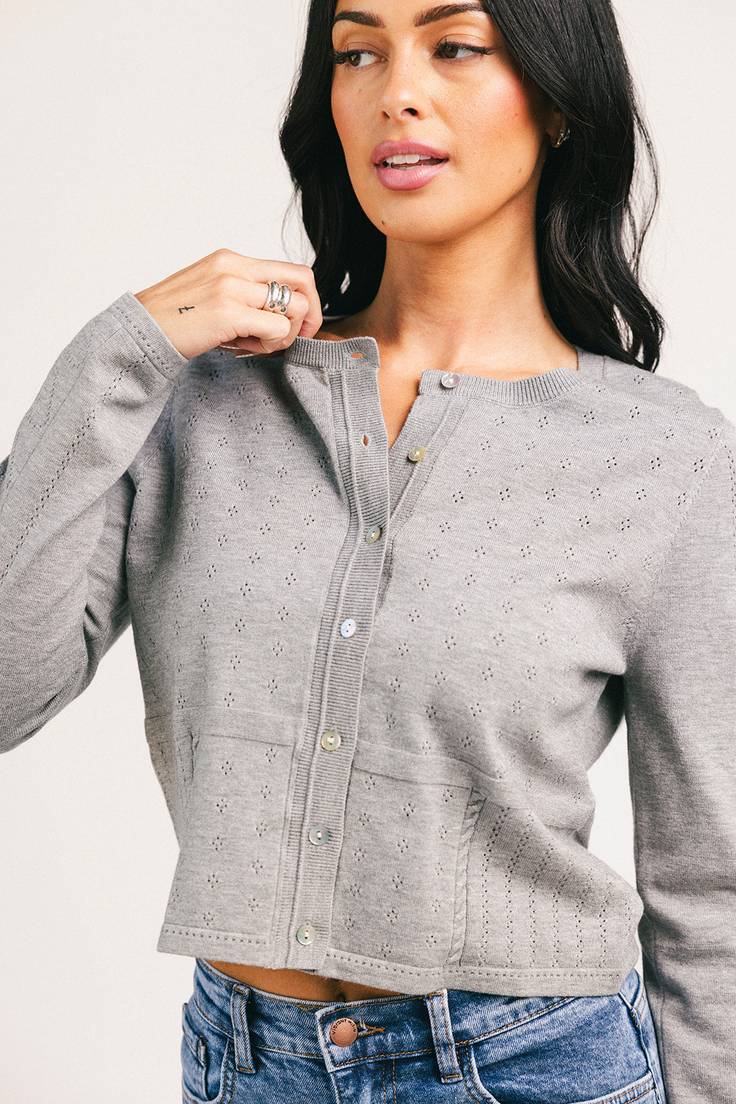 Lätt + ultralyxig, denna beskurna grå kofta är perfekt att bära över linnen + klänningar, eller att styla ensam med din favoritjeans. Den har sydda detaljer i midjan för en chic, åtsittande look. En oumbärlig stickad tröja för varje säsong.