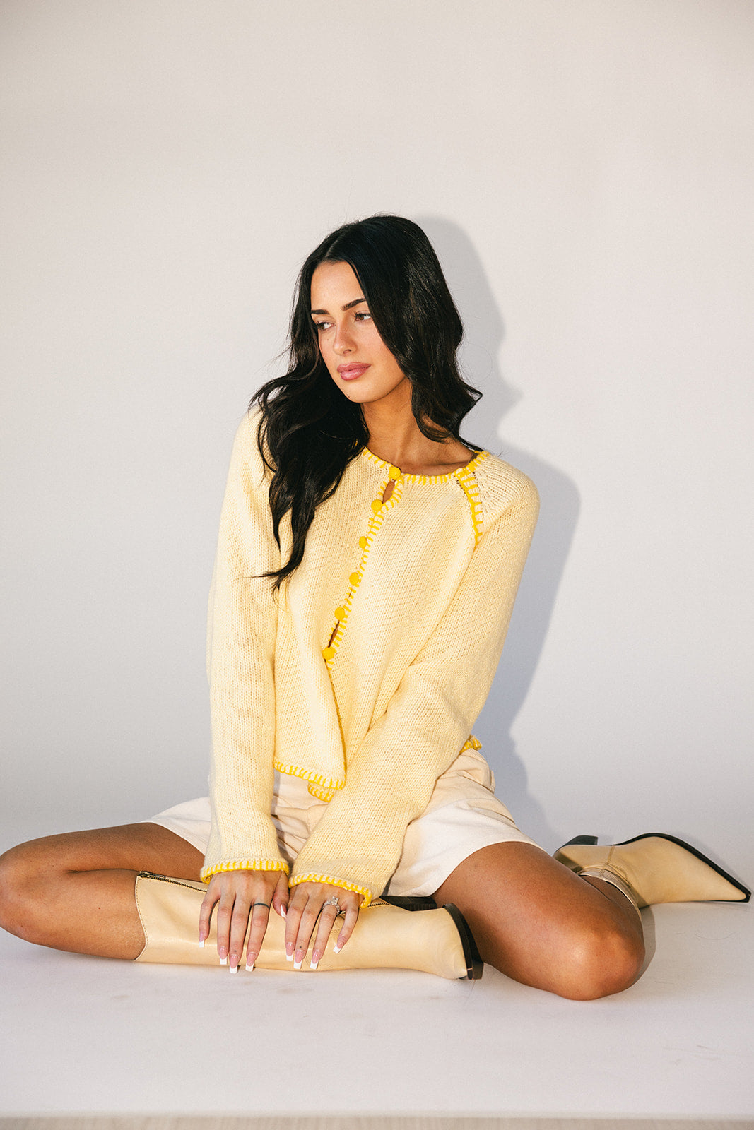 Liva upp vilken outfit som helst med denna beskurna pastellgula kofta. En klassisk vintageinspirerad tröja med avslappnad passform, eleganta knappar och en flörtig öppen nederkant. Den perfekta koftan för hela säsongen att styla med dina favoritjeans eller över en böljande sommarklänning.