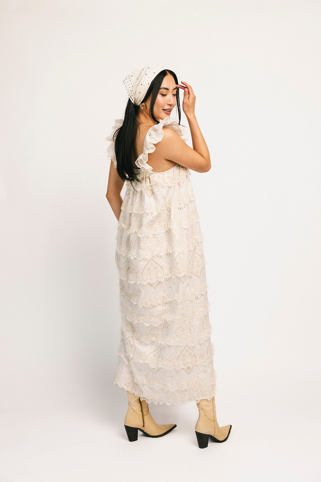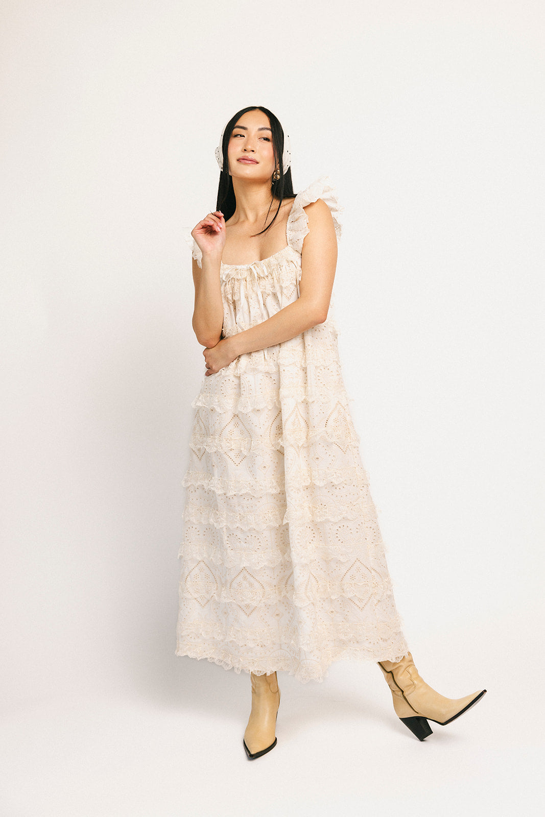 Den perfekta kombinationen av flörtigt och romantiskt – denna volangmönstrade maxiklänning tar dig från middagsdejter till bröllopsfester. Med en elegant fyrkantig halsringning och invecklade spetsdetaljer är det ett tidlöst plagg du kommer att använda varje gång "något speciellt" står på programmet.
