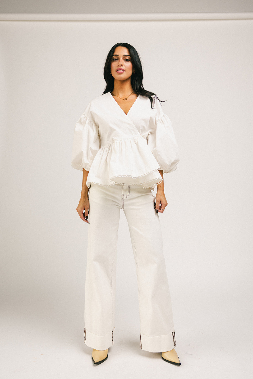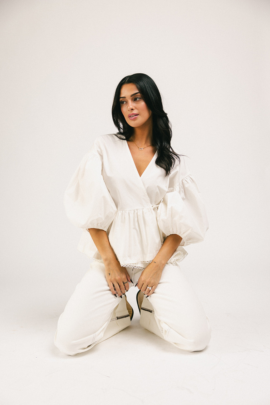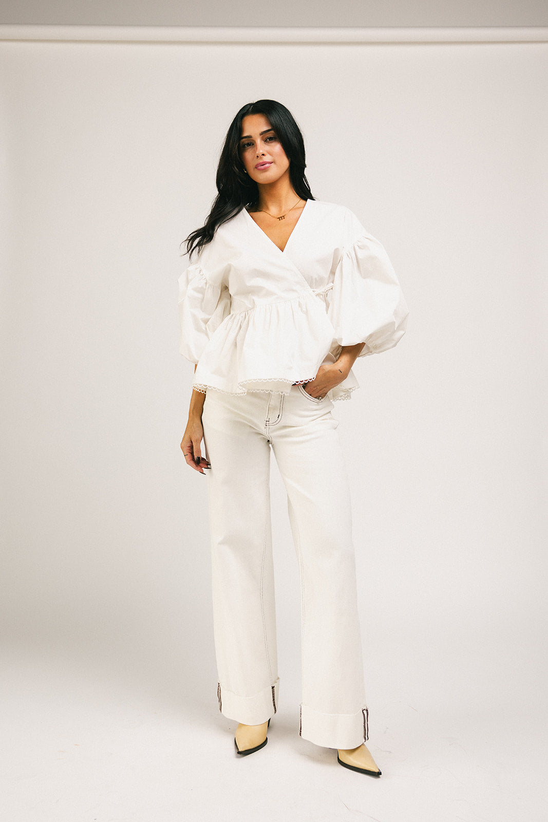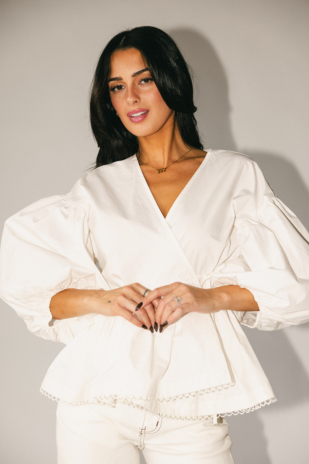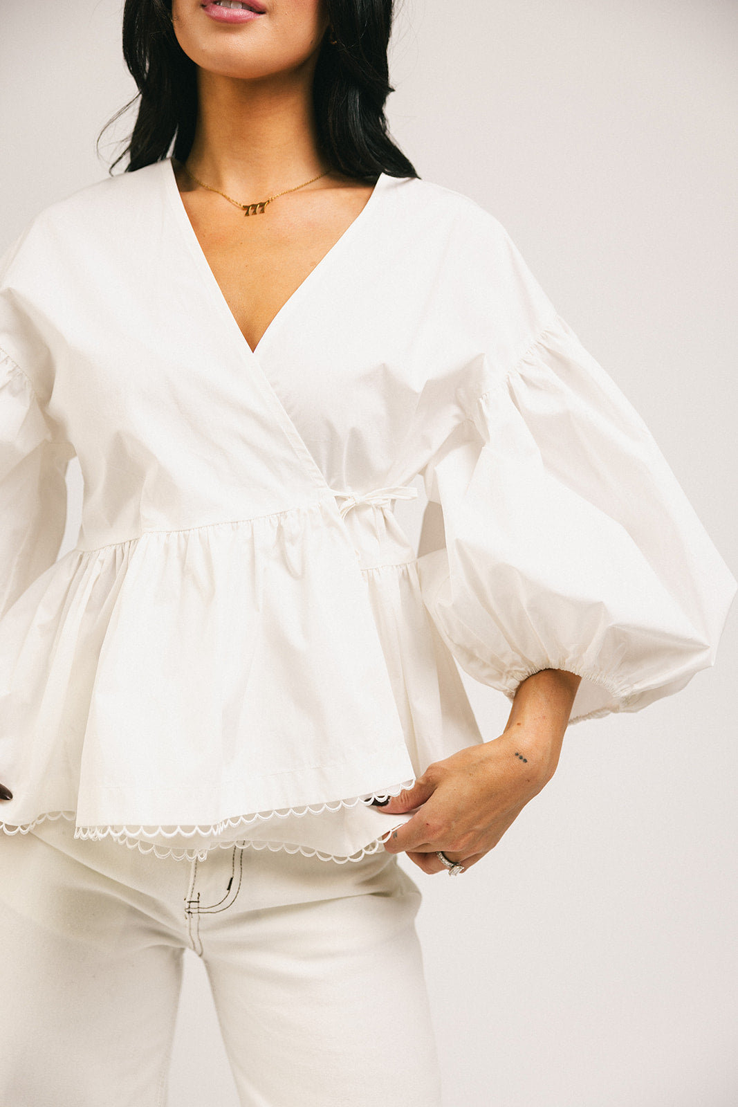 Förhöj vilken outfit som helst med denna fantastiska vita blus med puffärmar. Med en avslappnad omlottsilhuett och peplum-form är det en topp som är romantisk nog för dejtkvällar, bekväm nog för vardagsbruk och tidlös nog att ha i garderoben för alltid. Klä upp den med en maxikjol + klackar, eller ner med jeans + plattskor.