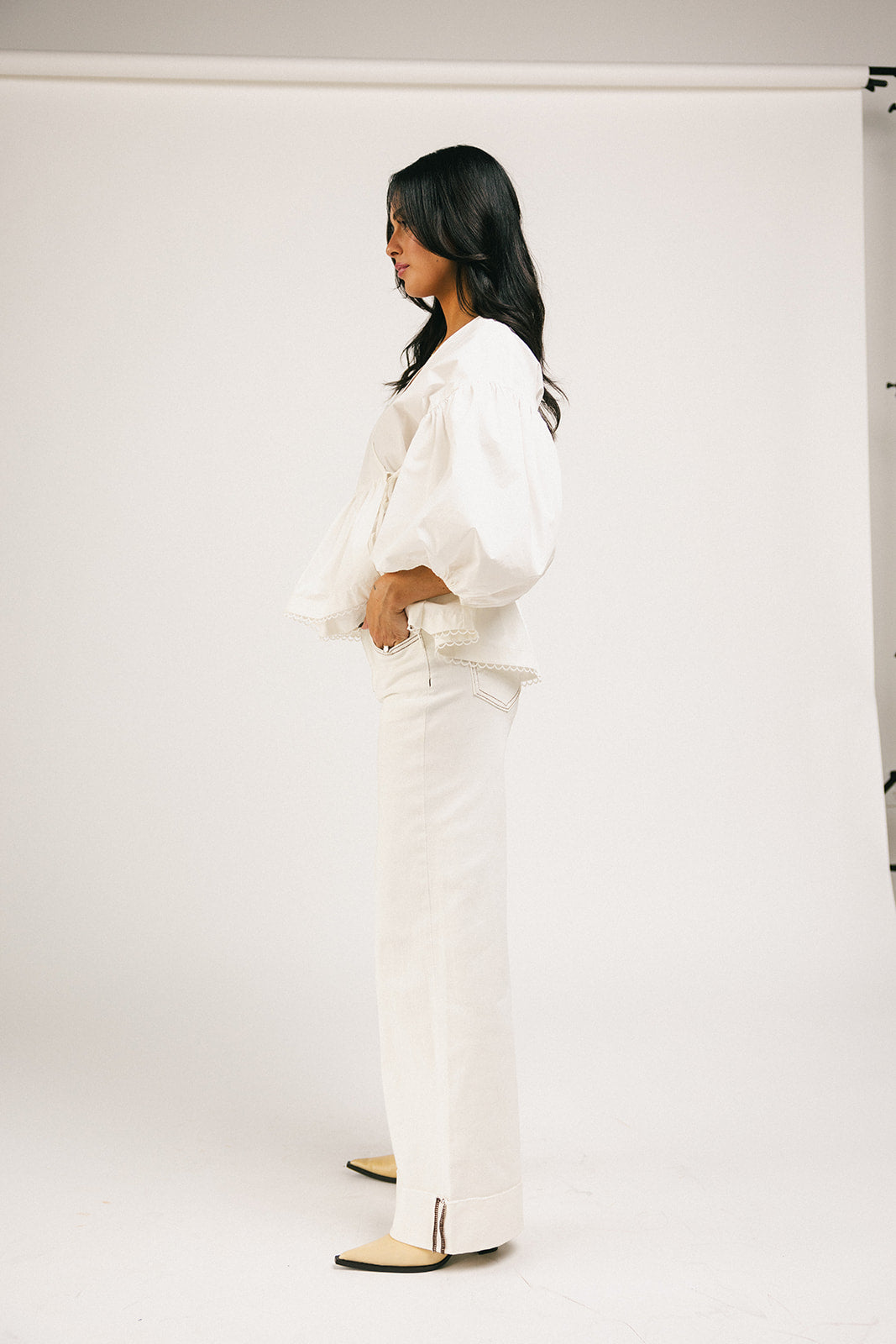 • vit // v-ringning, äkta omlott, peplum, nedhängd axel, justerbart knytband i sidan, knäppning med knappar inuti, 3/4-ärmar med ballong, öppen vågig fåll
