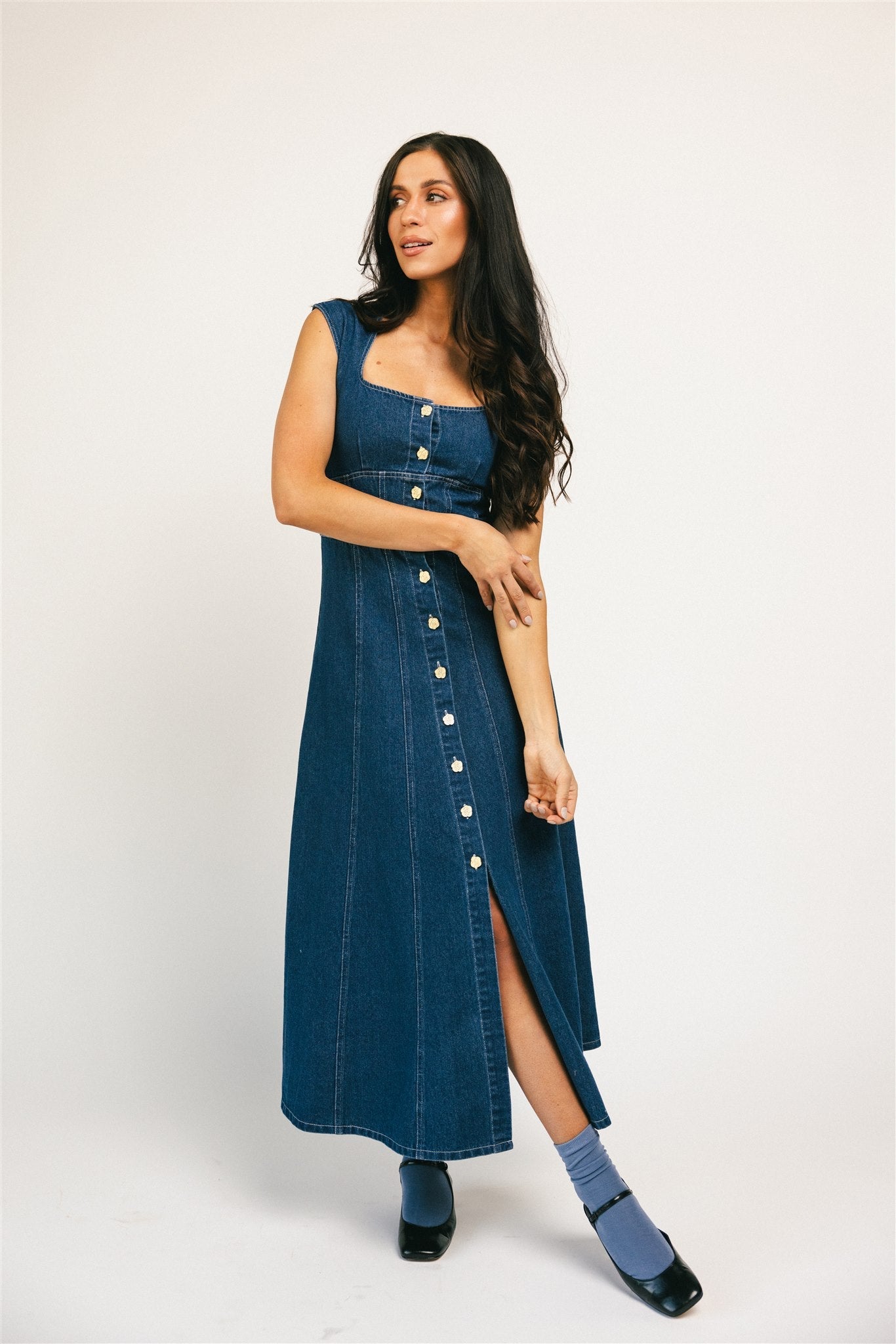 • denim // midilängd, fyrkantig halsringning, kortärmad, guldfärgade blomknappar, smalnande sömdetaljer, slits fram