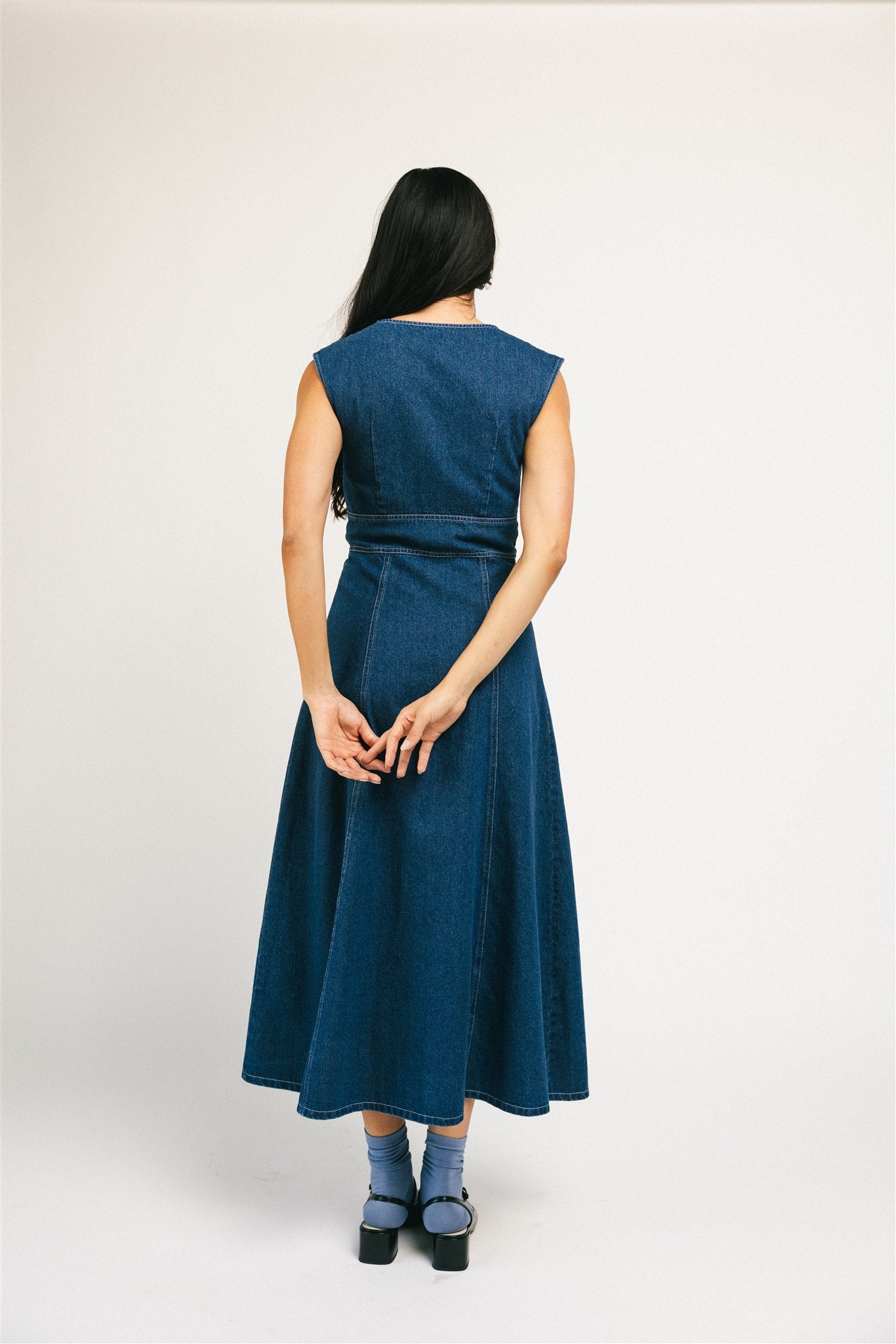 Tidlös, flörtig, + perfekt på alla sätt, denna knäppta midiklänning i denim gör allt. Den har en feminin fyrkantig halsringning med knappt synliga holkärmar, + en elegant, åtsittande midja som sitter + smickrar på alla rätt sätt. Din nya favorit för varje säsong, vi älskar den i kombination med stövlar, klackar, + allt däremellan.