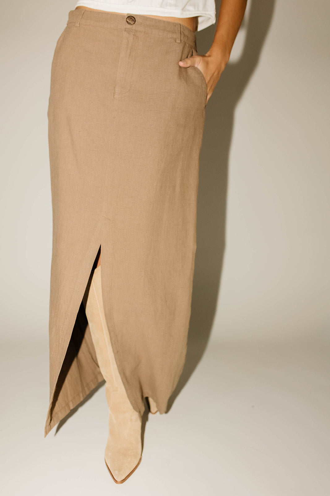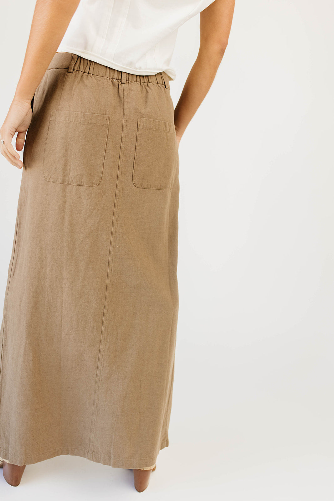 En neutral nödvändighet, denna bruna maxikjolen med slits framtill kommer att ta dig från dag till natt, säsong efter säsong. Med sin elastiska midja och cargo-inspirerade stil är det den perfekta avslappnade maxikjolen att klä upp med en blus + klackar för arbetsevenemang, eller avslappnad med en t-shirt + sneakers för helgärenden.