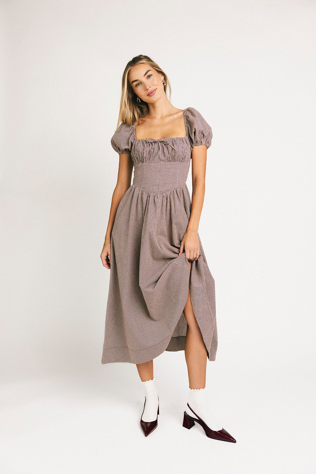 Vintage-inspirerad med en flörtig känsla, denna bruna ginghamklänning i midimodell är i princip ditt nya garderobsarv. Med sina eleganta puffärmar + feminina, åtsittande överdel är den mjuk nog att vara mångsidig, men tillräckligt sensuell för att hålla saker intressanta. Den perfekta puffärmade ginghamklänningen för familjebilder, middagsbjudningar, bröllop och mer.