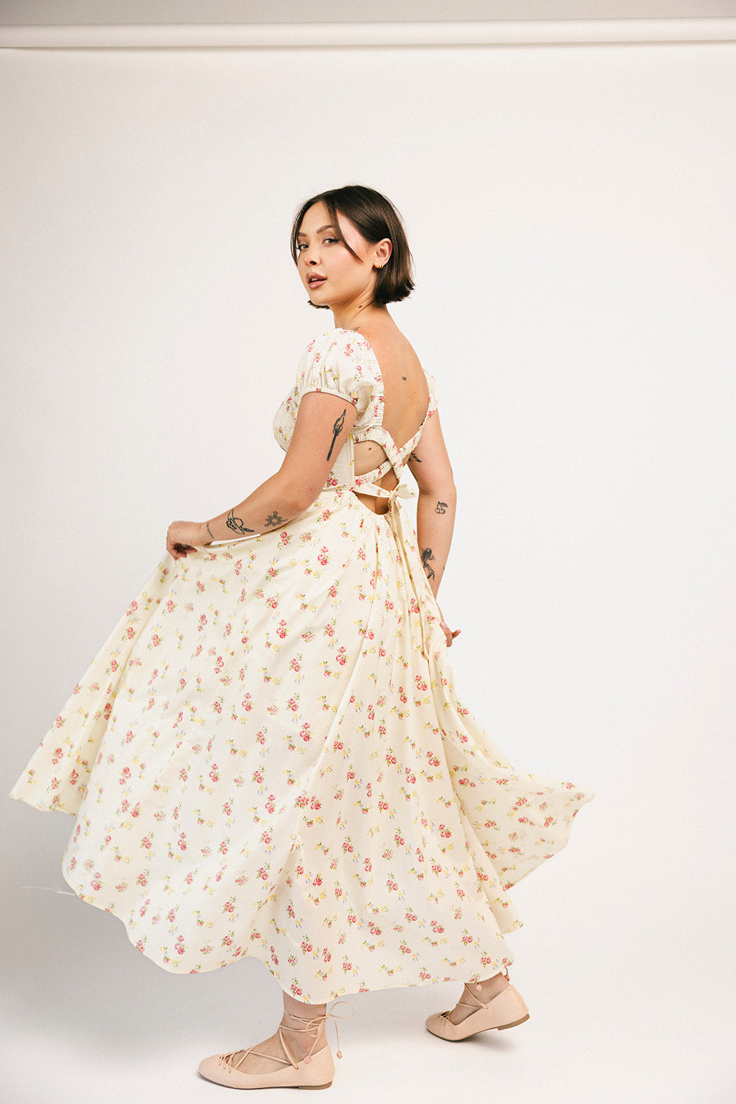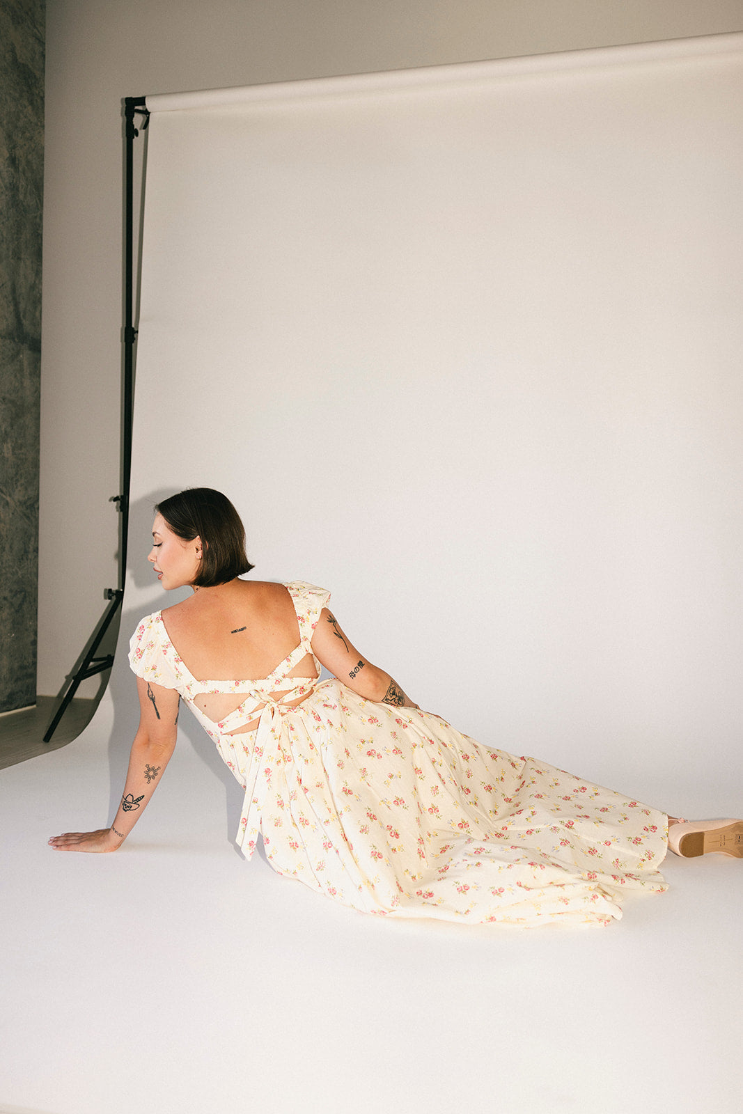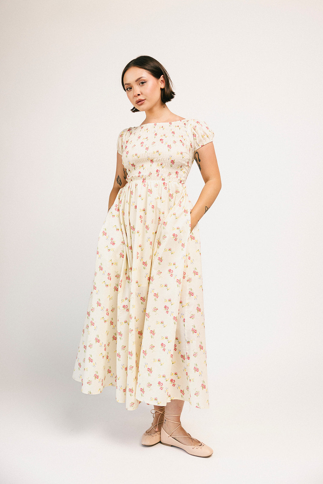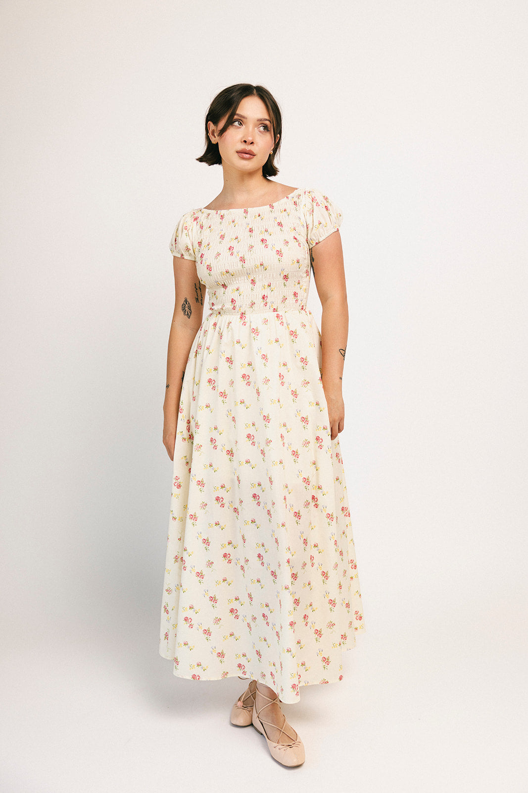 Flörtig + feminin, denna blommiga maxiklänning med kort ärm är som gjord för brunchdejter + takträffar. Med en smockad båtringning, subtila puffärmar + en djup öppen rygg, garanteras den att ge dig komplimanger. Den perfekta blommiga klänningen för vår + sommar.