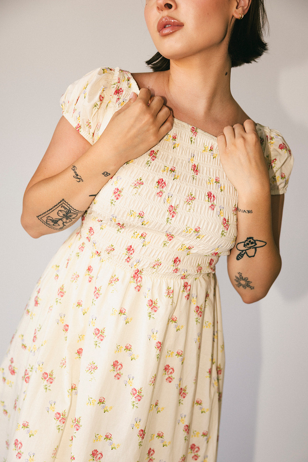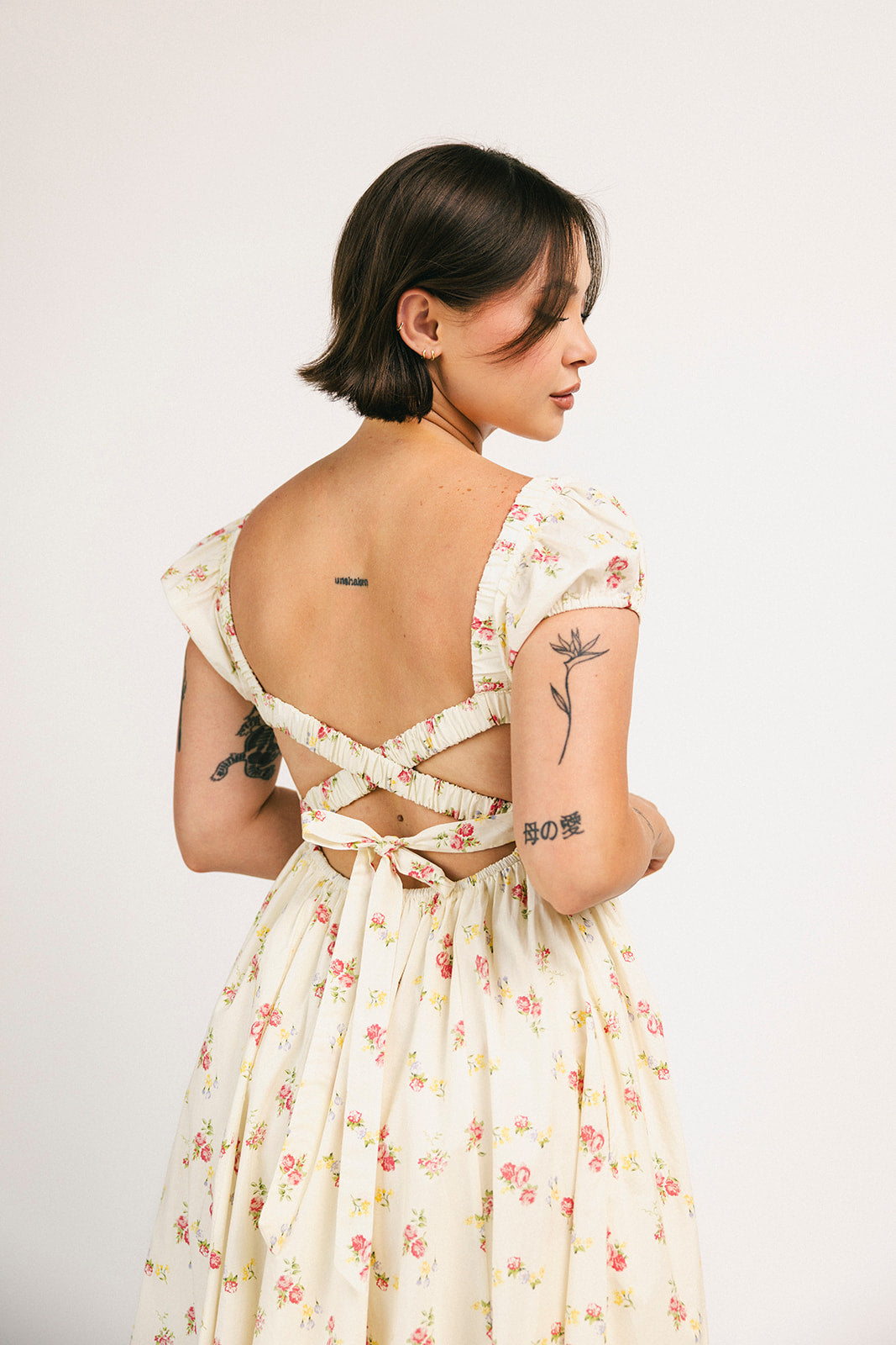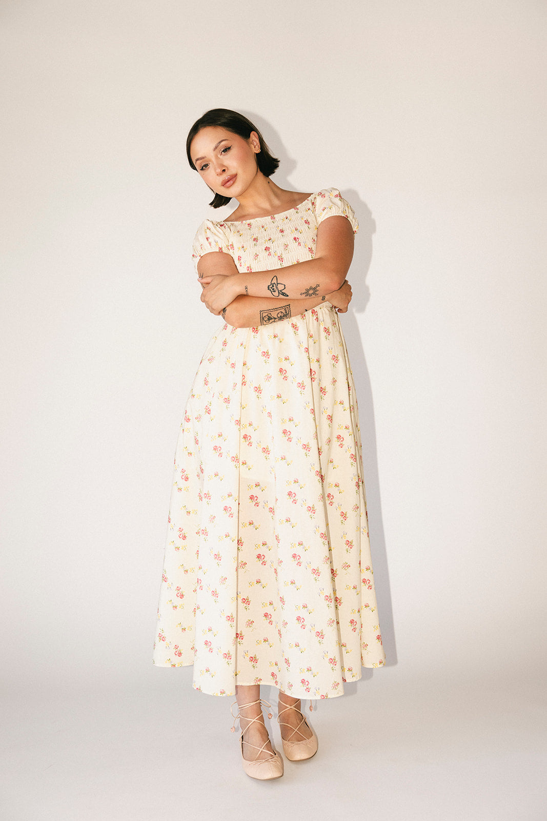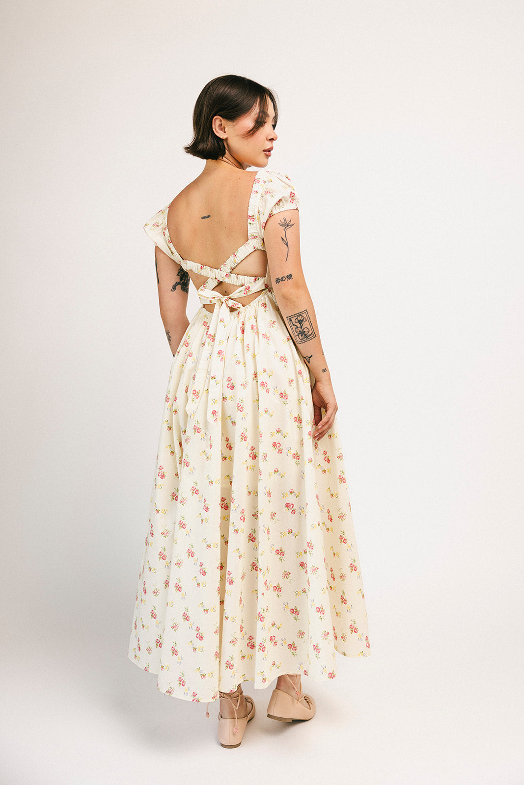 Flörtig + feminin, denna blommiga maxiklänning med kort ärm är som gjord för brunchdejter + takträffar. Med en smockad båtringning, subtila puffärmar + en djup öppen rygg, garanteras den att ge dig komplimanger. Den perfekta blommiga klänningen för vår + sommar.