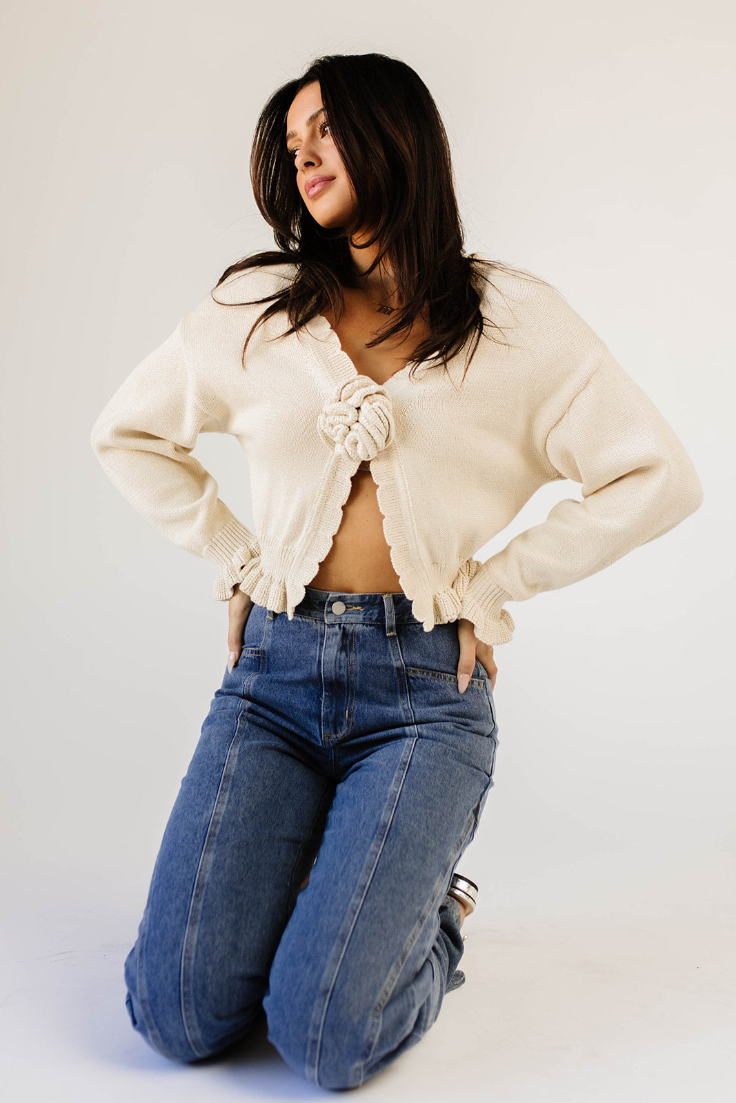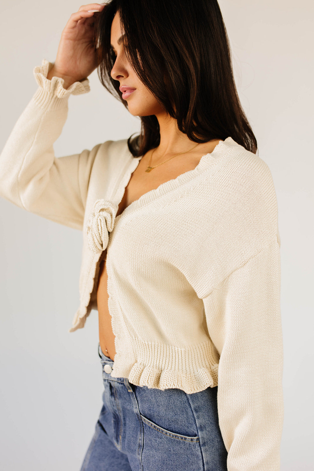 Denna kofta med öppen framtill är designad för att dra till sig uppmärksamhet och tar vilken outfit som helst till nästa nivå. Med en djärv knutknäppning och elegant volangkant är denna beskurna kofta perfekt att bära över linnen och klänningar eller att styla solo med ditt favoritpar jeans.