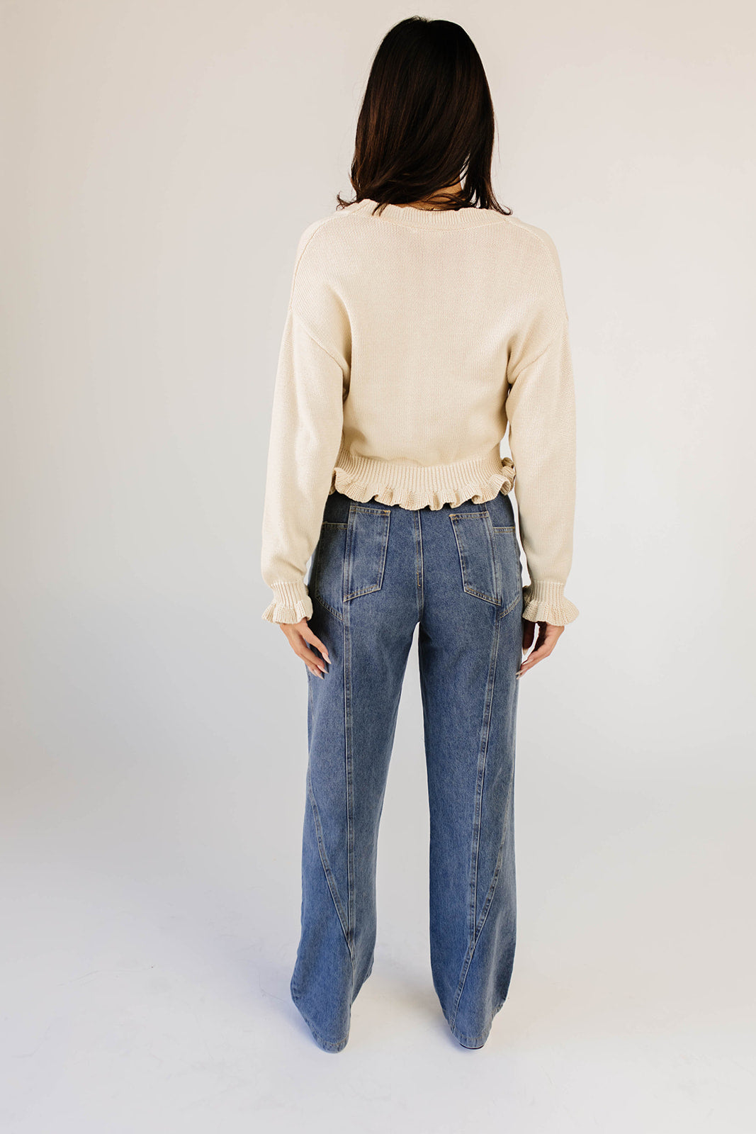 • grädde // v-ringning, tryckknappsknäppning, volangkant i nederkant + ärmslut, något beskuren