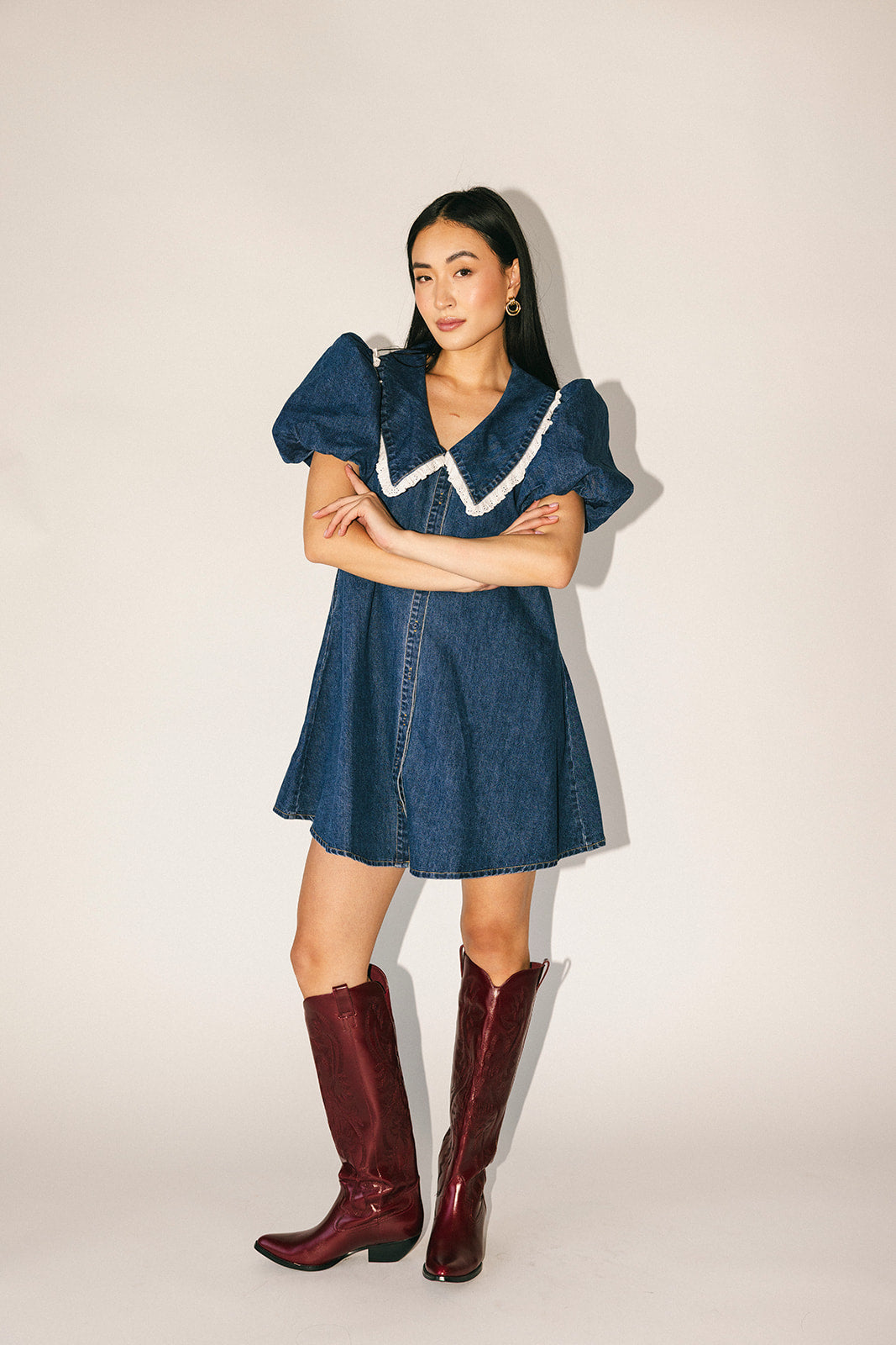 Puffärmade klänningar är lite av vår grej, + den här miniklänningen med denimkrage är inget undantag. Full av vintagekänsla, med en volangkrage, fungerande knappar och fickor (såklart). Den mörka denimen är en klassiker för varje säsong, så den tar dig från sommarbröllop till vintercocktailpartyn.