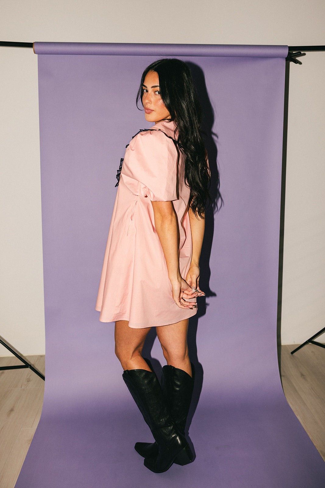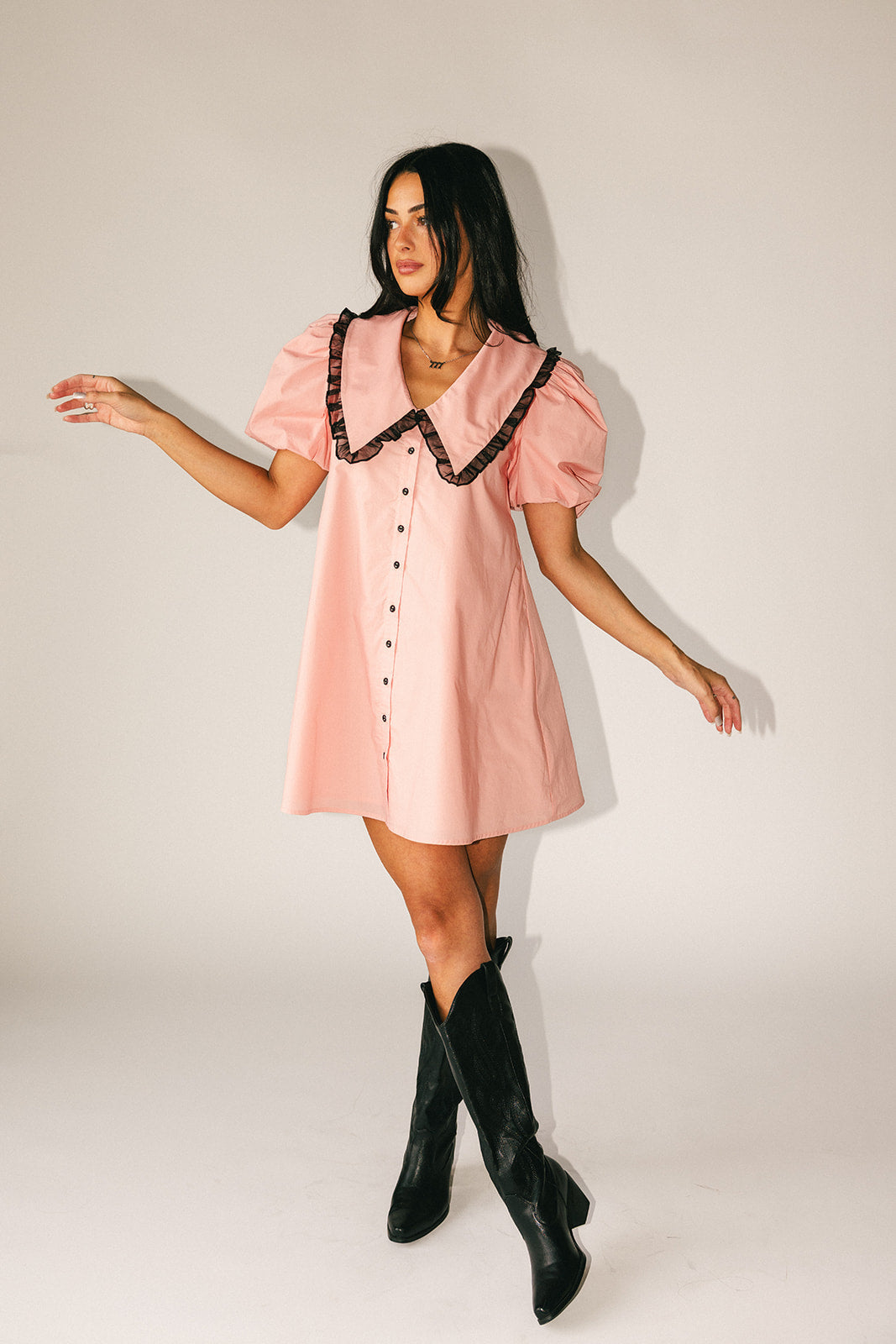 Puffärmade klänningar är lite av vår grej, + den här rosa miniklänningen med krage är inget undantag. Full av vintagekänsla, med en volangkrage, fungerande knappar och fickor (såklart). Den kontrasterande svarta kanten är en klassiker för varje säsong, så den tar dig från sommarbröllop till vintercocktailpartyn.