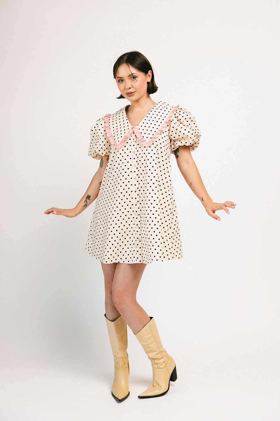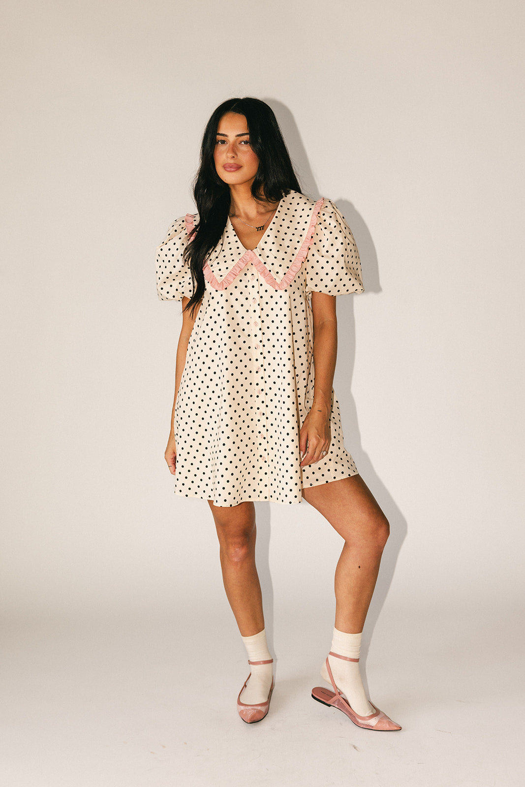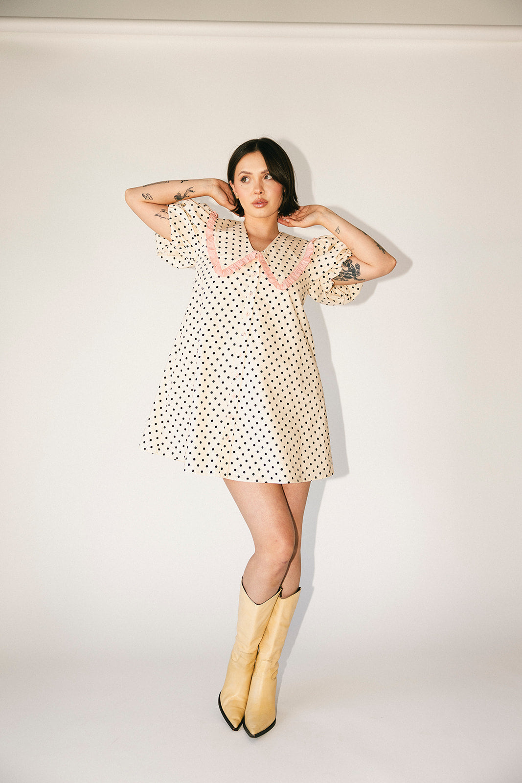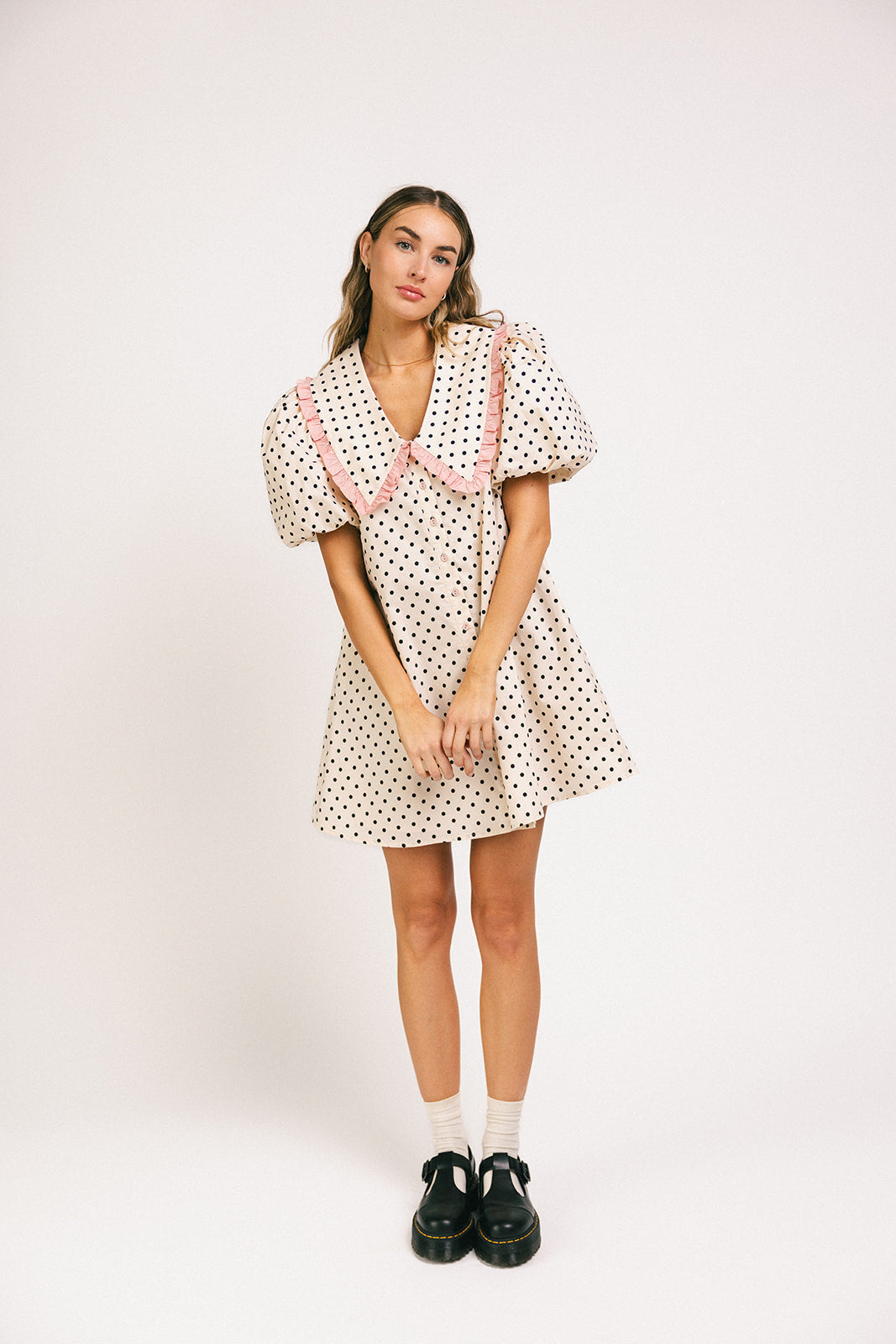 Puffärmade klänningar är lite av vår grej, + den här prickiga miniklänningen med krage är inget undantag. Full av vintagekänsla, den har en volangkrage med rosa detaljer, fungerande knappar, + fickor, (såklart). Det prickiga mönstret är en klassiker för varje säsong, så det tar dig från sommarbröllop till vintercocktailpartyn.