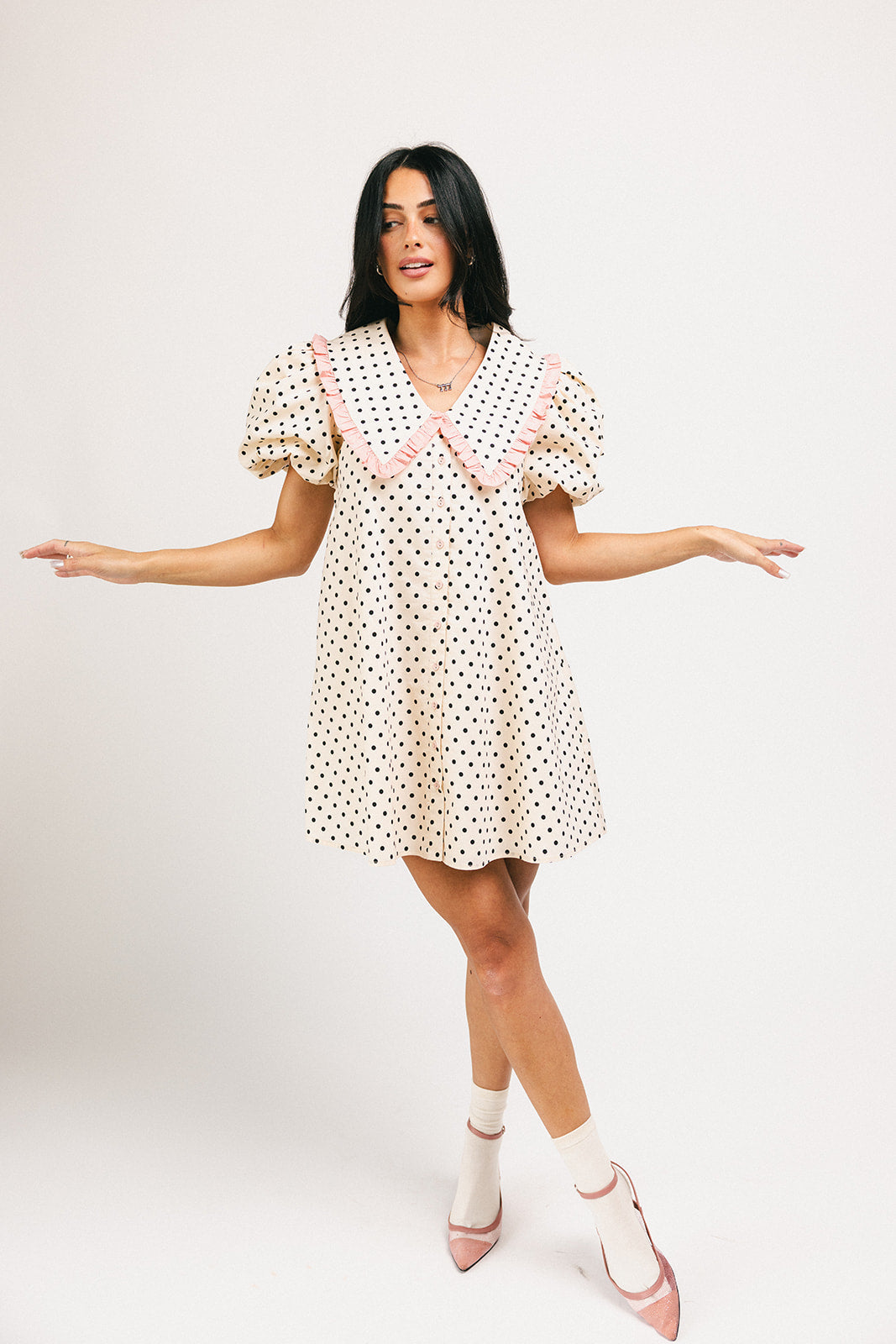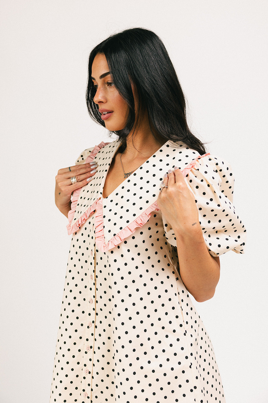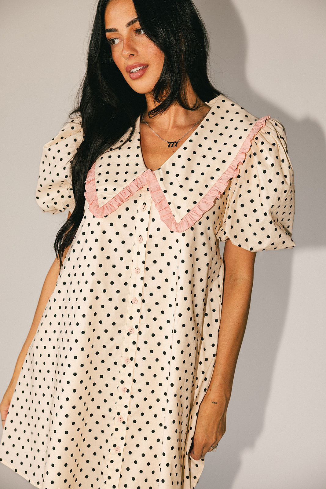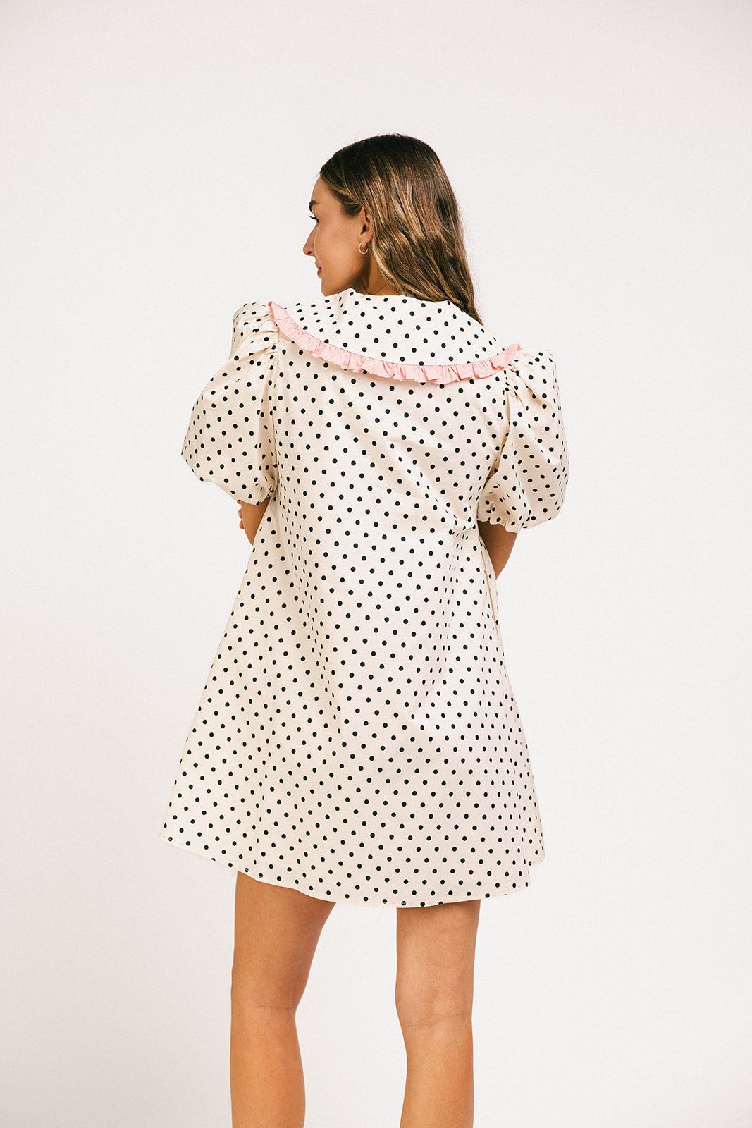 Puffärmade klänningar är lite av vår grej, + den här prickiga miniklänningen med krage är inget undantag. Full av vintagekänsla, den har en volangkrage med rosa detaljer, fungerande knappar, + fickor, (såklart). Det prickiga mönstret är en klassiker för varje säsong, så det tar dig från sommarbröllop till vintercocktailpartyn.
