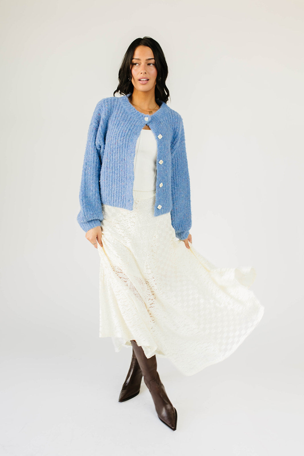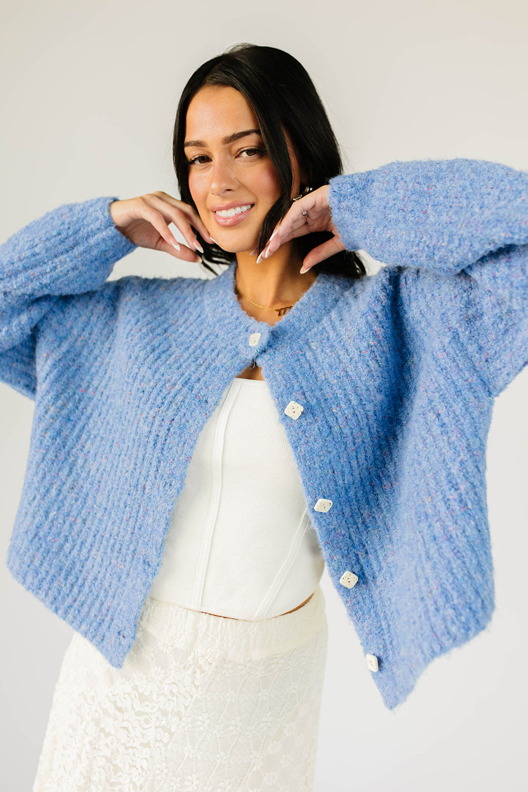Klädekvivalenten till en kram, denna mysiga blå stickade kofta är lyxigt tjock + härligt lös. Med sin boxiga, lätt beskurna siluett är det den perfekta tröjan att bära som ett lager eller styla solo med vilken outfit som helst.