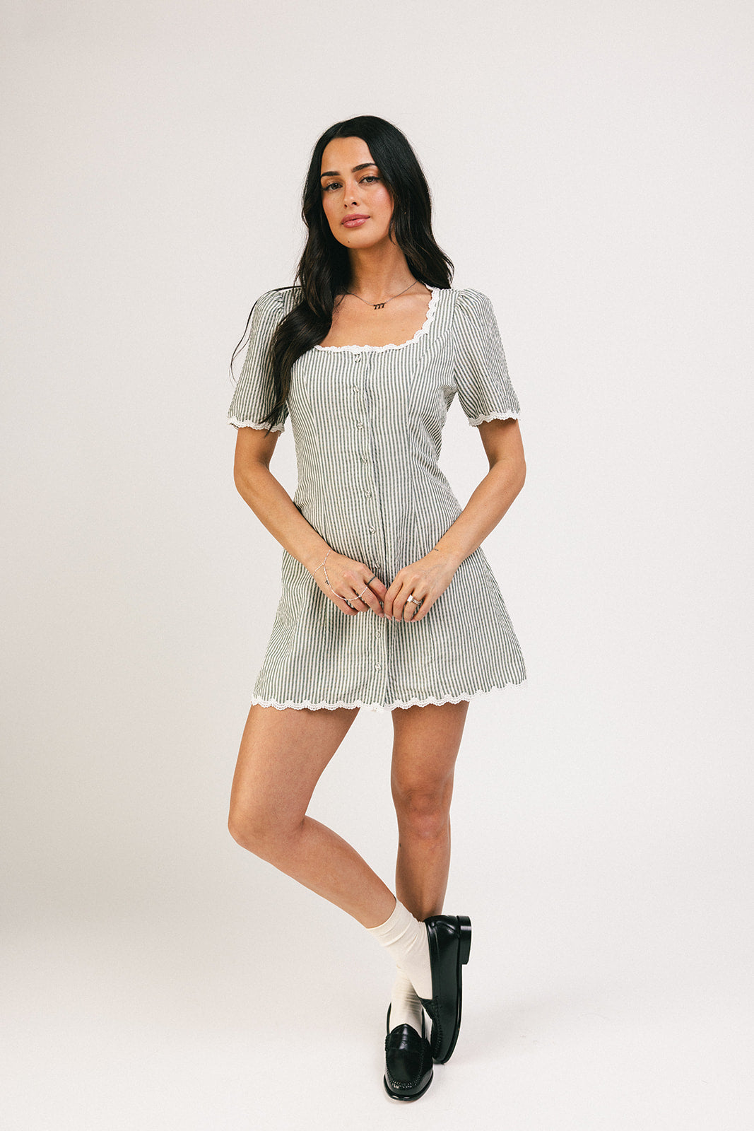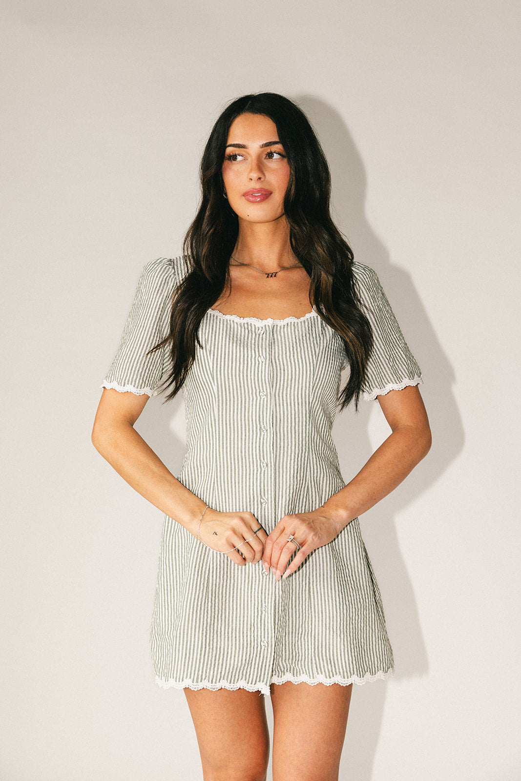 En retroinspirerad miniklänning med en häpnadsväckande silhuett, med dämpade gröna ränder och vågiga öljetter i spets. Garanterat att få oändliga komplimanger, den perfekta miniklänningen med knappar för brunchdejter, tjejkvällar och allt däremellan.
