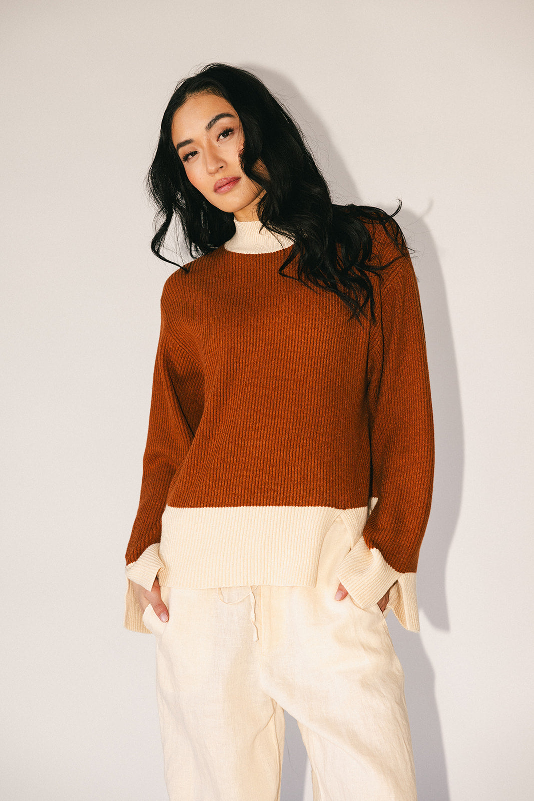 Ge vilken outfit som helst en elegant touch med denna krämfärgade + rostfärgade mockup-tröja. Lite slapp + superchic, den perfekta tröjan att klä upp med en minikjol + stövlar för kaffedejter, eller med jeans + sneakers för avslappnade fester.