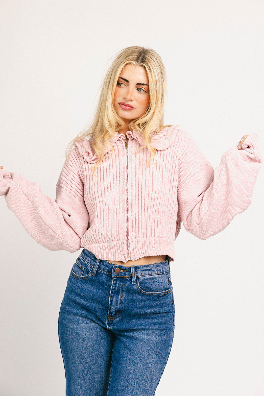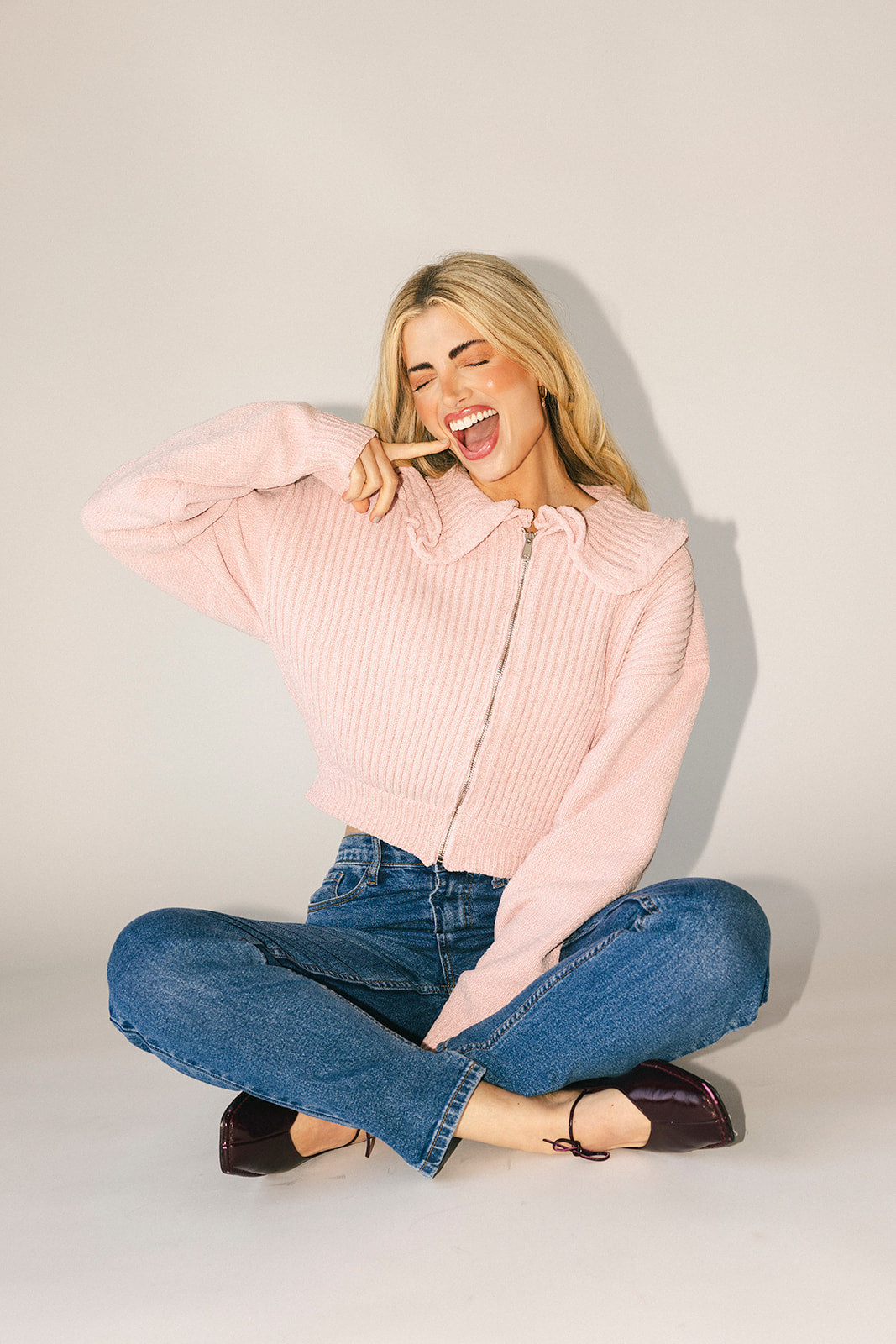 Söt + mysig, denna rosa stickade tröja med dragkedja är full av klädmöjligheter. Den har nedsänkta axlar, en överdimensionerad krage, + den mysigaste och avslappnade passformen. Den perfekta tröjan med dragkedja att bära som lager på lager eller som solo, säsong efter säsong.