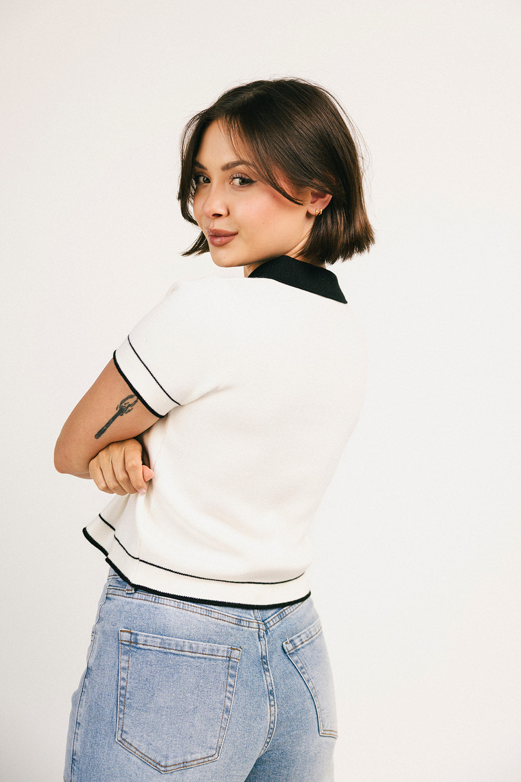 Förhöj vilken avslappnad outfit som helst med denna eleganta svartvita topp med knappar. Med eleganta monokromatiska detaljer och en lätt beskuren silhuett är det en topp som passar både för både "business casual" och "tjejkvällar". Klä upp den med en minikjol + klackar, eller avslappnat med denim + plattskor.