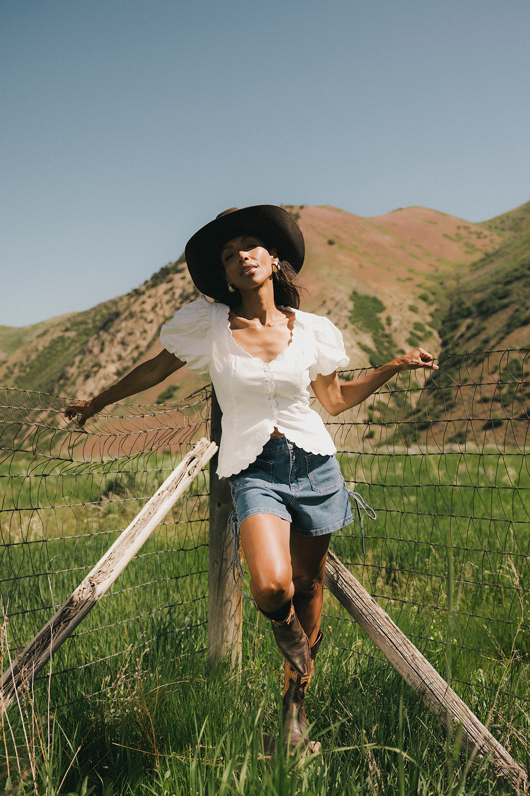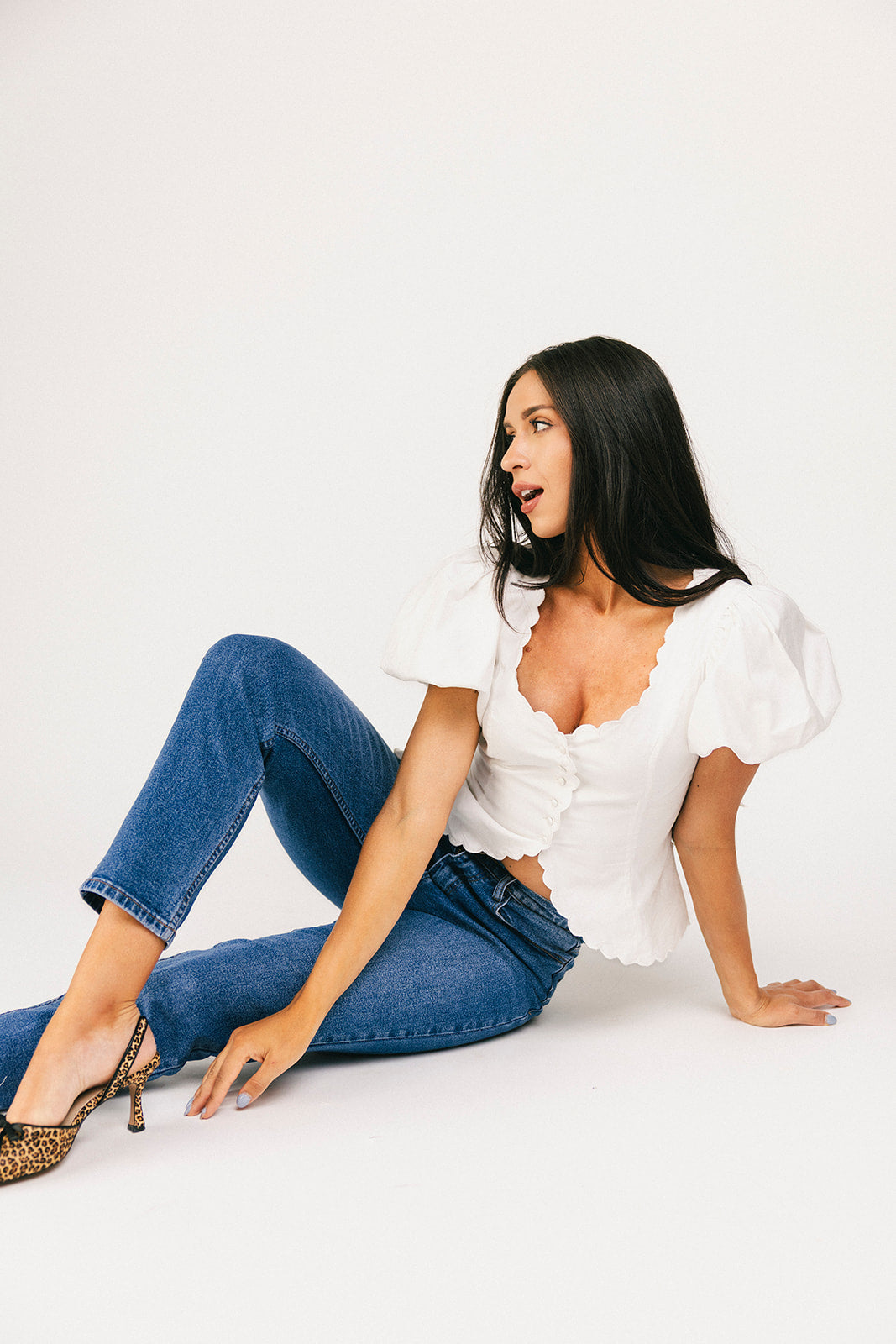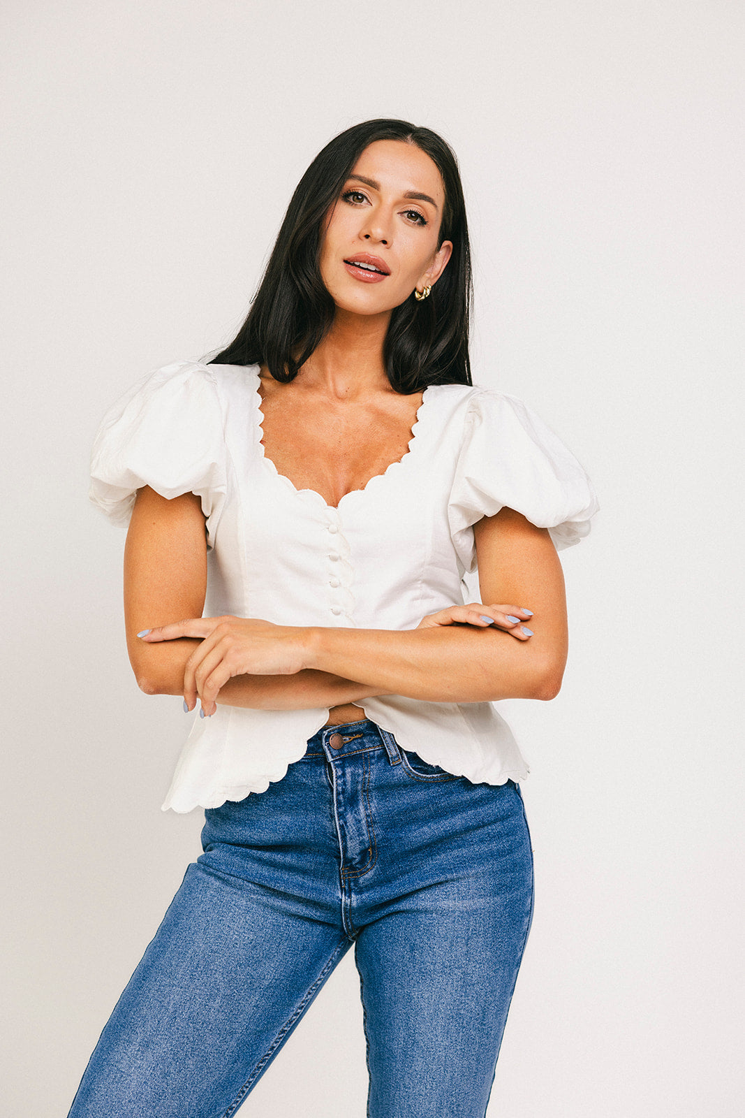Supersöt + lite farlig, den här vita puffärmade toppen lyfter direkt vilken outfit som helst. Med sitt korsettliknande livstycke + vågiga detaljer formar den din kropp på alla rätt ställen. Vi älskar att matcha den med byxor + klackar för fina bruncher, eller jeans + lågskor för avslappnade dejtkvällar.