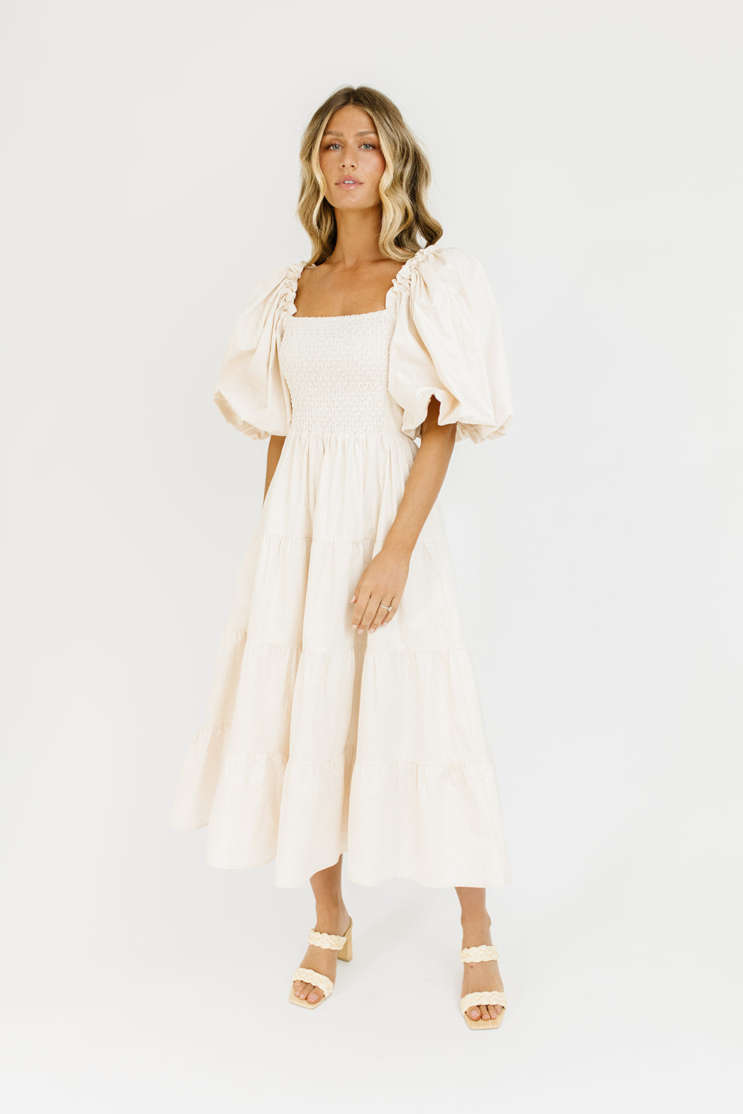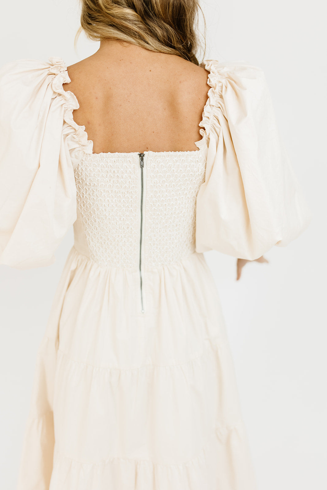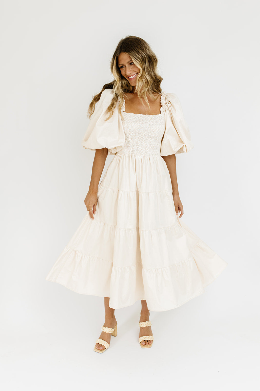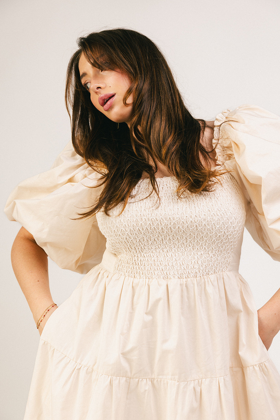 • cremefärgad // midilängd, fyrkantig halsringning, smockad, puffärm, fickor, dragkedja bak