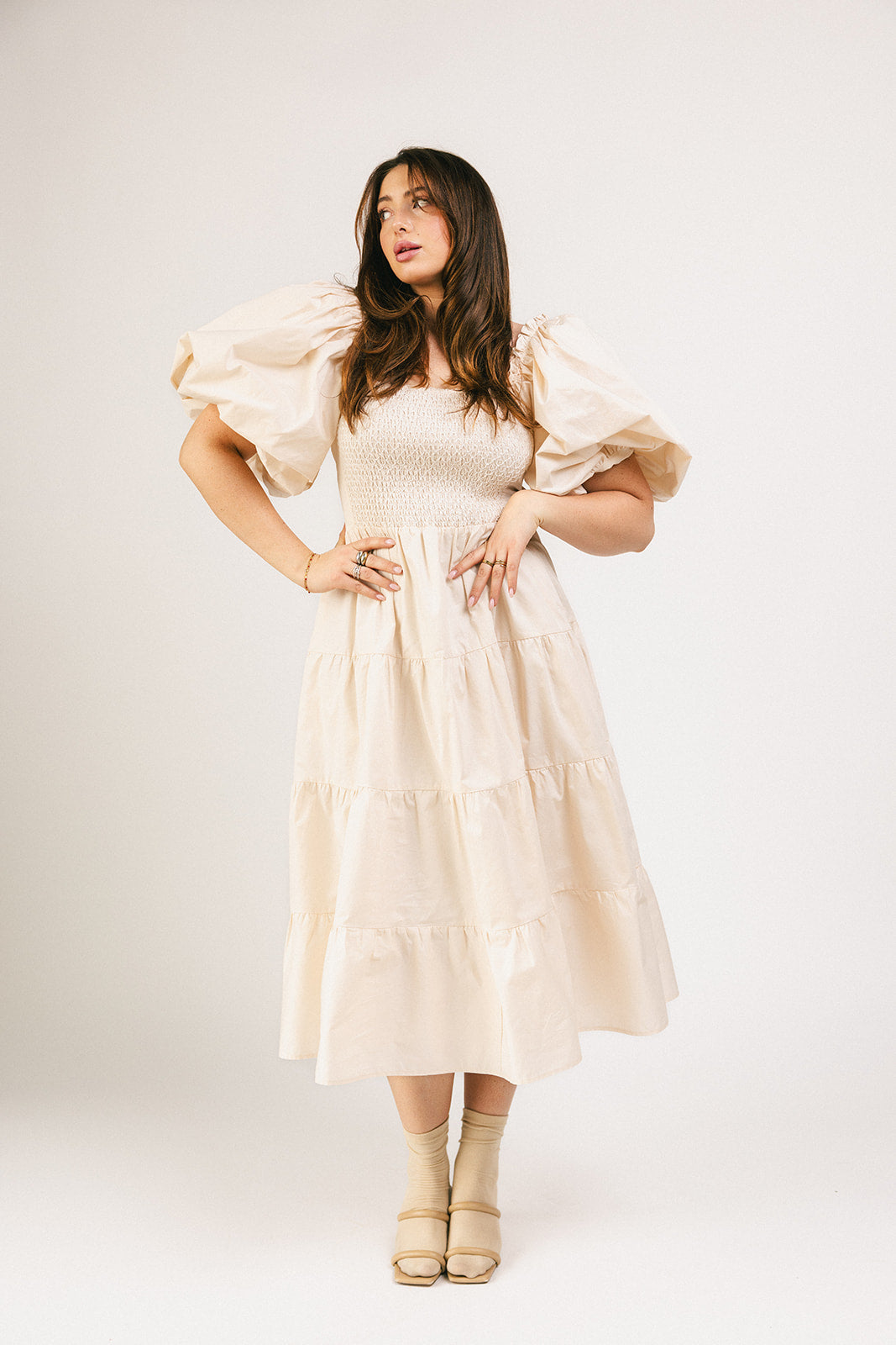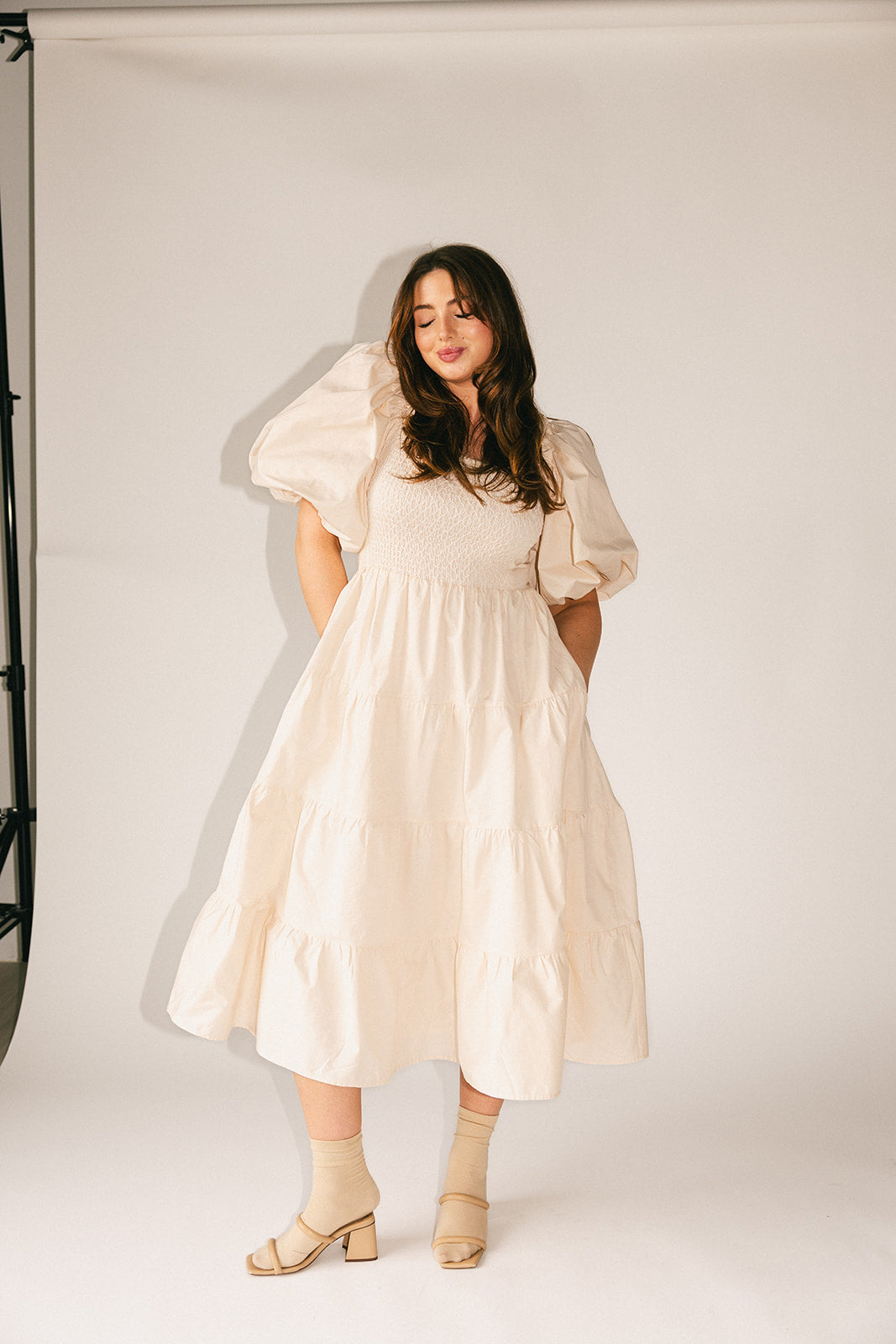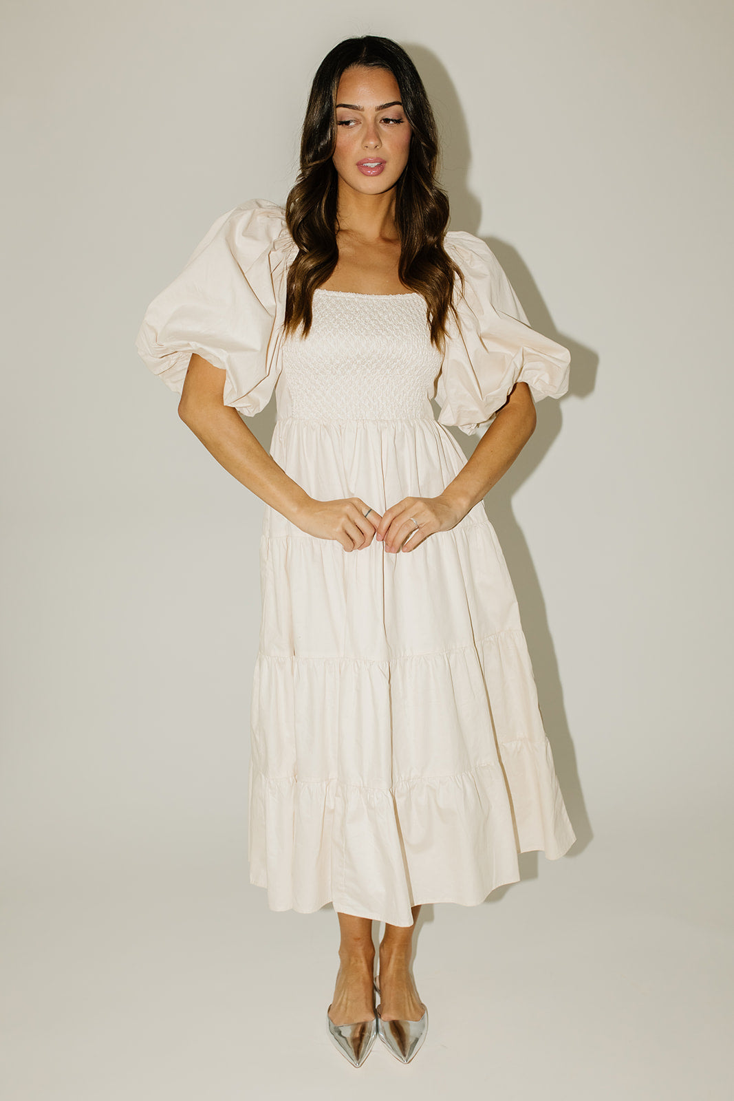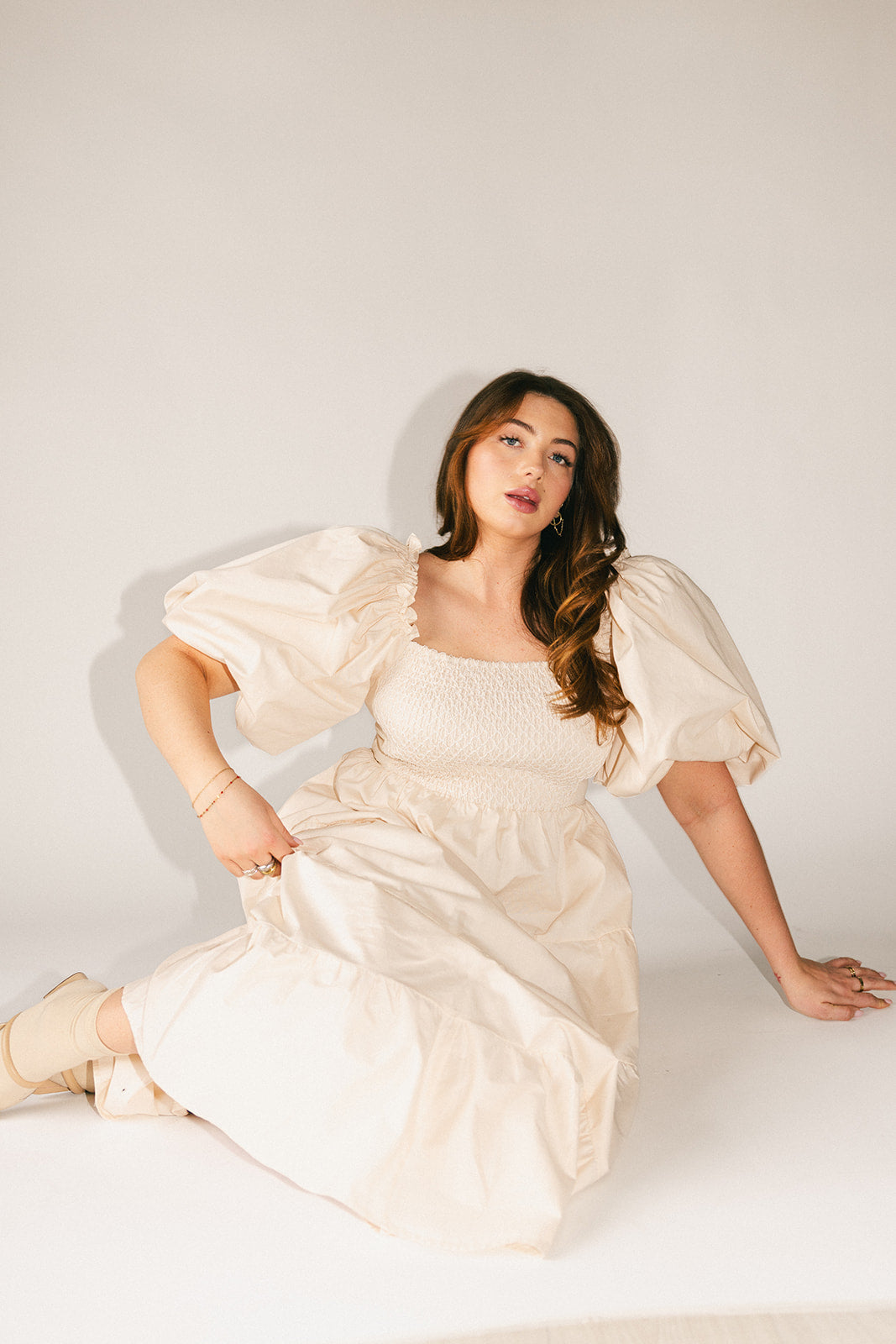 • cremefärgad // midilängd, fyrkantig halsringning, smockad, puffärm, fickor, dragkedja bak