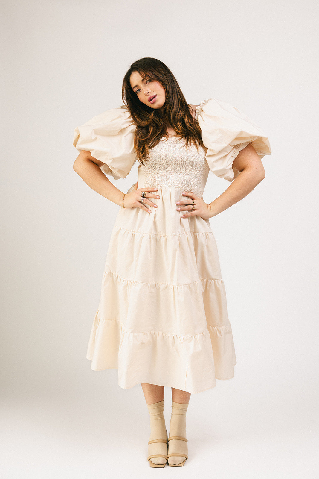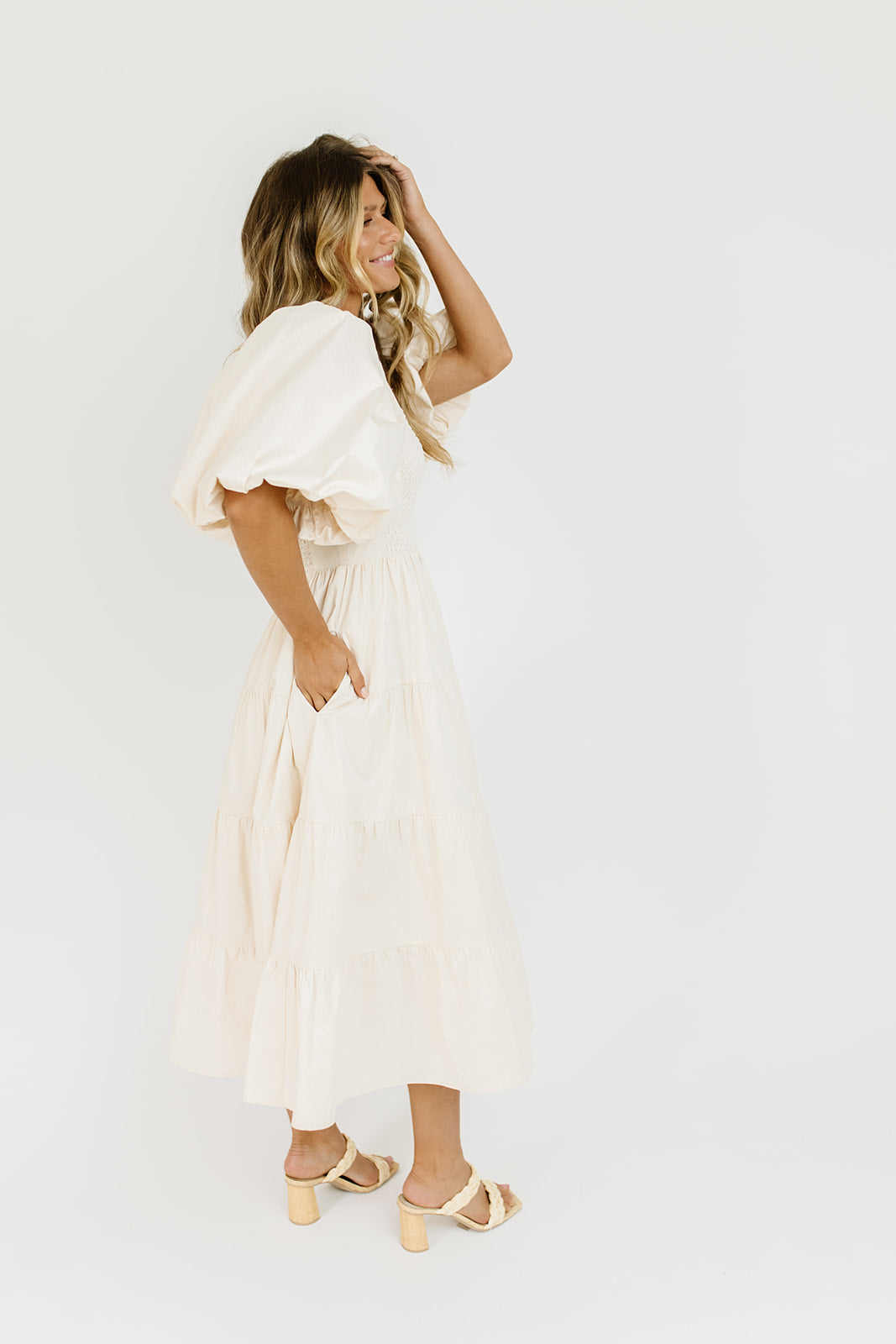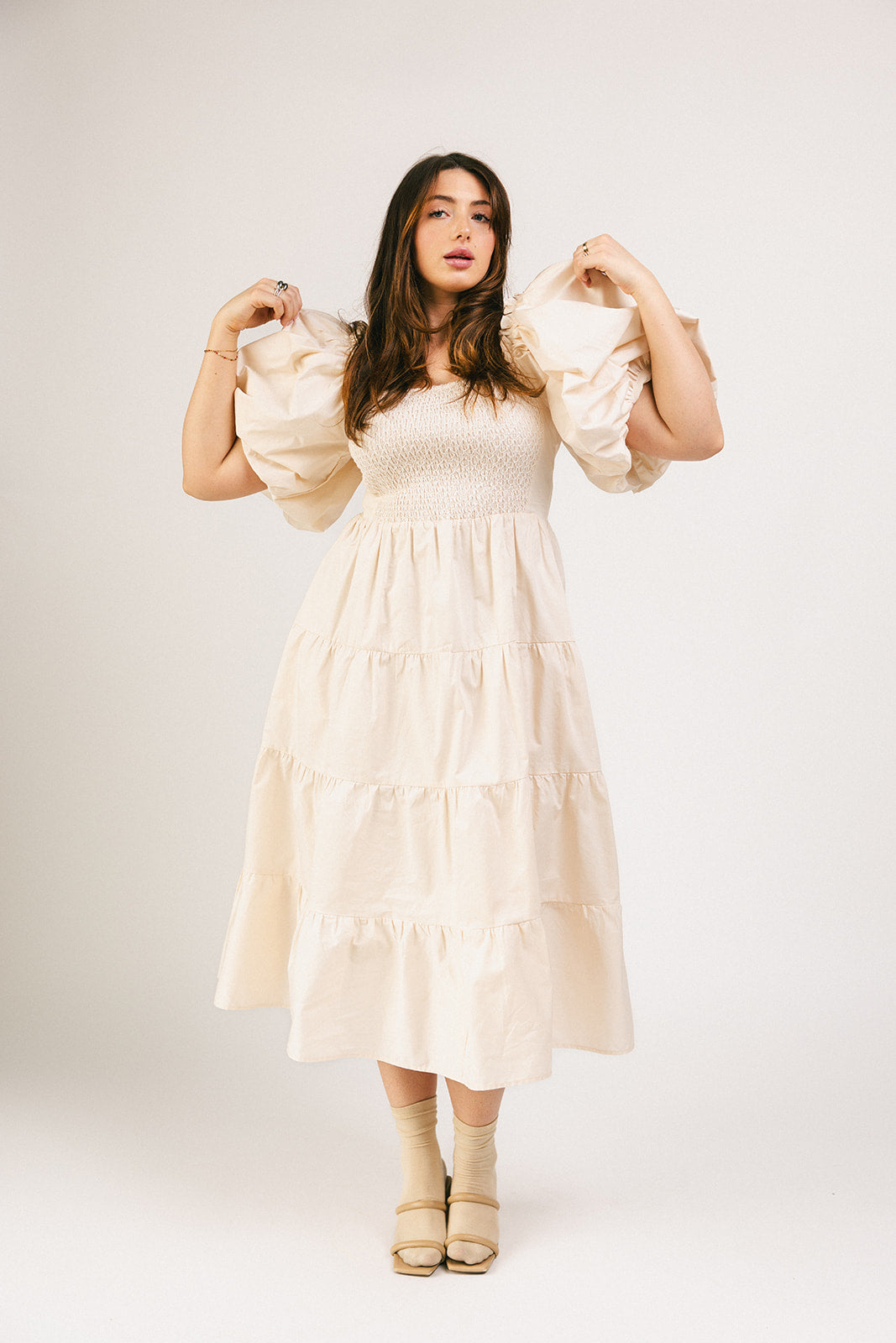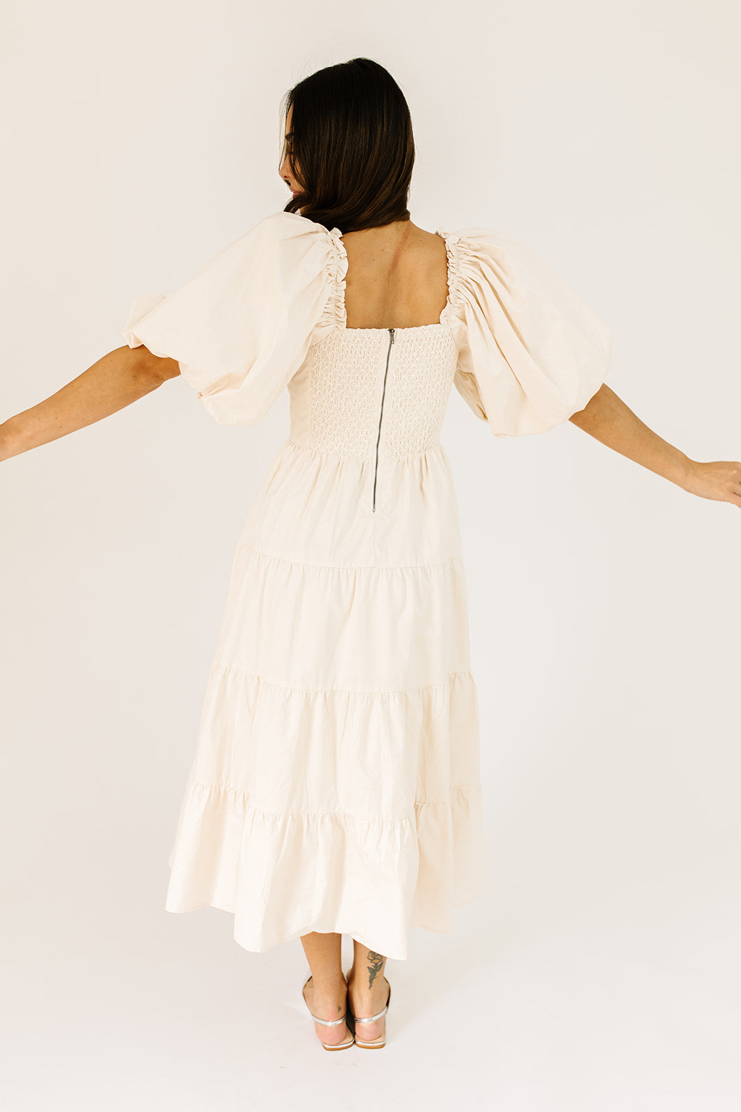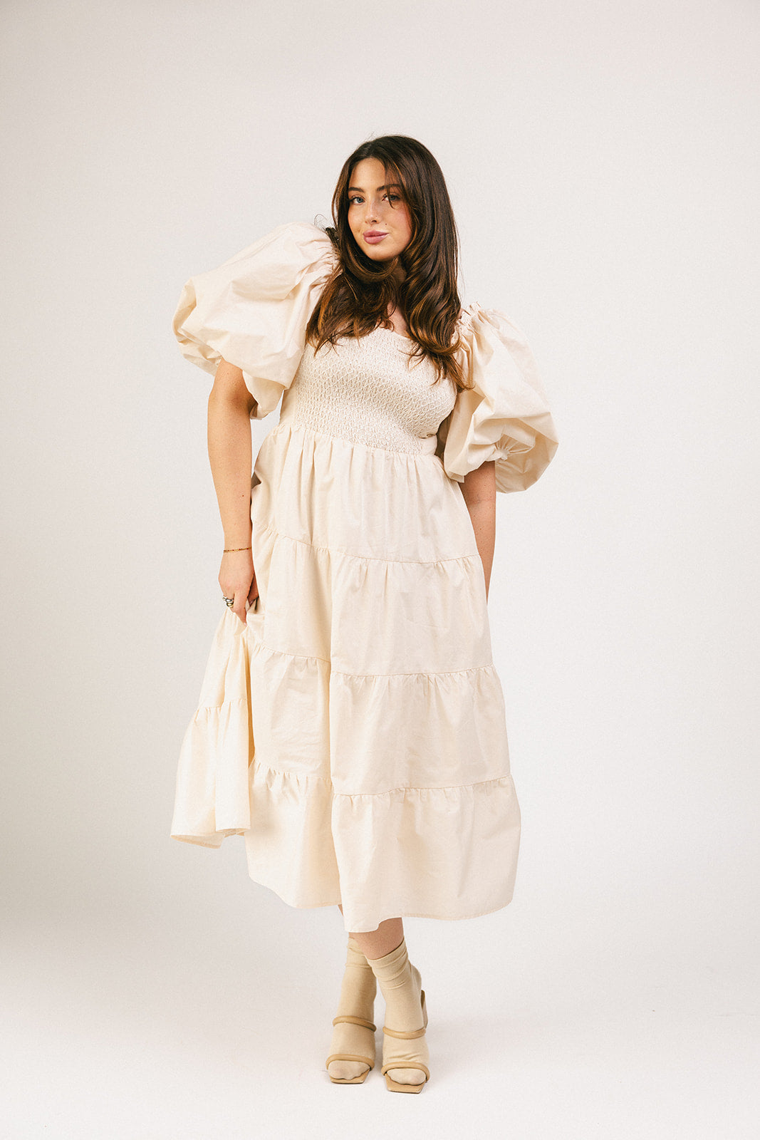 • cremefärgad // midilängd, fyrkantig halsringning, smockad, puffärm, fickor, dragkedja bak