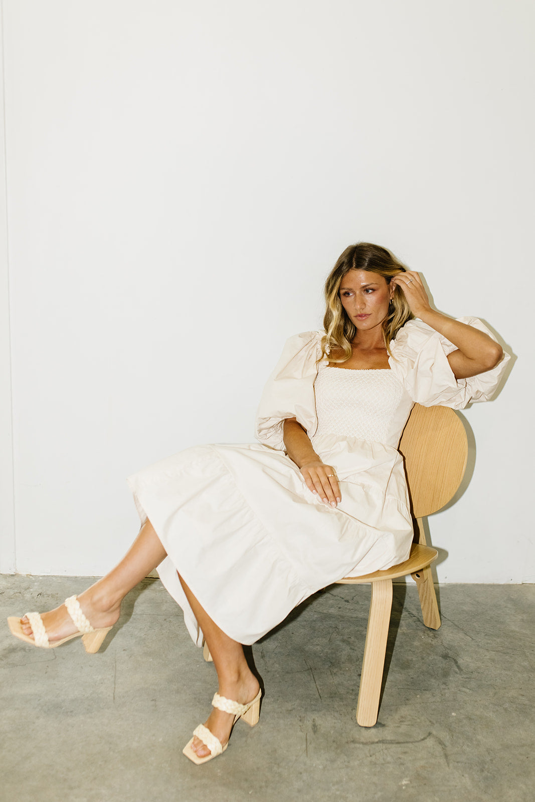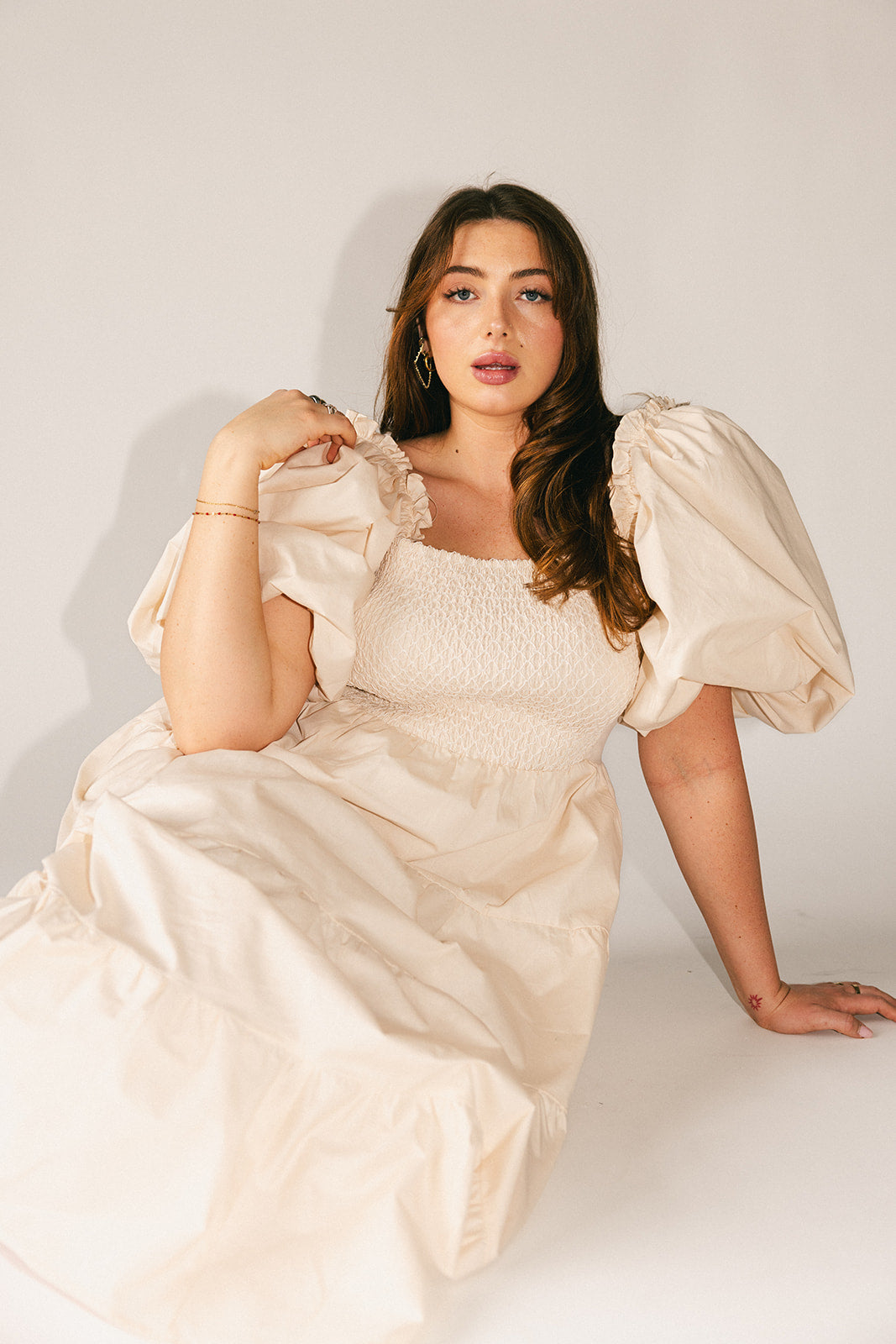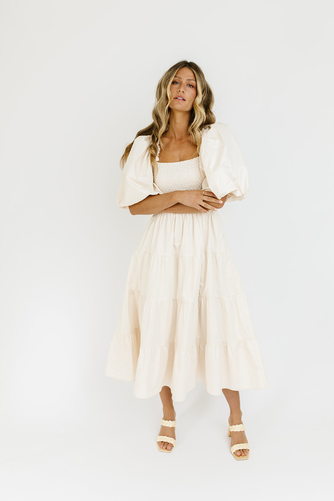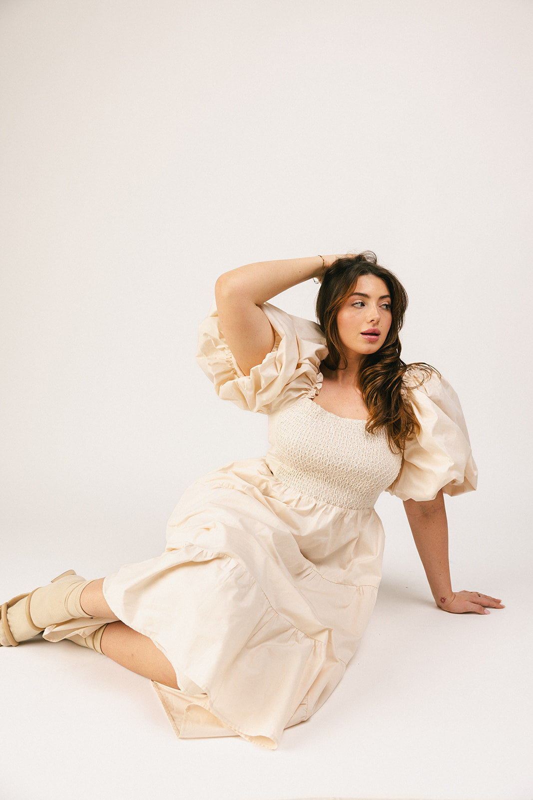 • cremefärgad // midilängd, fyrkantig halsringning, smockad, puffärm, fickor, dragkedja bak