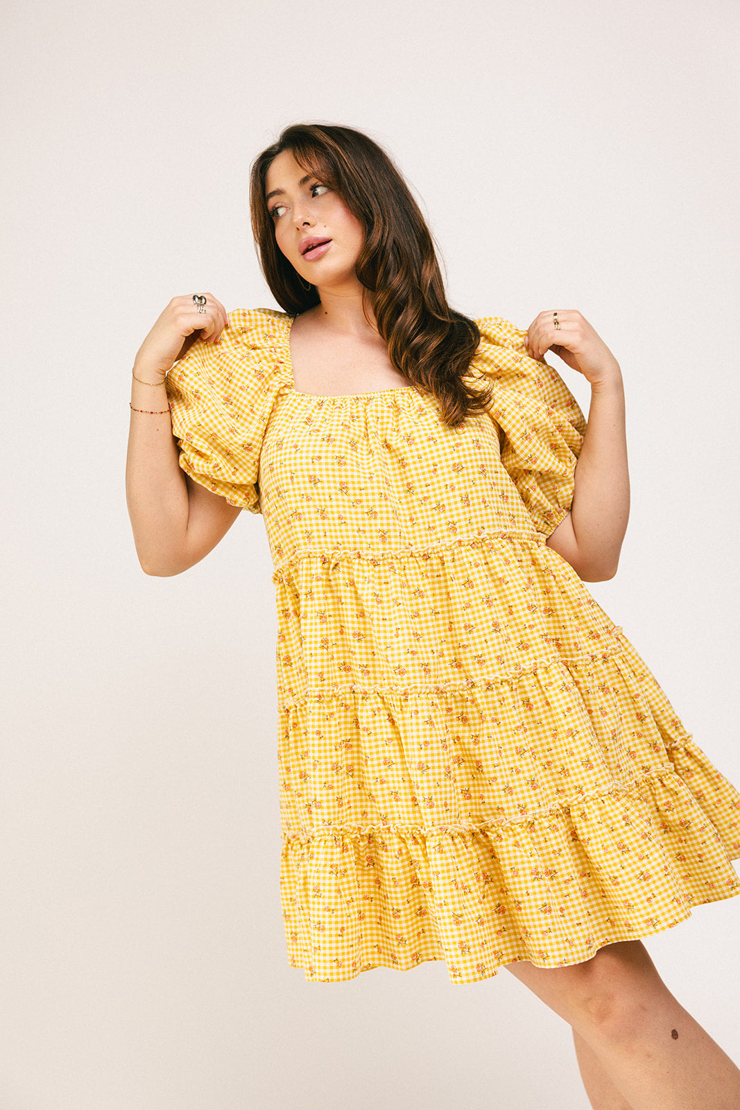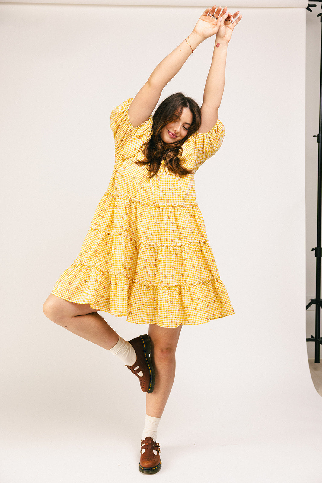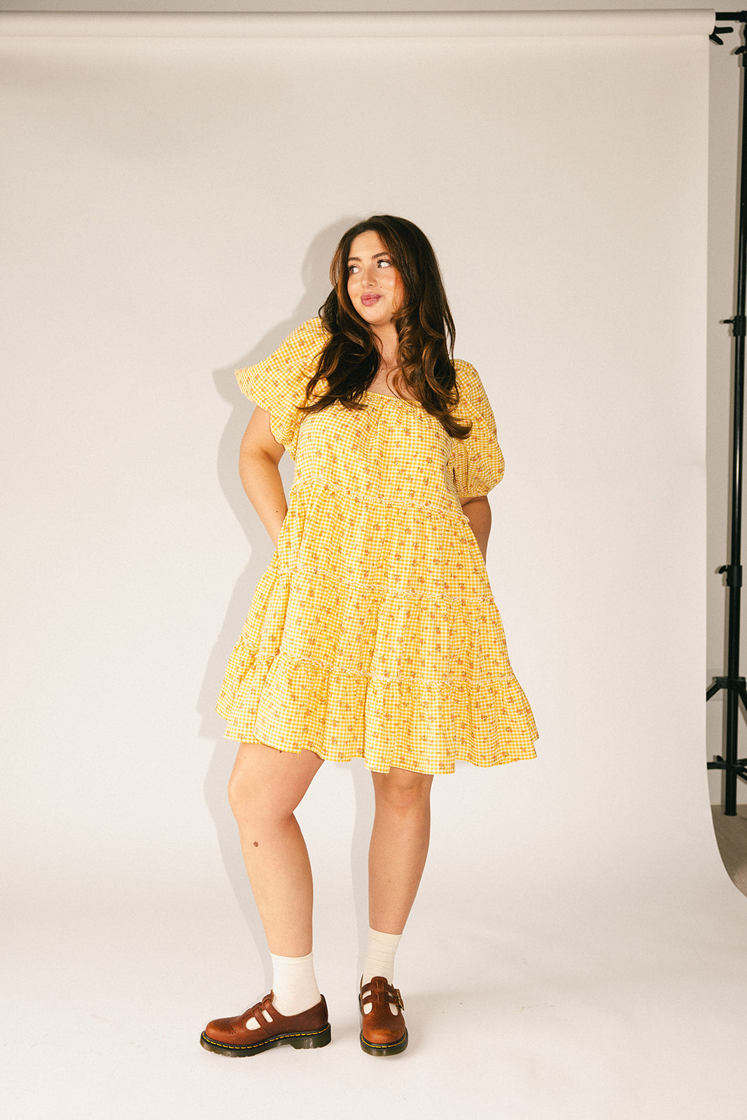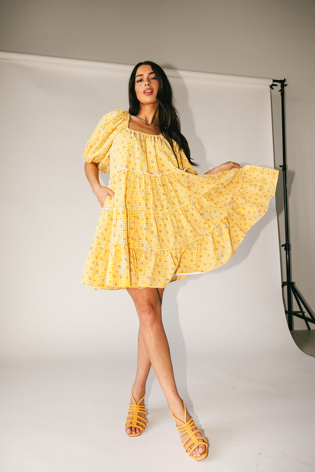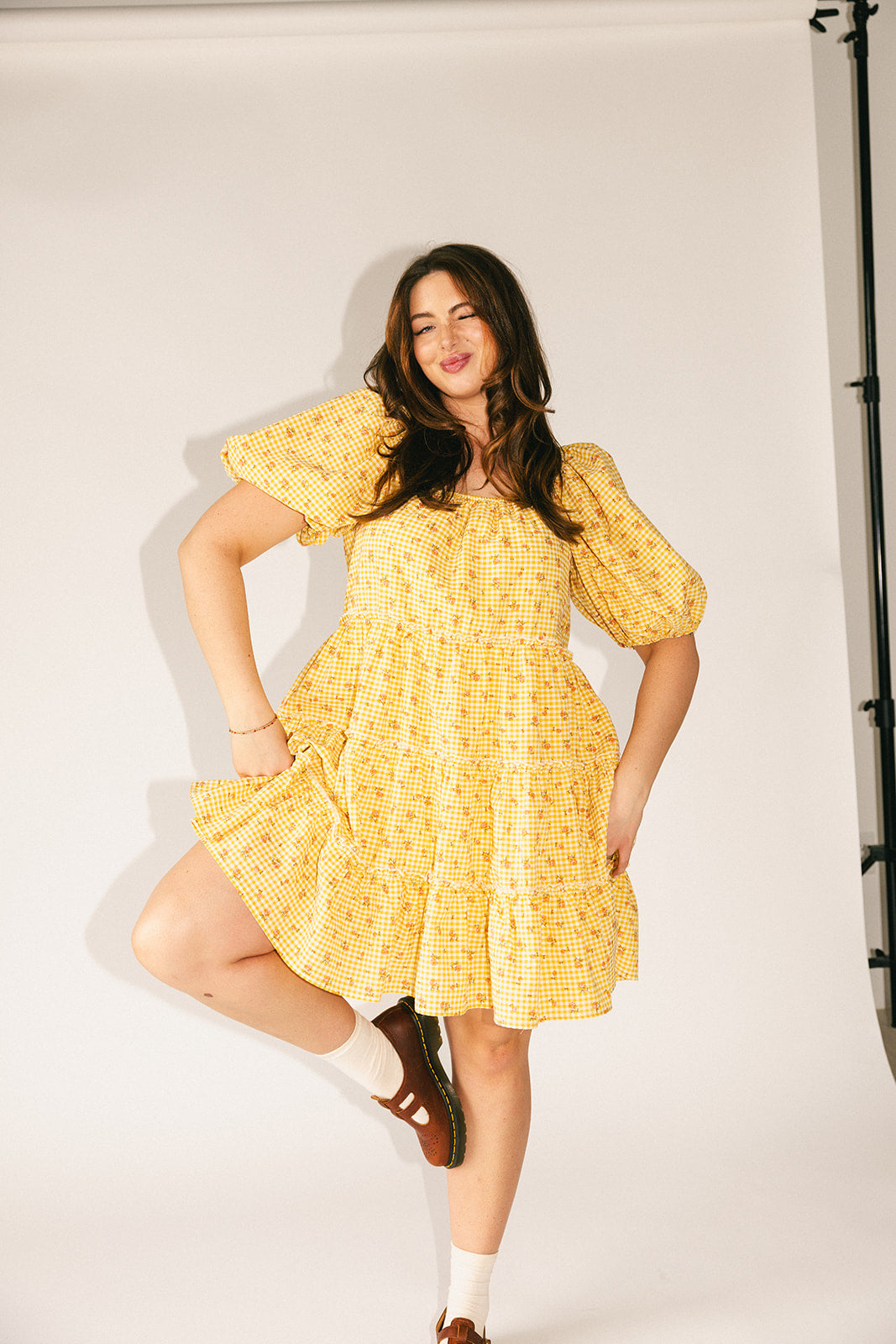 Från familjebilder till helgärenden, vår exklusiva korta Daymaker-klänning från Zoco gör allt. Tillverkad i ett sött gult ginghammönster med blommiga detaljer, har denna puffärmade klänning samma avslappnade känsla som vår ursprungliga Daymaker-klänning, men med en extra flörtig stil. Den stretchiga rundade halsringningen + shift-silhuetten erbjuder massor av mångsidighet, så det är den perfekta böljande miniklänningen för varje tillfälle.