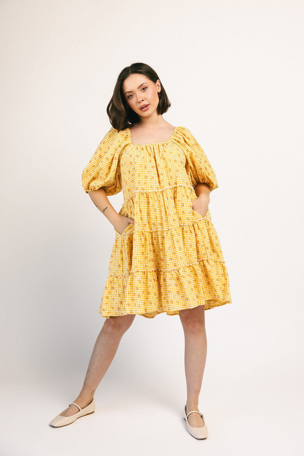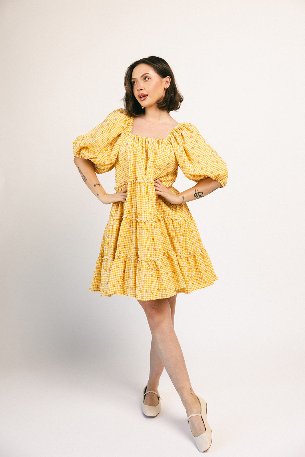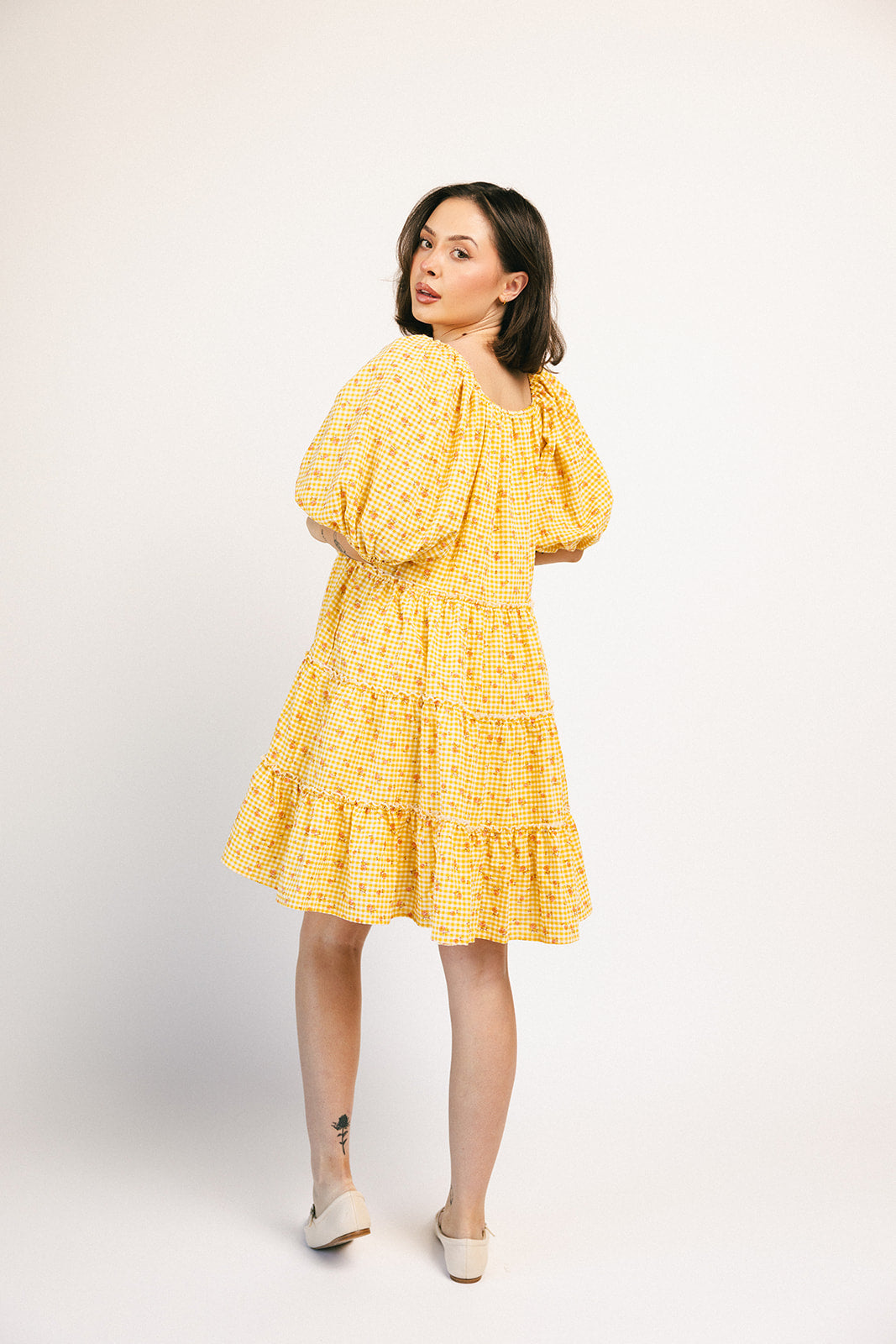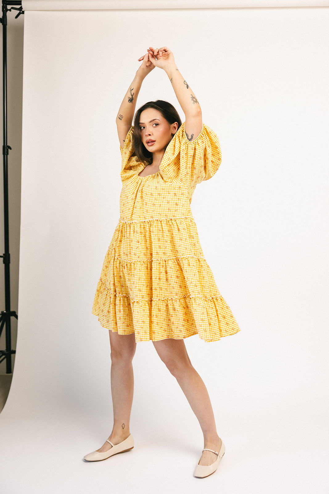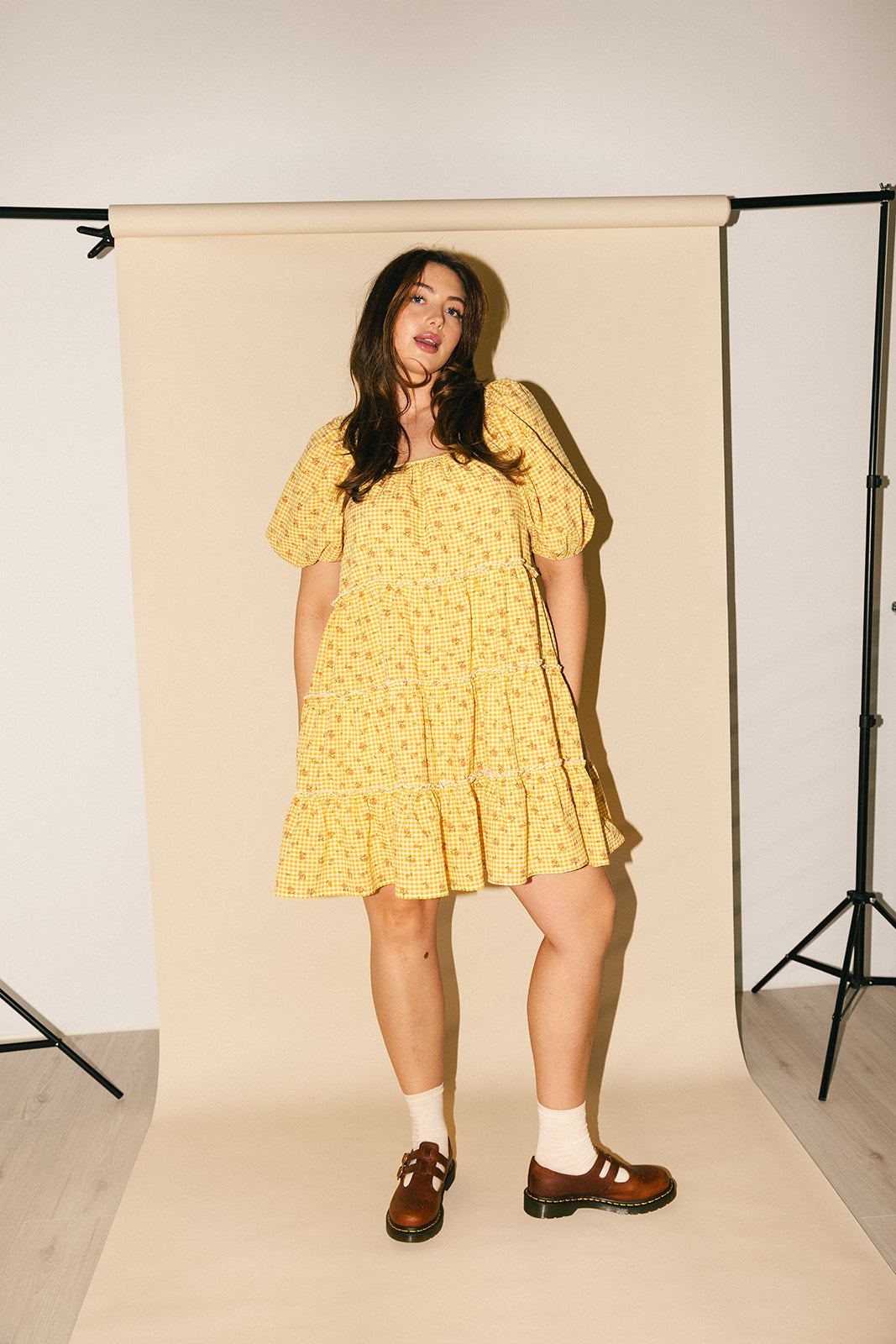 Från familjebilder till helgärenden, vår exklusiva korta Daymaker-klänning från Zoco gör allt. Tillverkad i ett sött gult ginghammönster med blommiga detaljer, har denna puffärmade klänning samma avslappnade känsla som vår ursprungliga Daymaker-klänning, men med en extra flörtig stil. Den stretchiga rundade halsringningen + shift-silhuetten erbjuder massor av mångsidighet, så det är den perfekta böljande miniklänningen för varje tillfälle.