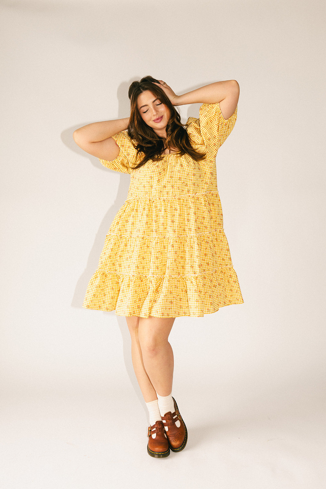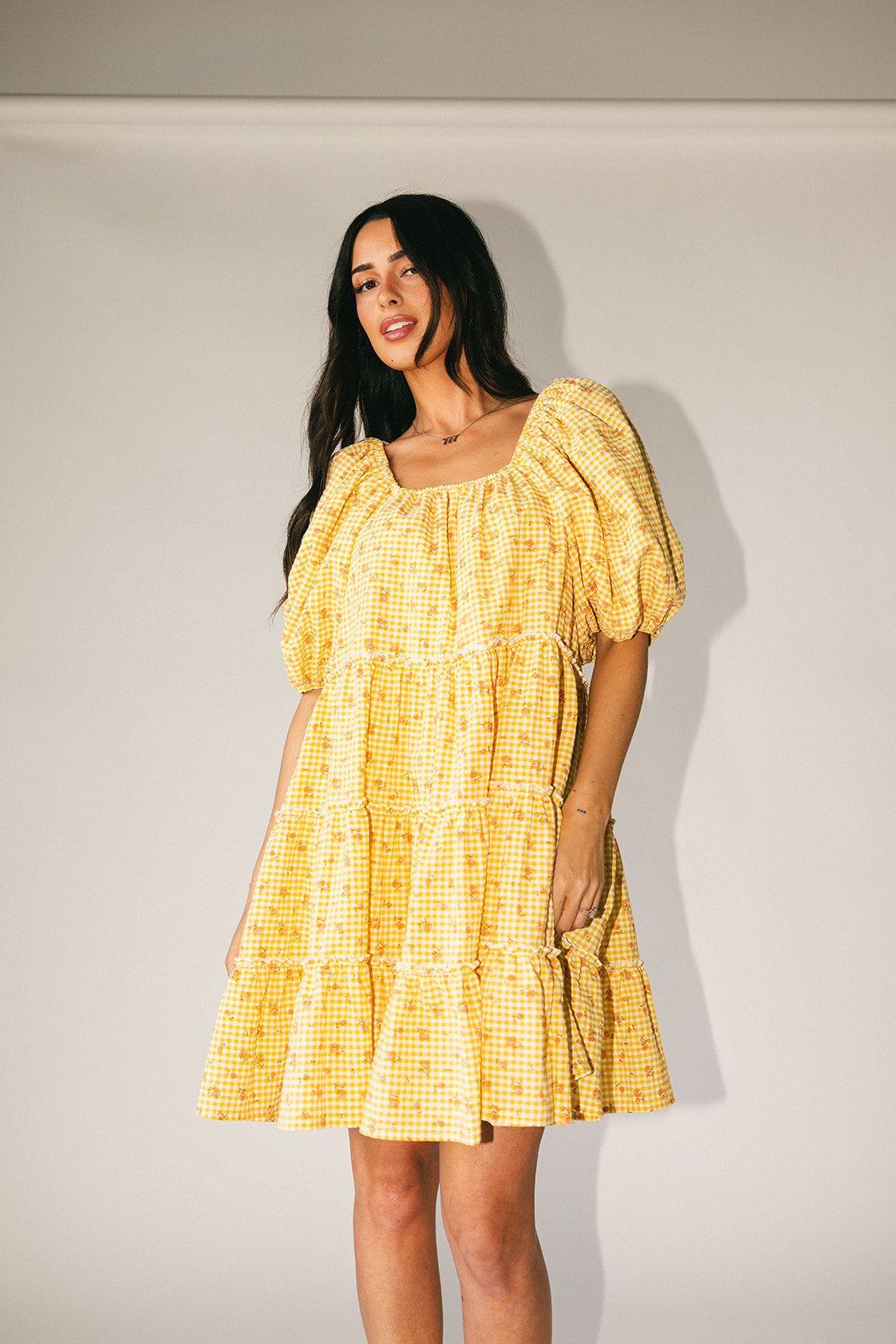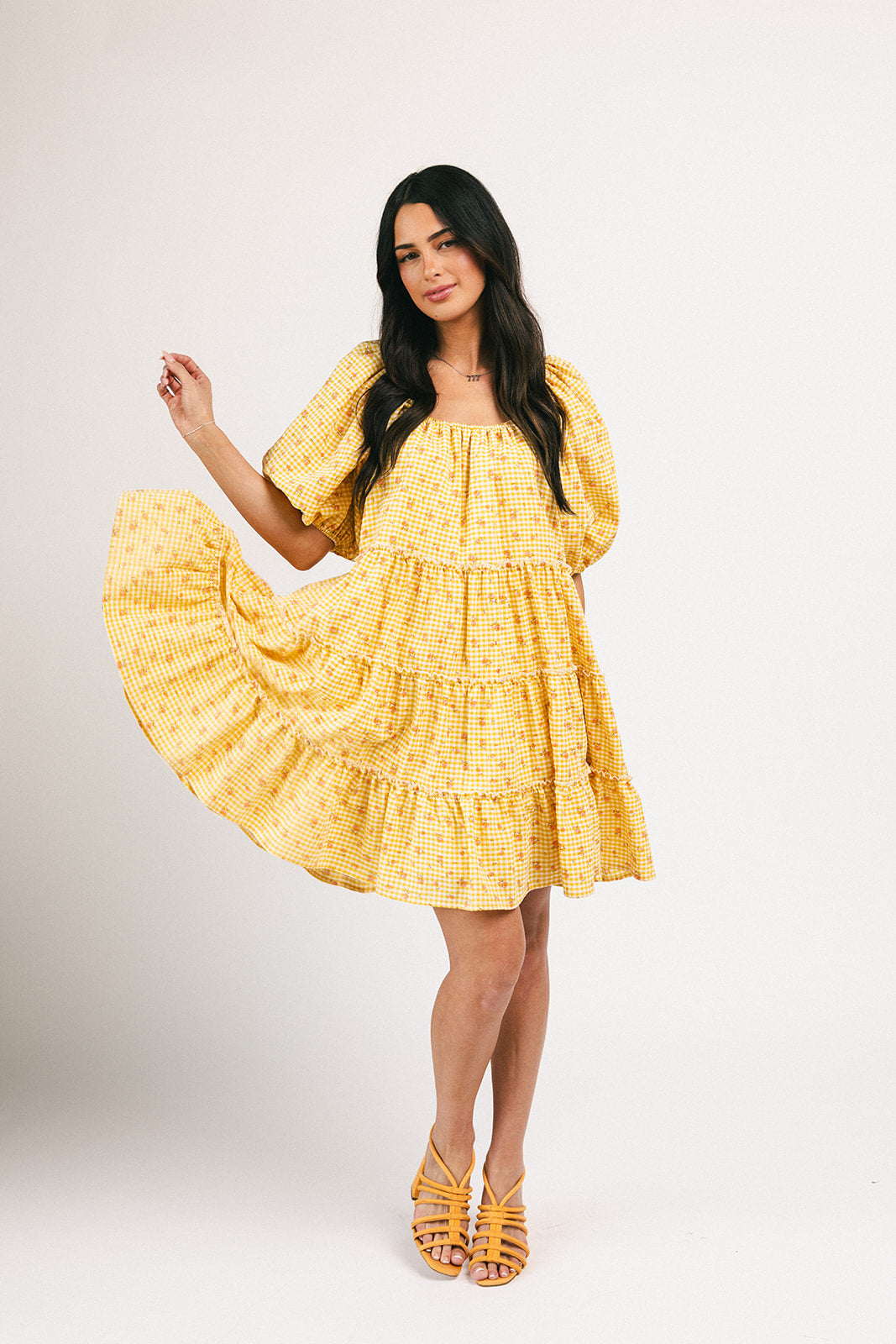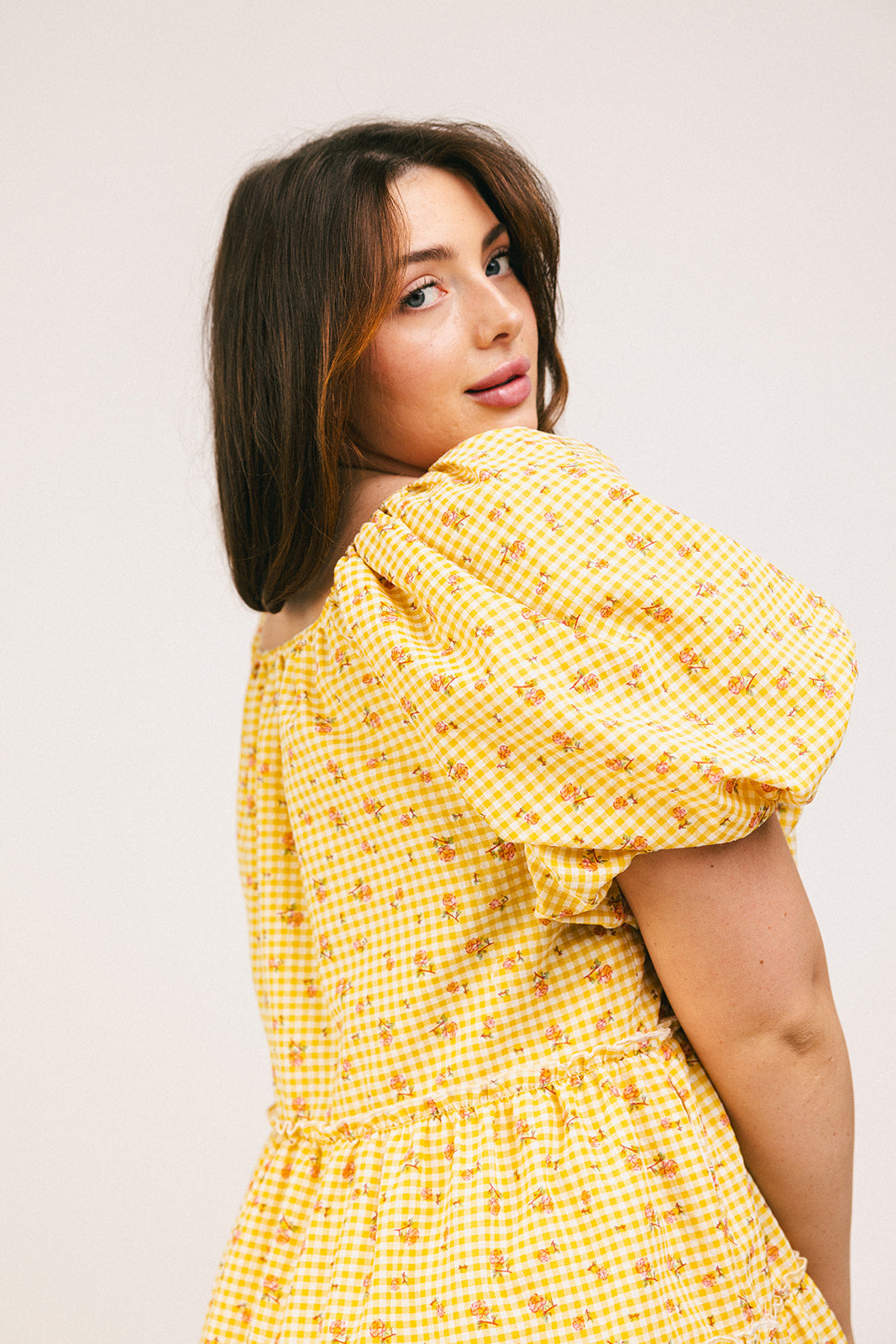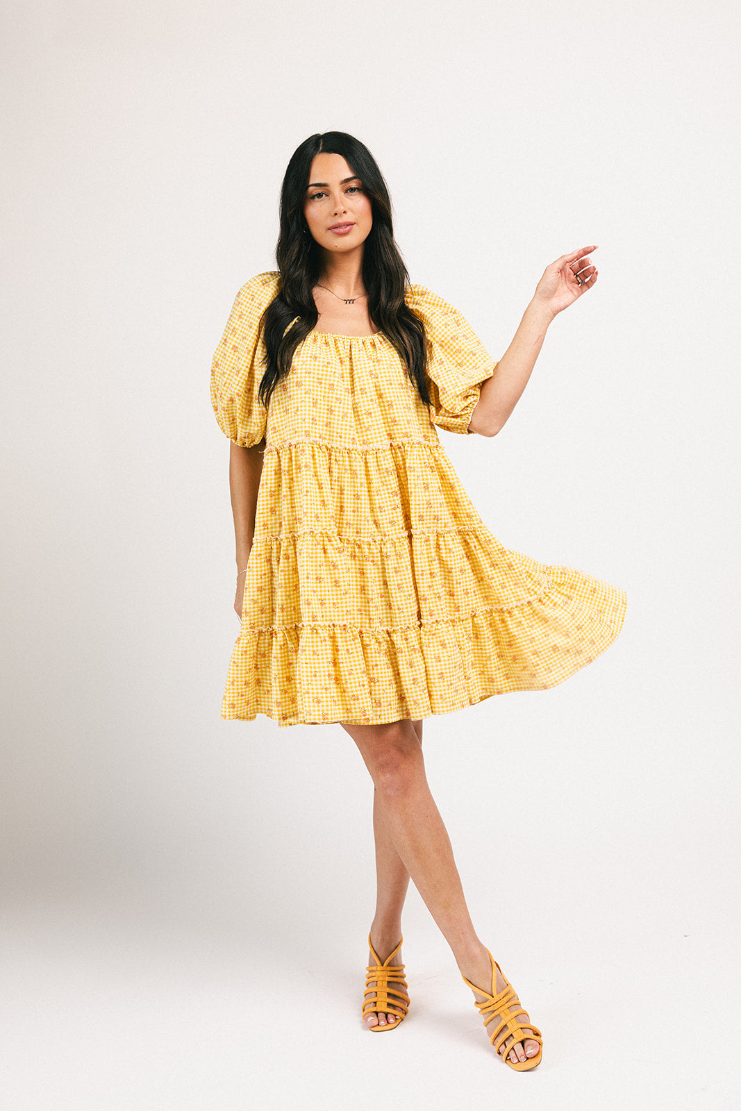 Från familjebilder till helgärenden, vår exklusiva korta Daymaker-klänning från Zoco gör allt. Tillverkad i ett sött gult ginghammönster med blommiga detaljer, har denna puffärmade klänning samma avslappnade känsla som vår ursprungliga Daymaker-klänning, men med en extra flörtig stil. Den stretchiga rundade halsringningen + shift-silhuetten erbjuder massor av mångsidighet, så det är den perfekta böljande miniklänningen för varje tillfälle.