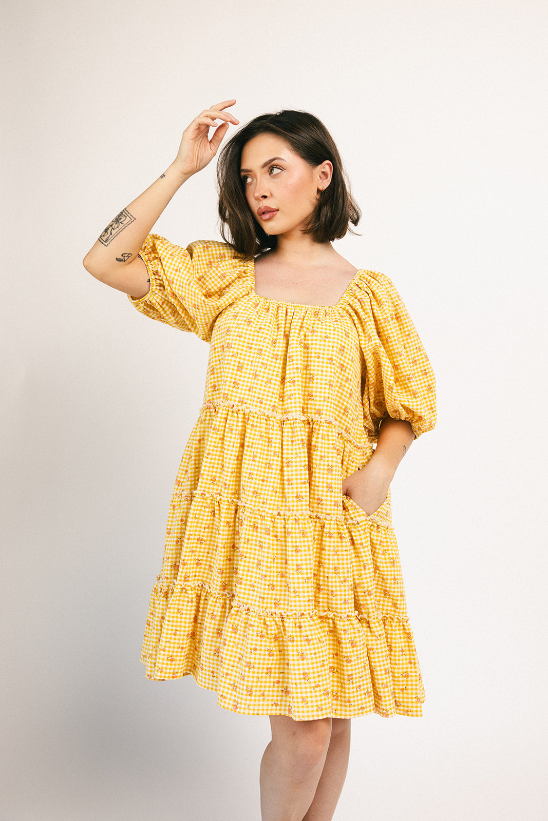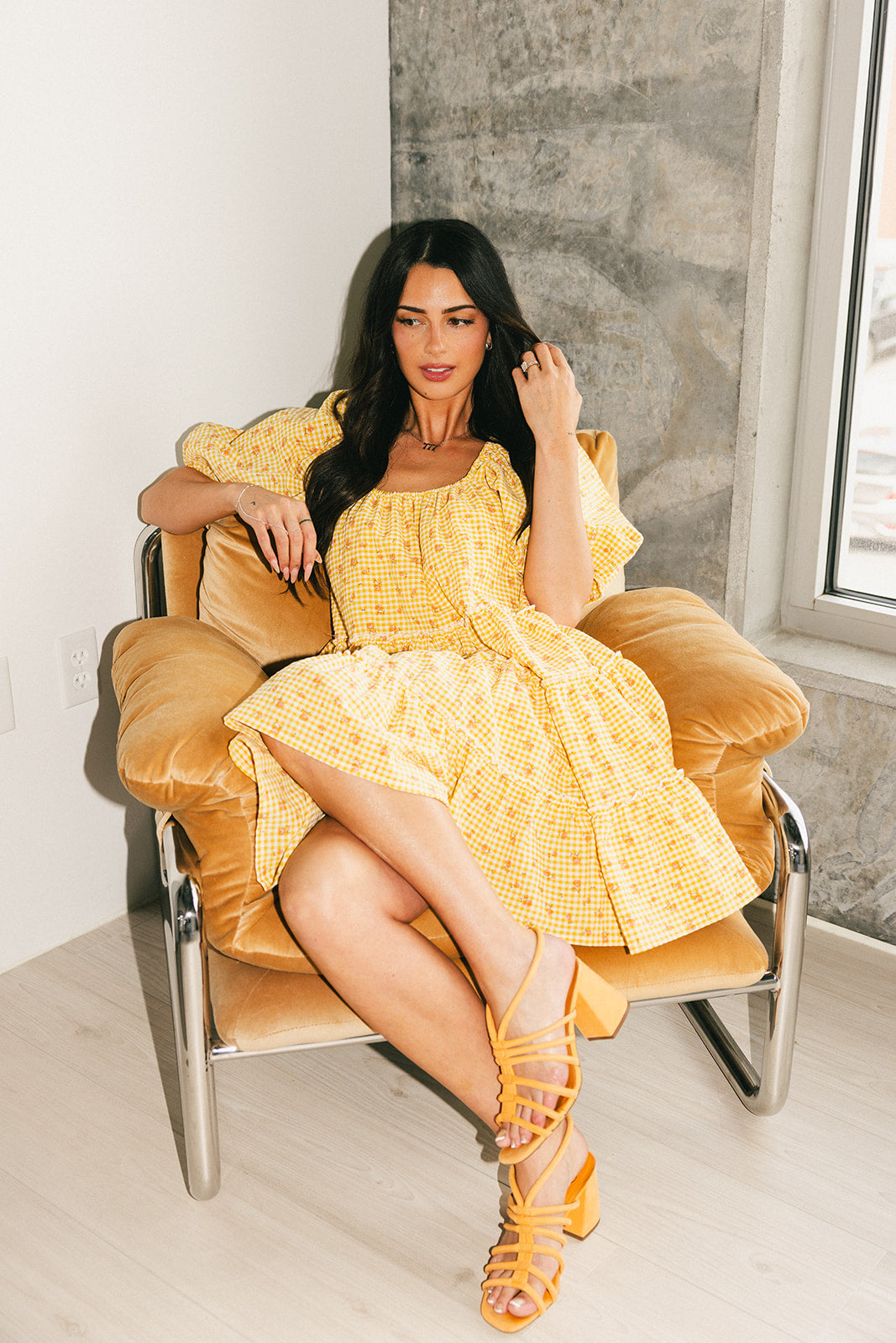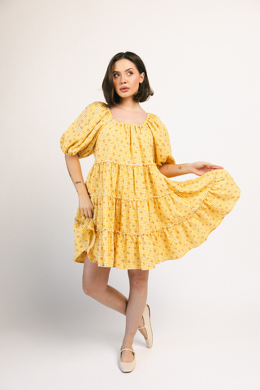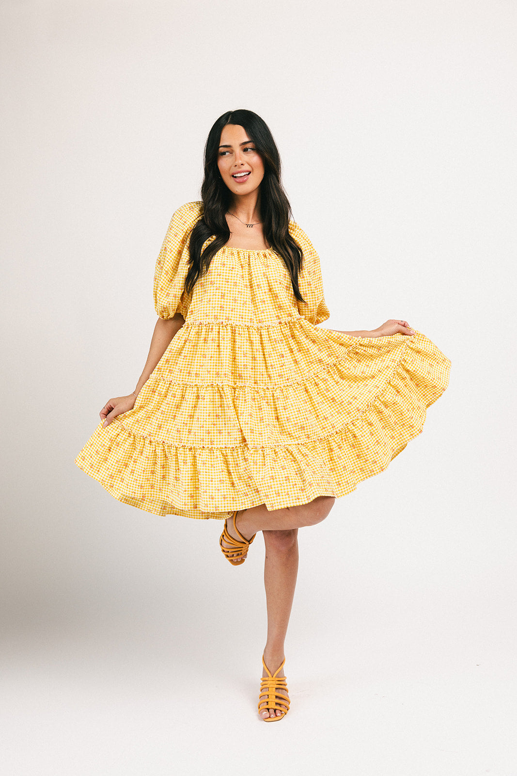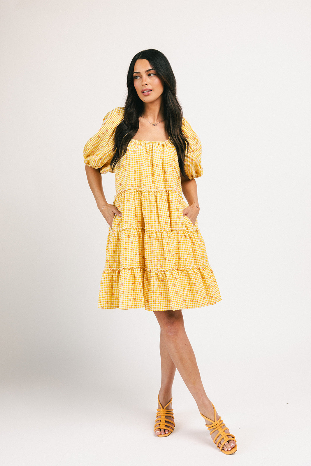 Från familjebilder till helgärenden, vår exklusiva korta Daymaker-klänning från Zoco gör allt. Tillverkad i ett sött gult ginghammönster med blommiga detaljer, har denna puffärmade klänning samma avslappnade känsla som vår ursprungliga Daymaker-klänning, men med en extra flörtig stil. Den stretchiga rundade halsringningen + shift-silhuetten erbjuder massor av mångsidighet, så det är den perfekta böljande miniklänningen för varje tillfälle.