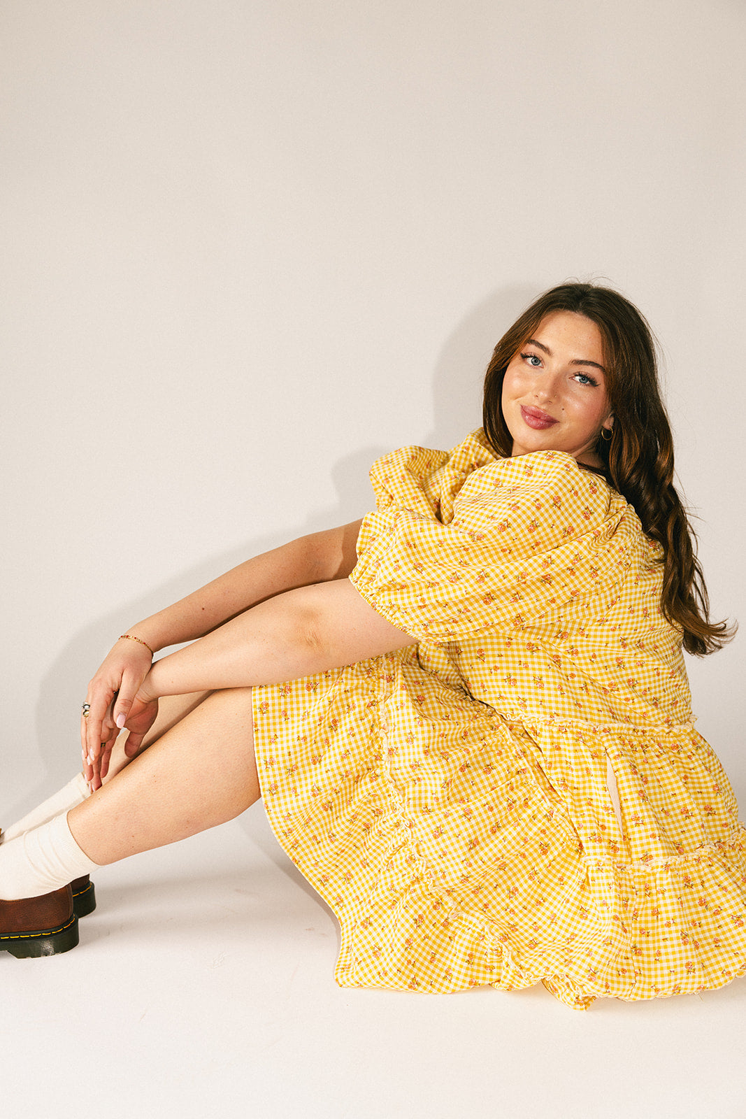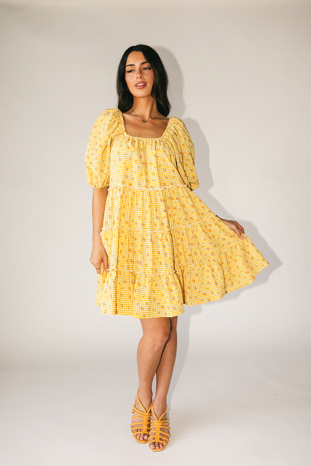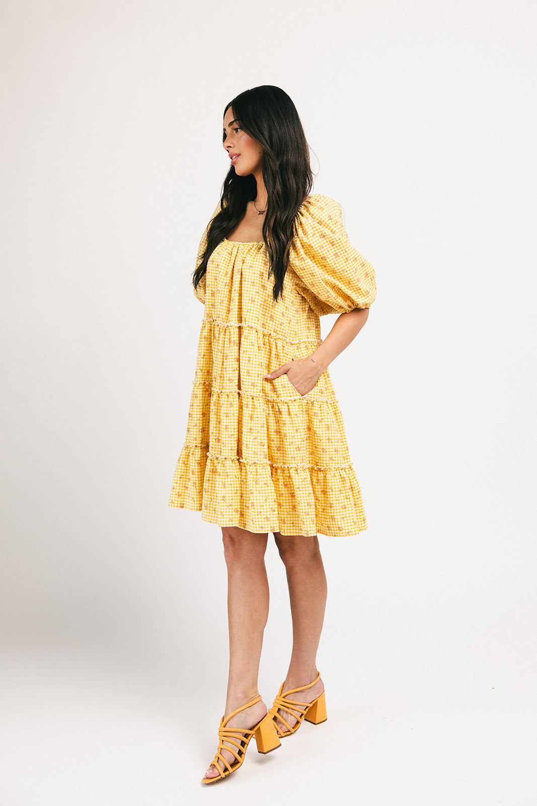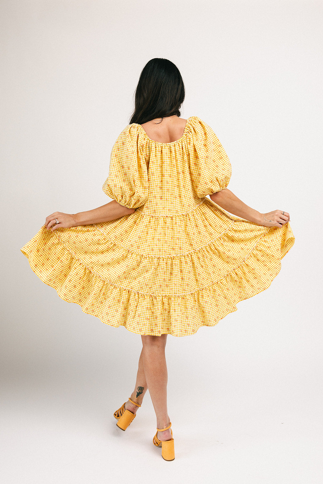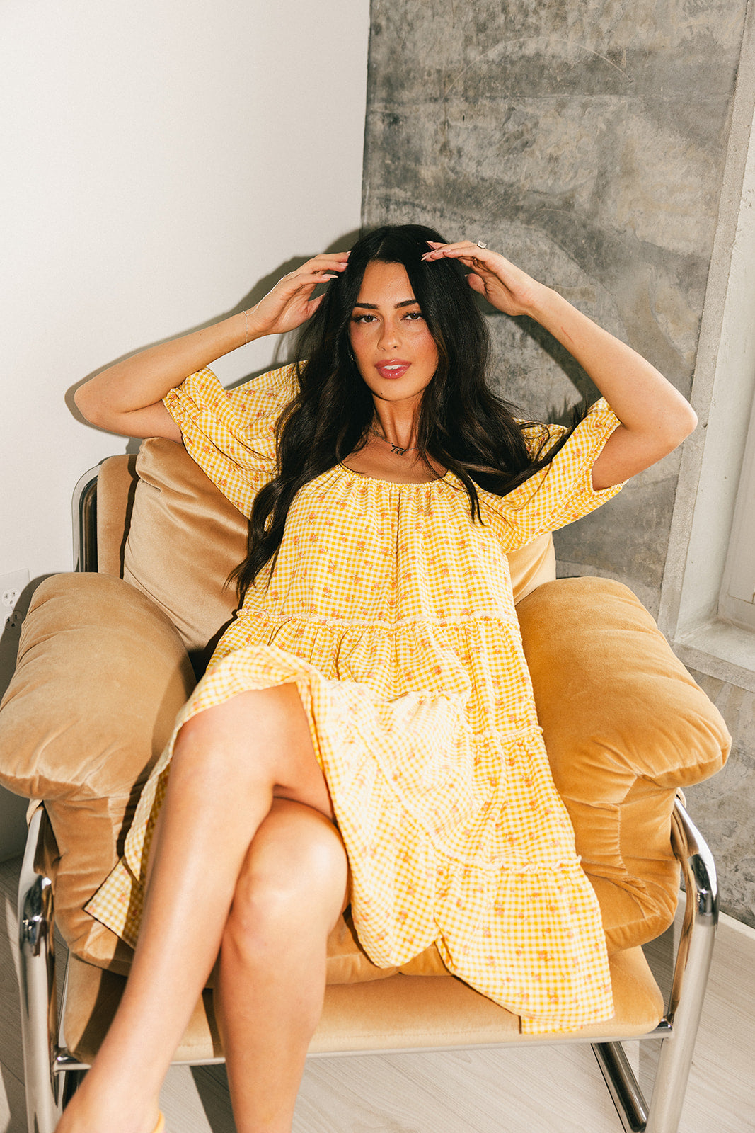 Från familjebilder till helgärenden, vår exklusiva korta Daymaker-klänning från Zoco gör allt. Tillverkad i ett sött gult ginghammönster med blommiga detaljer, har denna puffärmade klänning samma avslappnade känsla som vår ursprungliga Daymaker-klänning, men med en extra flörtig stil. Den stretchiga rundade halsringningen + shift-silhuetten erbjuder massor av mångsidighet, så det är den perfekta böljande miniklänningen för varje tillfälle.