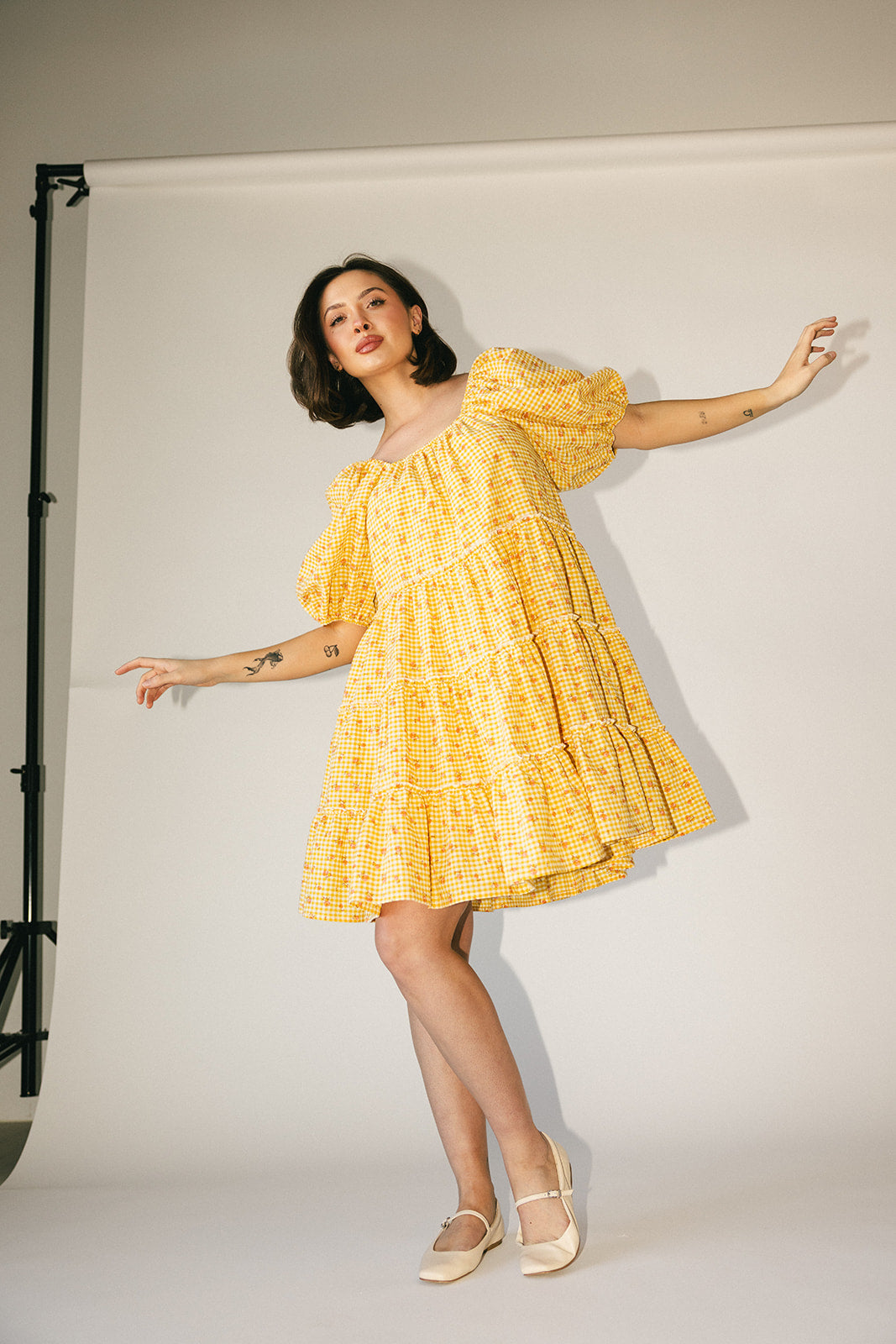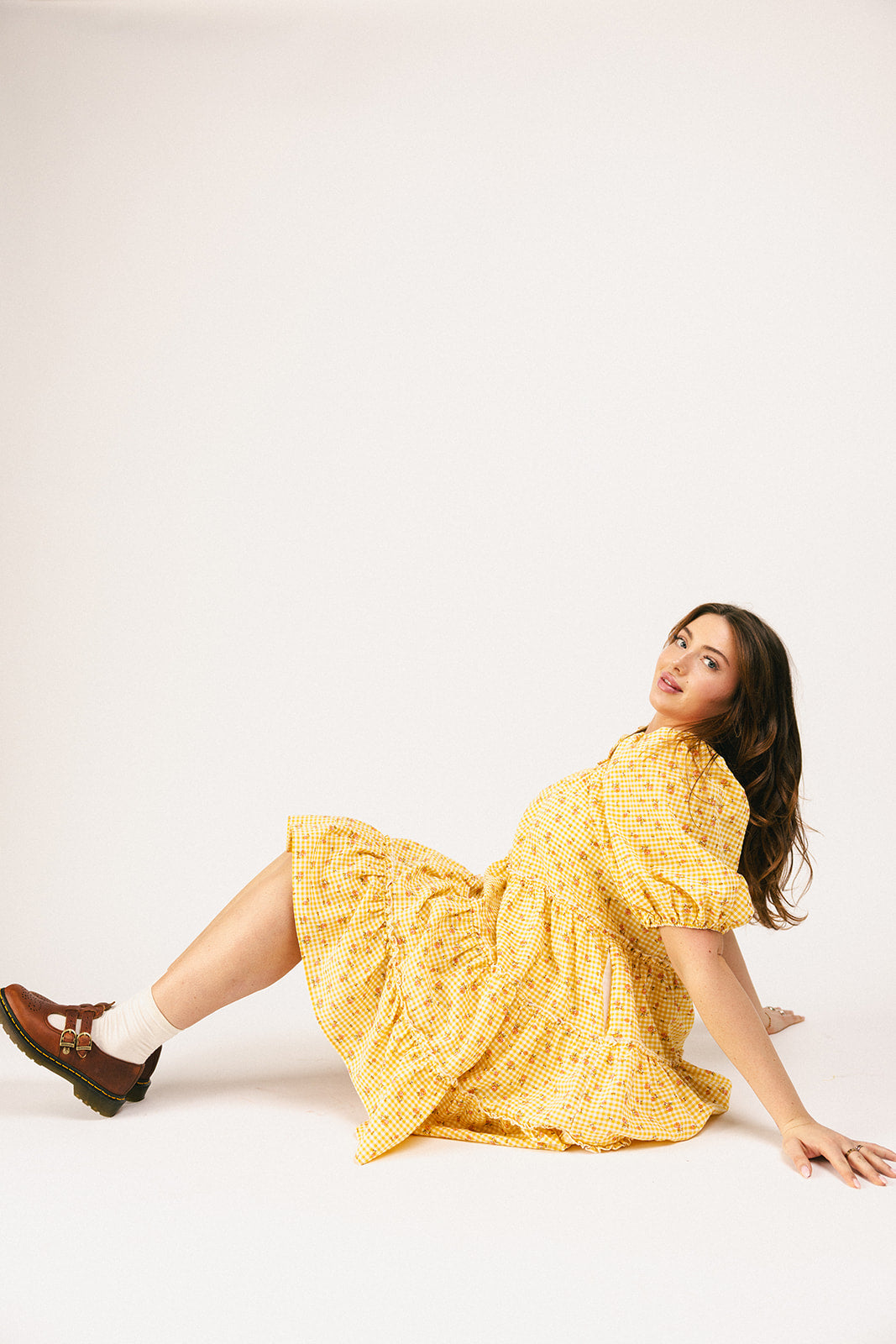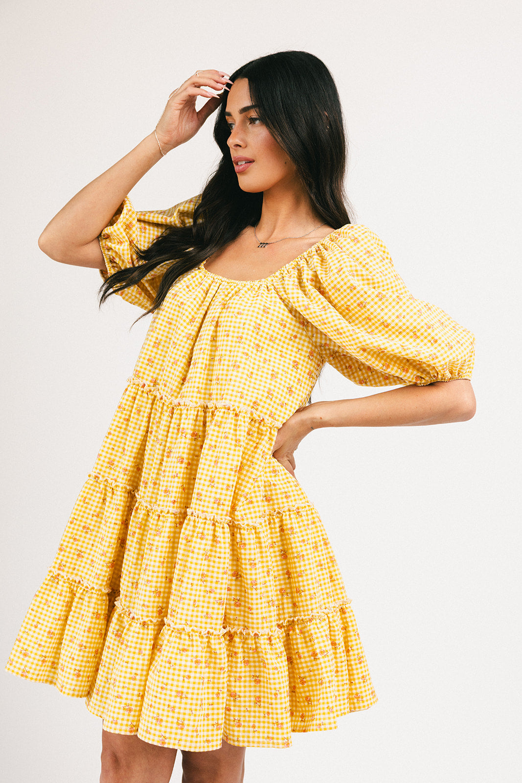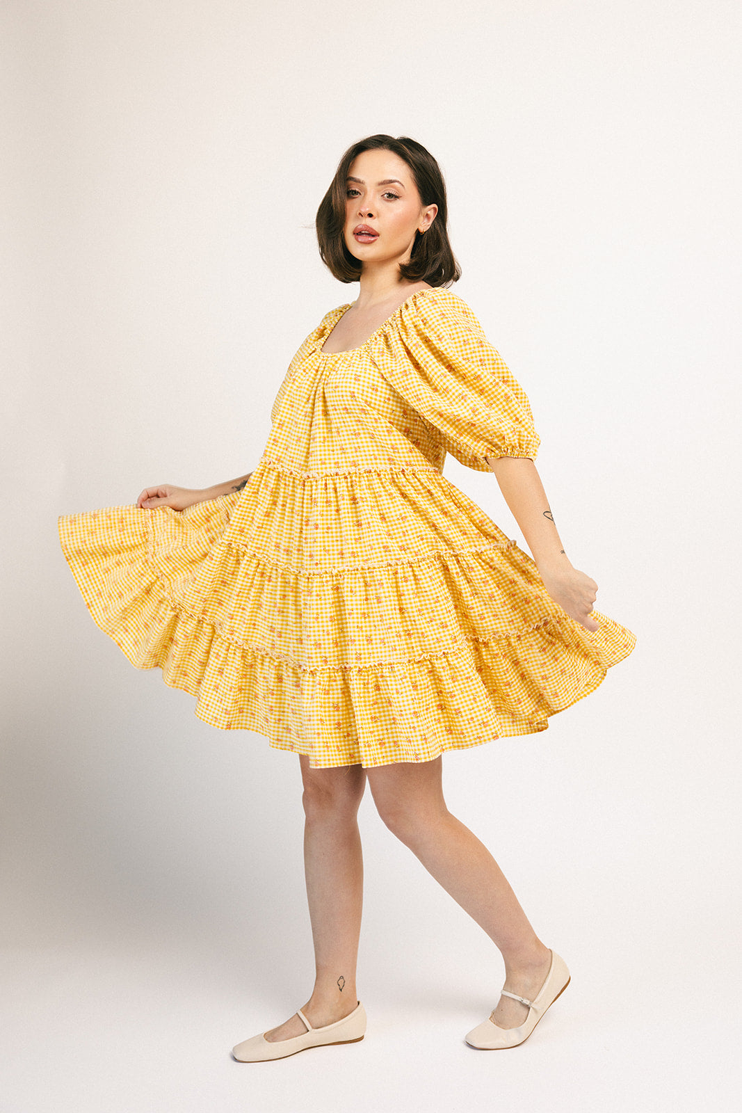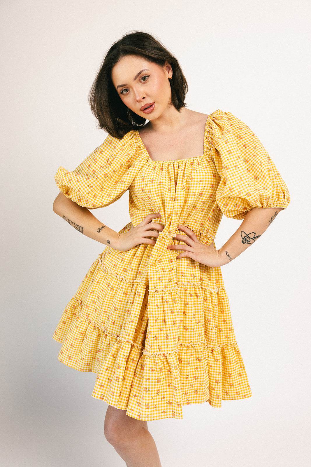 Från familjebilder till helgärenden, vår exklusiva korta Daymaker-klänning från Zoco gör allt. Tillverkad i ett sött gult ginghammönster med blommiga detaljer, har denna puffärmade klänning samma avslappnade känsla som vår ursprungliga Daymaker-klänning, men med en extra flörtig stil. Den stretchiga rundade halsringningen + shift-silhuetten erbjuder massor av mångsidighet, så det är den perfekta böljande miniklänningen för varje tillfälle.