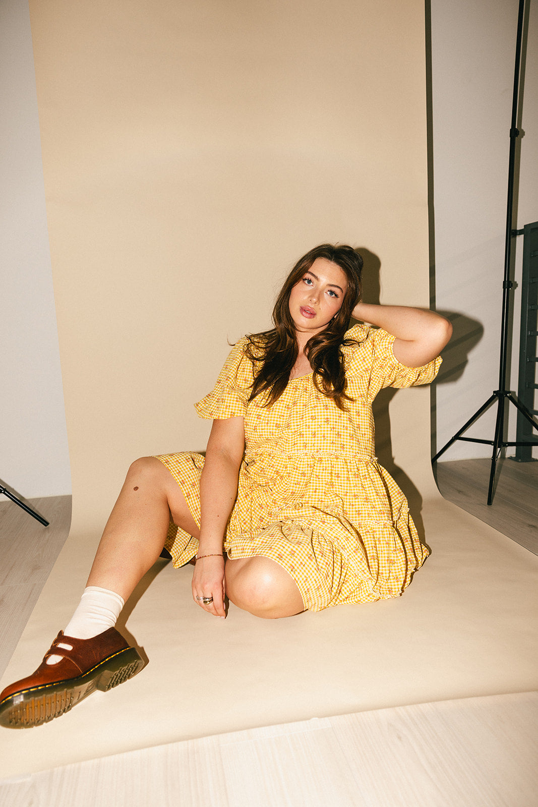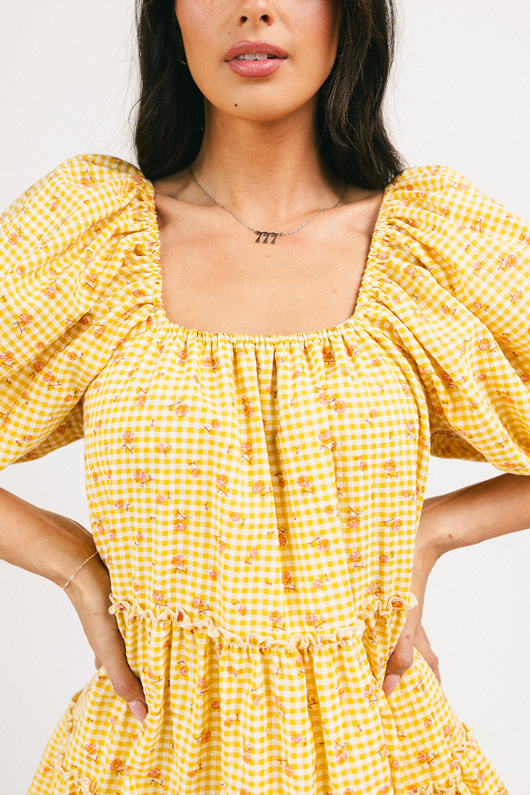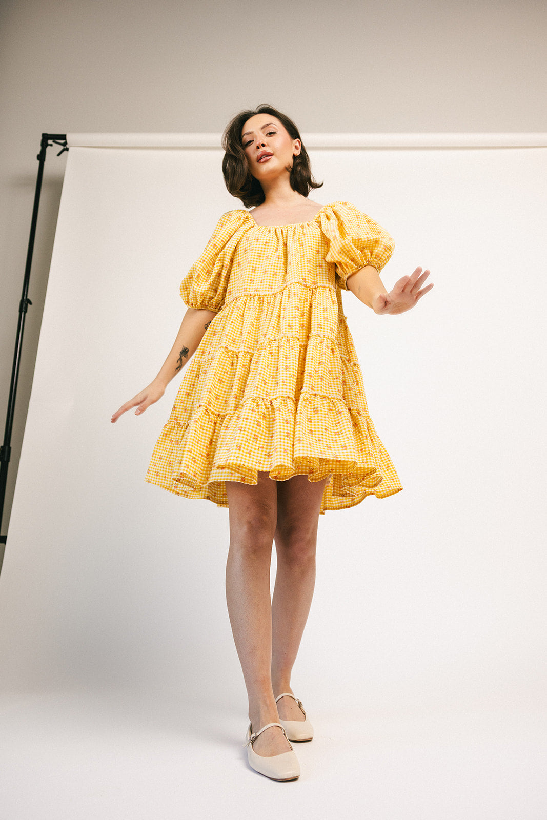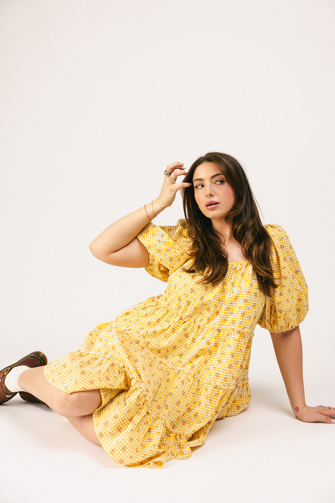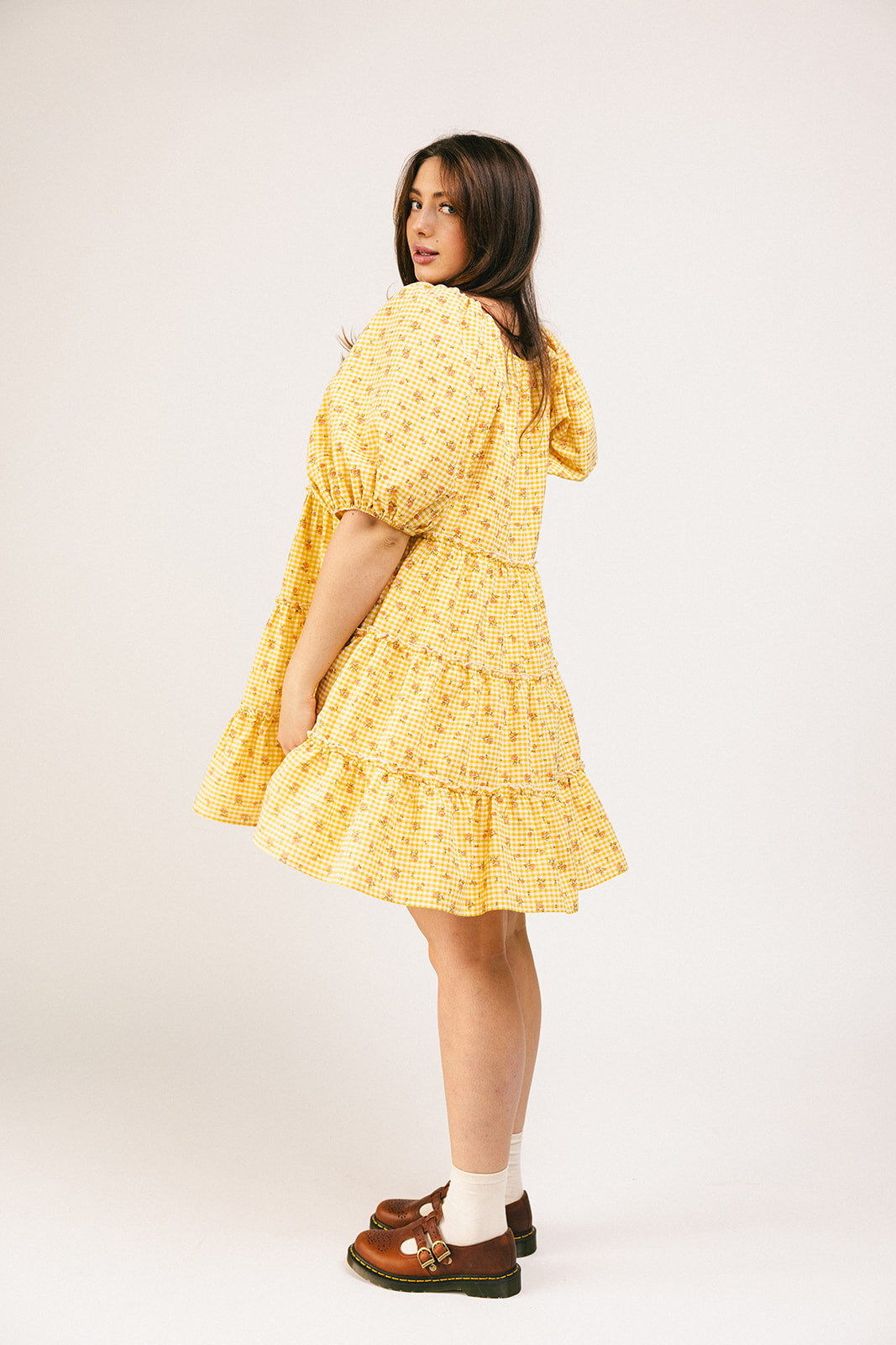 Från familjebilder till helgärenden, vår exklusiva korta Daymaker-klänning från Zoco gör allt. Tillverkad i ett sött gult ginghammönster med blommiga detaljer, har denna puffärmade klänning samma avslappnade känsla som vår ursprungliga Daymaker-klänning, men med en extra flörtig stil. Den stretchiga rundade halsringningen + shift-silhuetten erbjuder massor av mångsidighet, så det är den perfekta böljande miniklänningen för varje tillfälle.