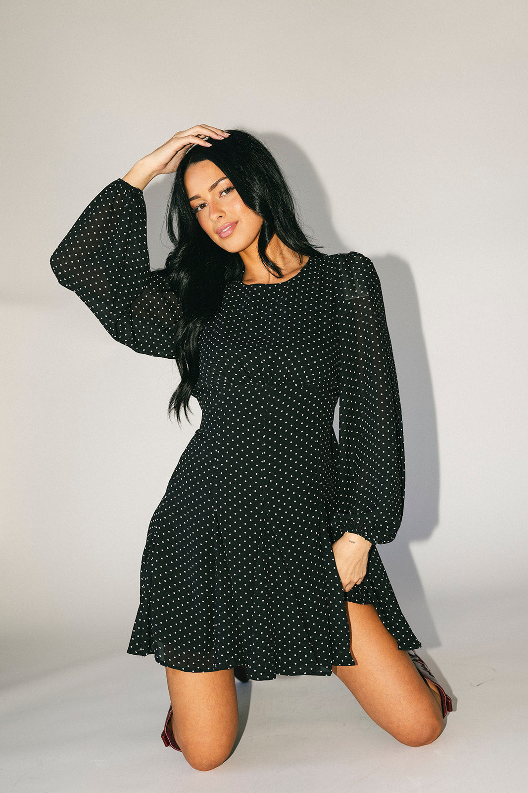 Den här flörtiga miniklänningen med prickar får alla att stanna upp + stirra (+ och sedan fråga var du fått tag på den). Den har en elegant korsettliknande överdel med hög halsringning + långa ballongärmar. Den perfekta lilla svarta miniklänningen för dejtkvällar, fina middagar + eleganta fester.