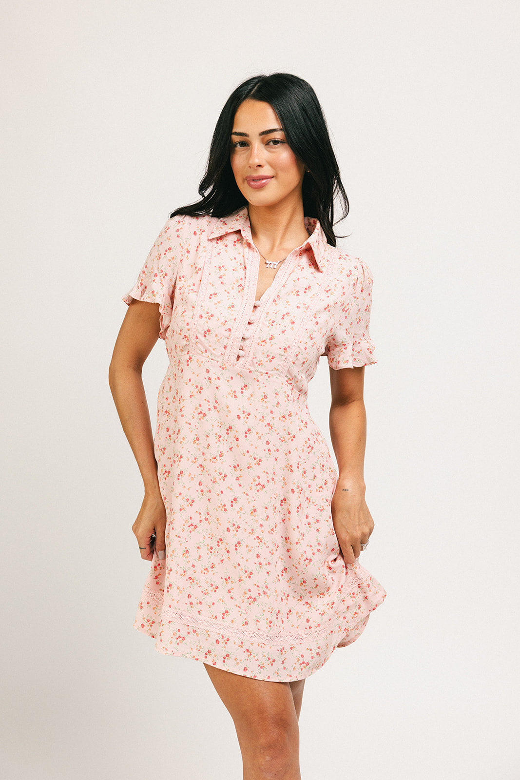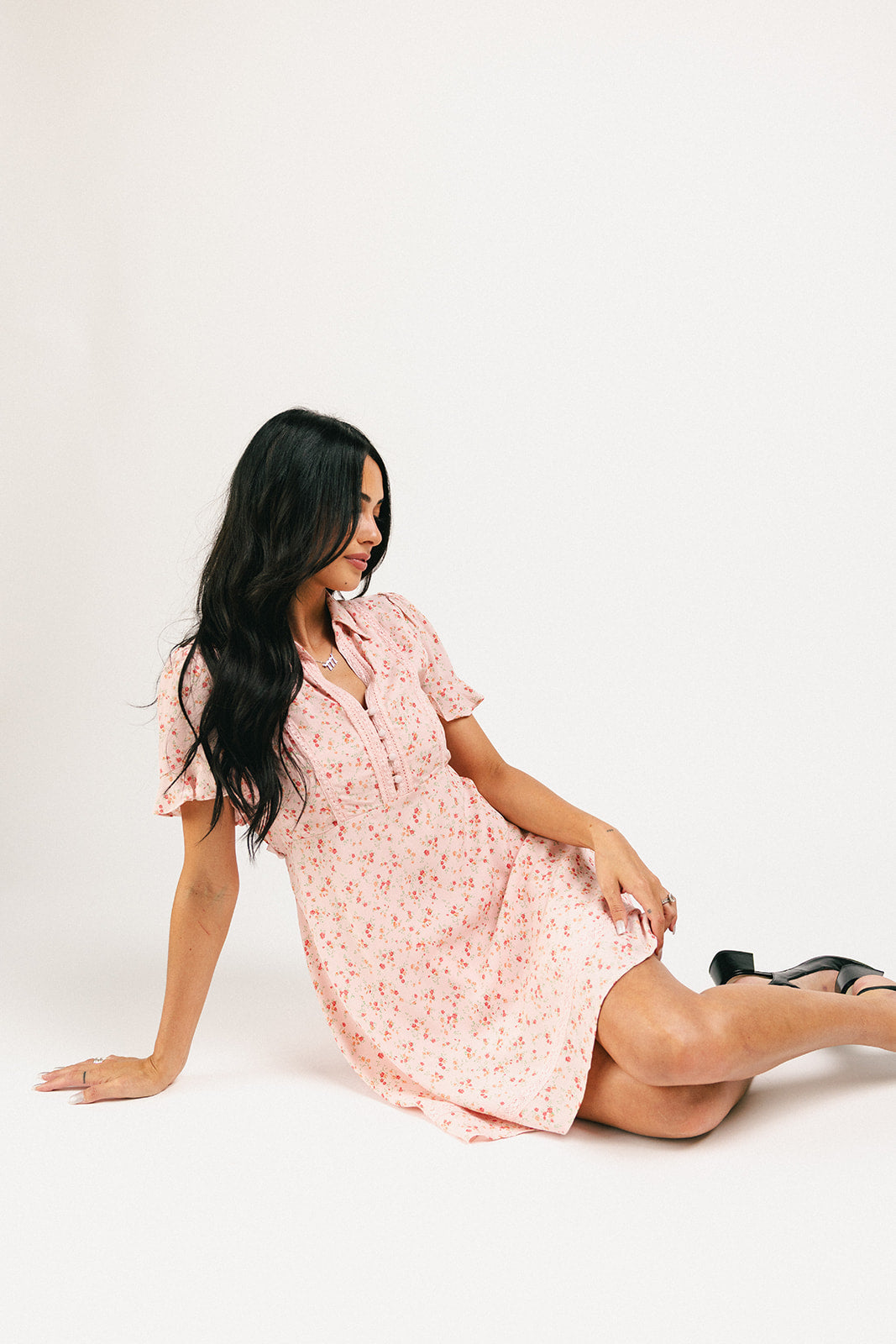 Söt + lekfull, denna rosa blommiga miniklänning är gjord för trädgårdsfester, möhippor + brunch med tjejerna. Den har en böljande silhuett med krage + ett elastiskt knytband bak som sitter perfekt. Oavsett om du kombinerar den med klackar eller platta skor är det den perfekta kortärmade miniklänningen för varje tillfälle.