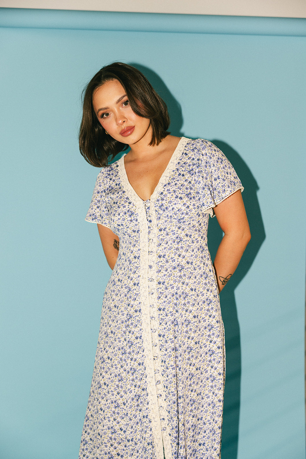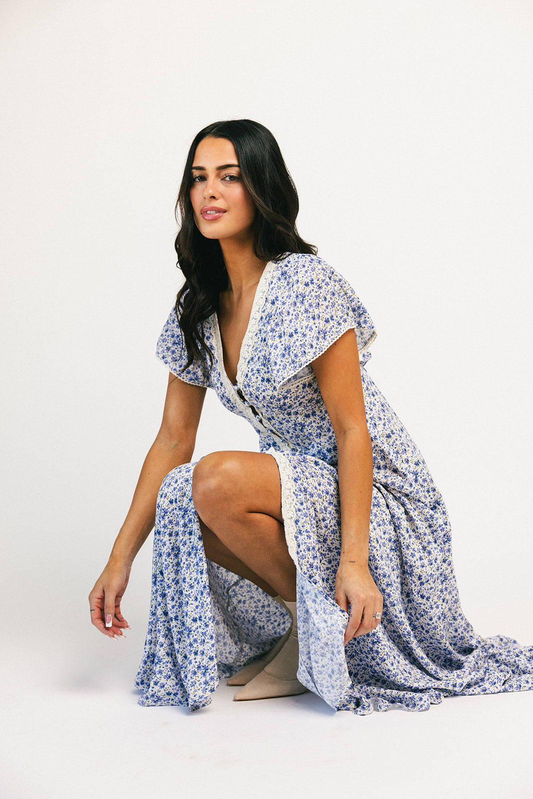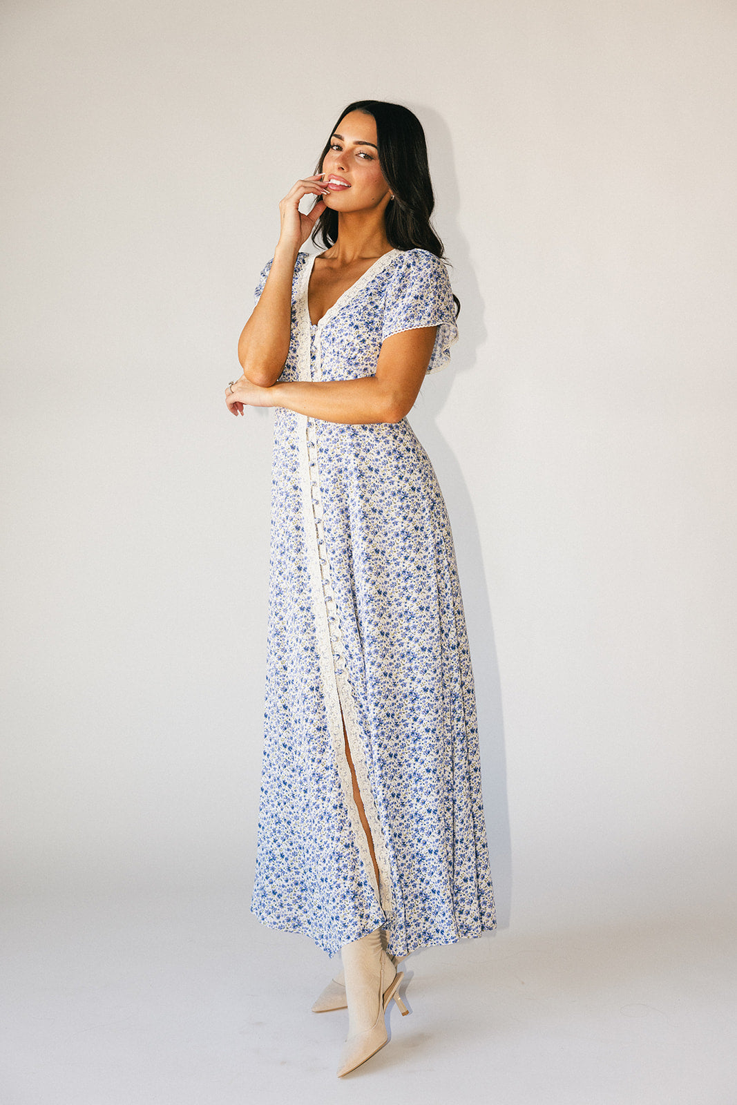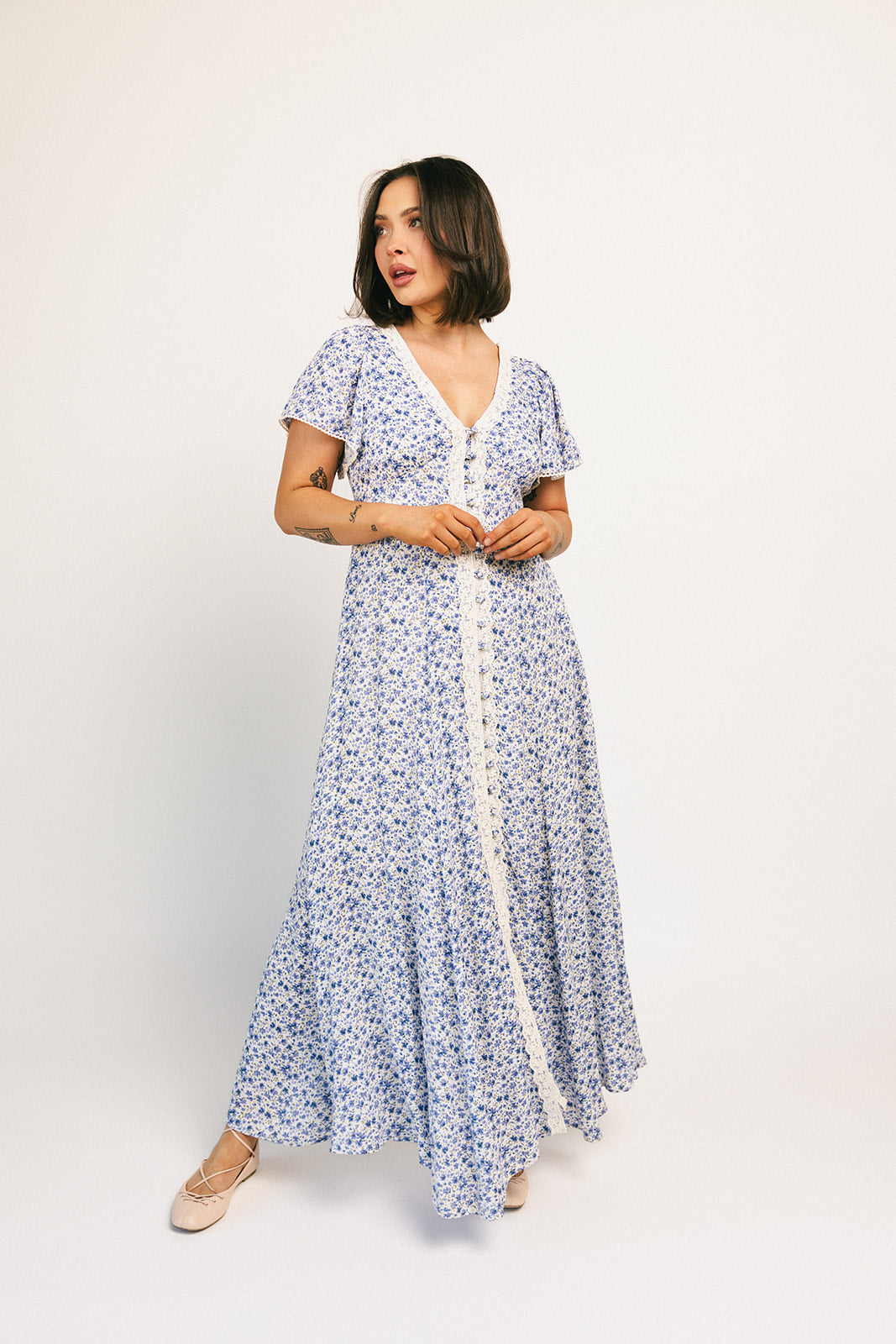 Böljande + flörtig, denna kortärmade blommiga maxiklänning är lätt att styla + omöjlig att ignorera. Med ett blått, prydligt blommönster + en drömsk knappknäppt silhuett är den gjord för att kläs upp eller avslappnad för alla tillfällen. Den perfekta, enkla maxiklänningen för bröllop, familjefoton + allt däremellan.