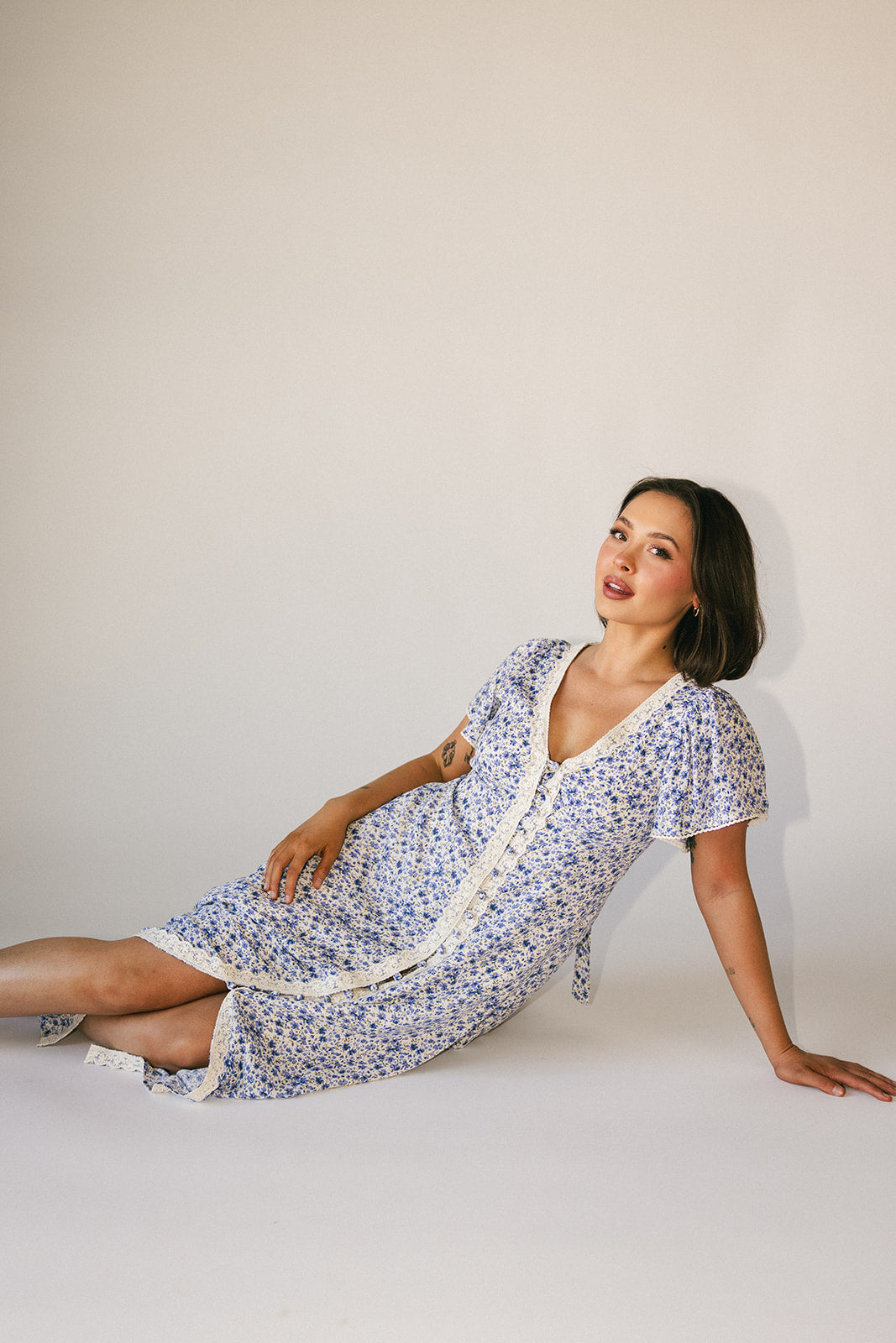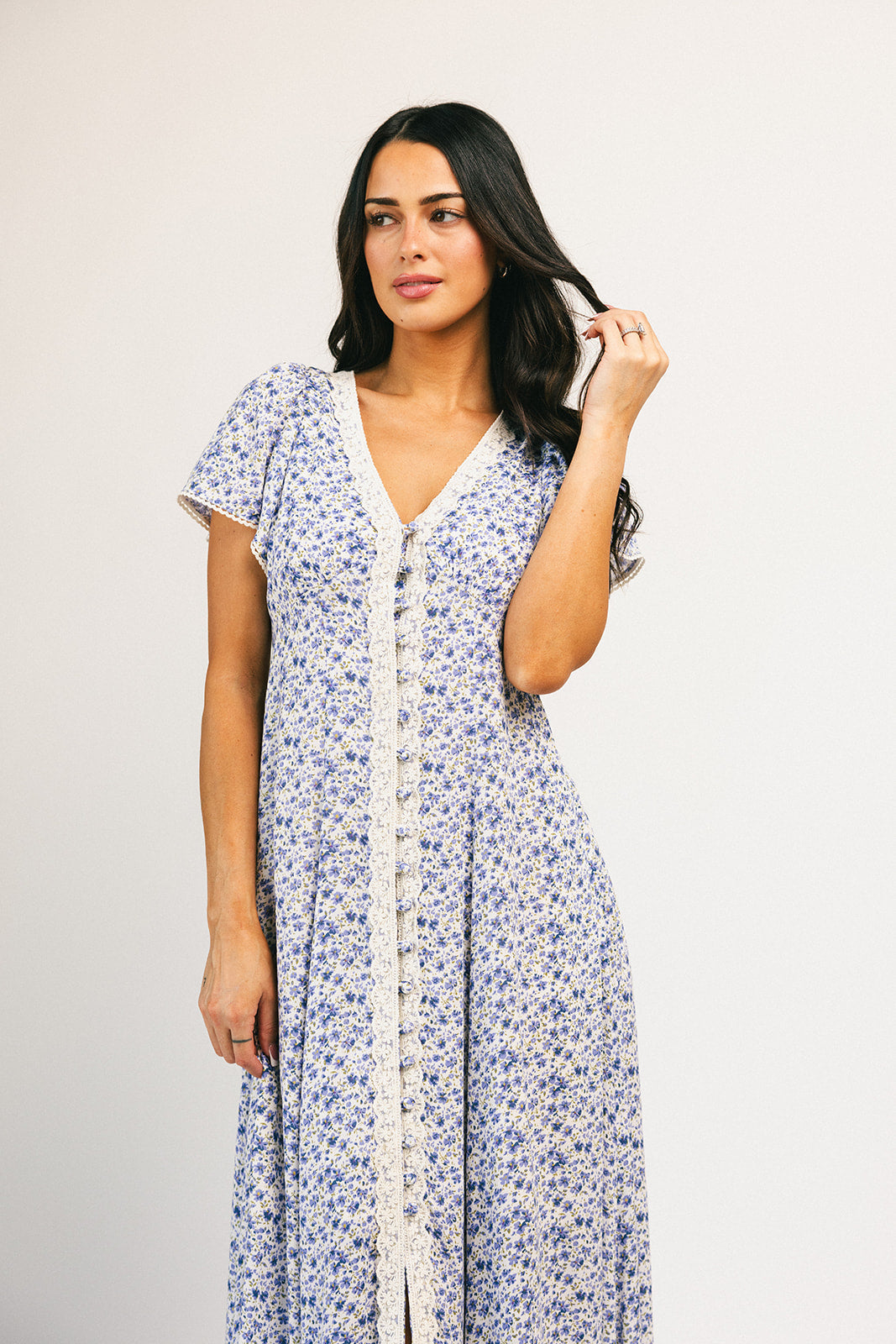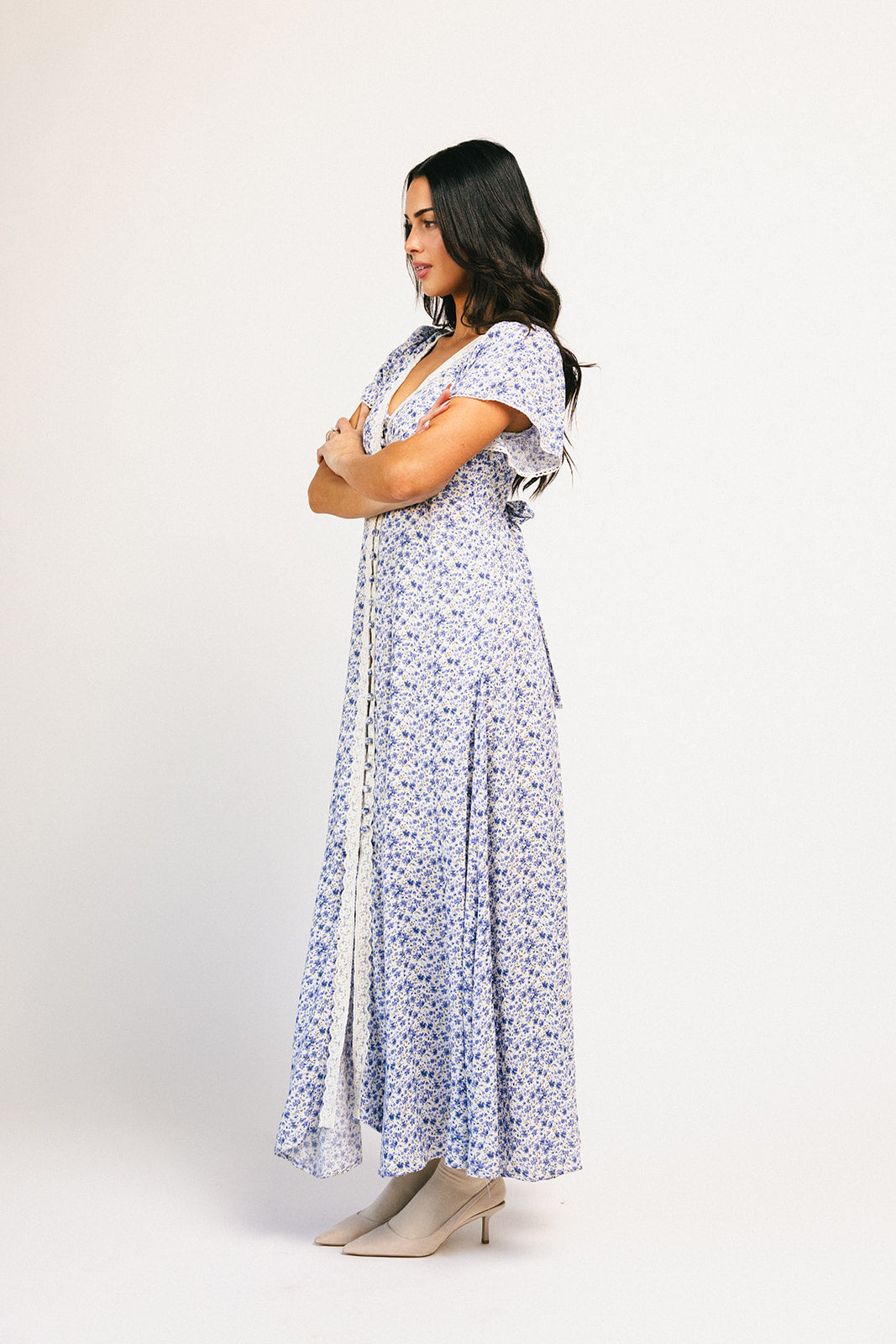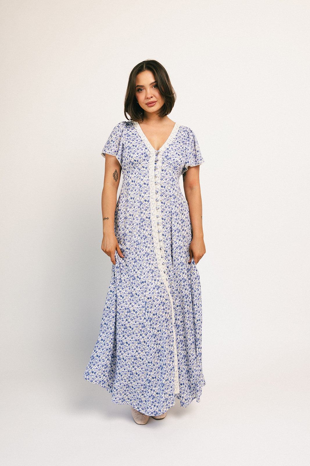 Böljande + flörtig, denna kortärmade blommiga maxiklänning är lätt att styla + omöjlig att ignorera. Med ett blått, prydligt blommönster + en drömsk knappknäppt silhuett är den gjord för att kläs upp eller avslappnad för alla tillfällen. Den perfekta, enkla maxiklänningen för bröllop, familjefoton + allt däremellan.