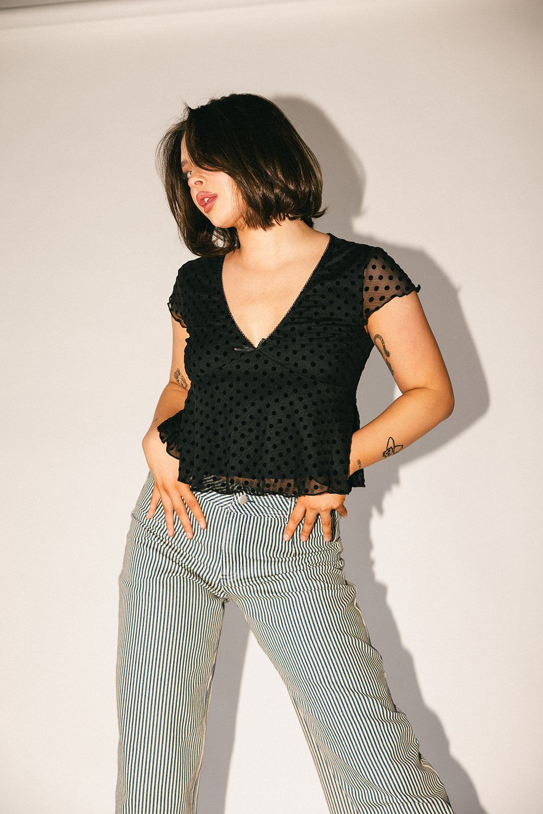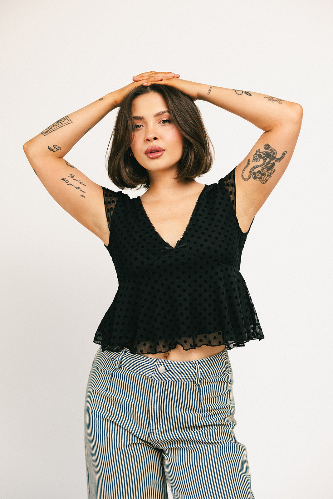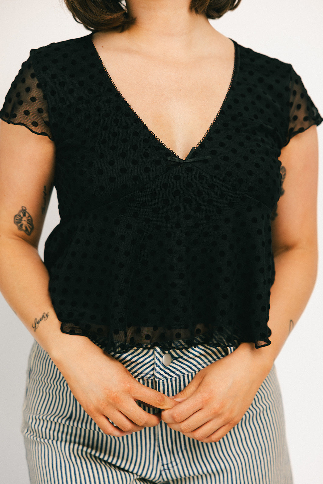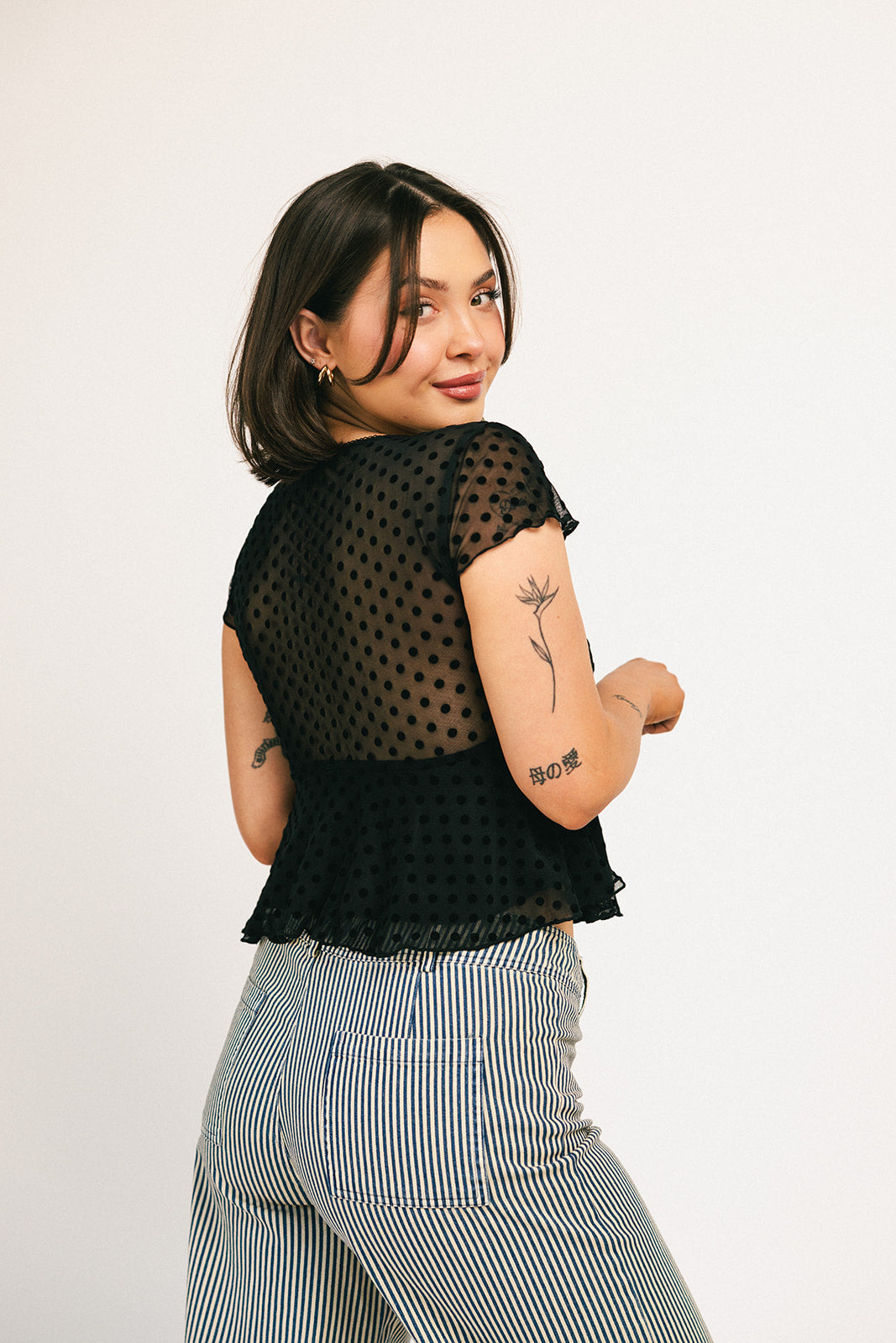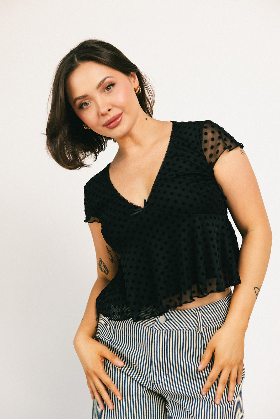 Denna kortärmade svarta topp är söt + feminin, men har en kraftfull touch. Med ett elegant prickigt överlägg har den en babydoll-form med en flörtig v-ringning. Oavsett om du klär den upp för dejtkvällen eller avslappnad för avslappnade utflykter, är det den perfekta, upphöjda baströjan för varje säsong.