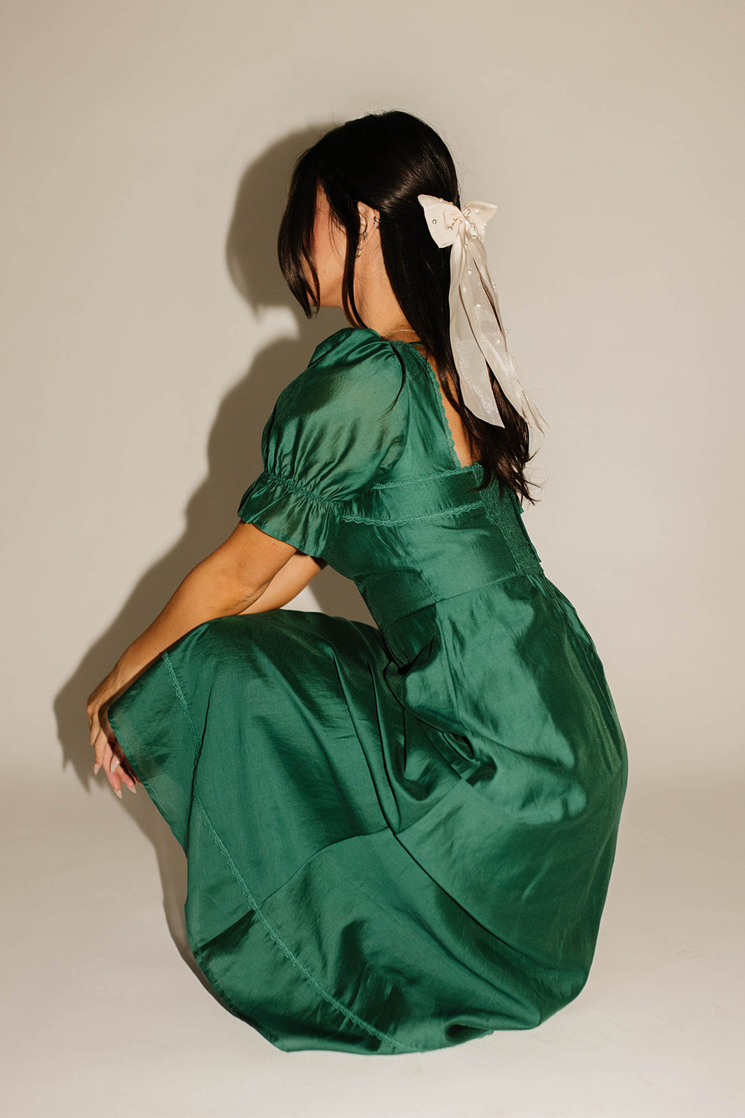 • grön // midilängd, fyrkantig halsringning, puffärmar, elastiska manschetter, rosettdetalj, spetsdetaljer, knytband bak, smockad rygg, dragkedja bak, fodrad