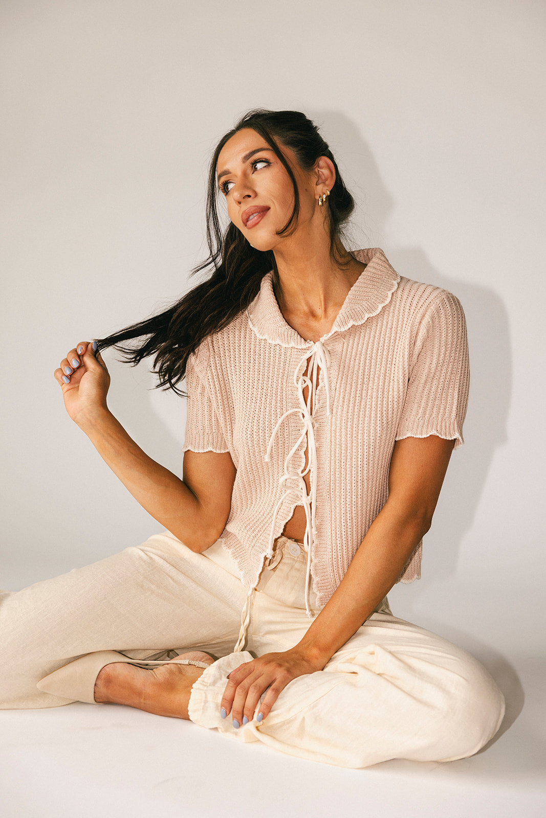 Uppgradera vilken outfit som helst med denna kortärmade topp med knytband framtill. Den har en åtsittande silhuett med öppet knytband framtill och vågiga detaljer. Oavsett om du bär den tillsammans eller stylar den solo, är det den perfekta neutrala stickade toppen för tjejkvällar, middagsdejter och allt däremellan.