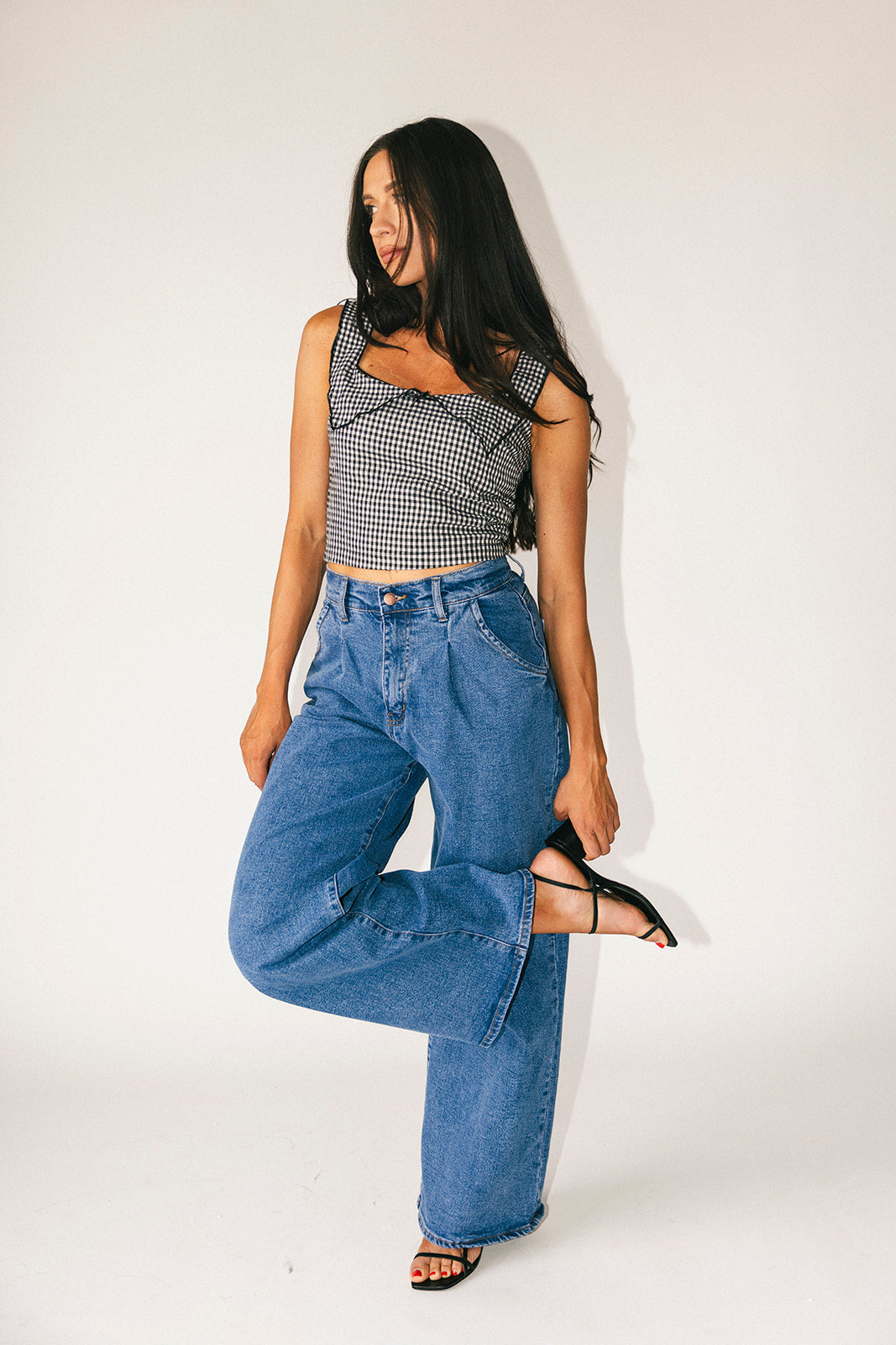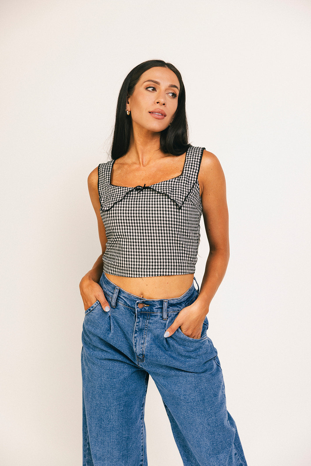 Picknickvibbar men gör det flörtigt. Den här svarta ginghamtoppen tar dig från dag till natt, hela säsongen. Med sin eleganta, åtsittande silhuett och eleganta håldetaljer i spets kan du enkelt klä upp den eller avkläda den. Den perfekta, inte så enkla toppen för konserter, brunchdejter och tjejkvällar.