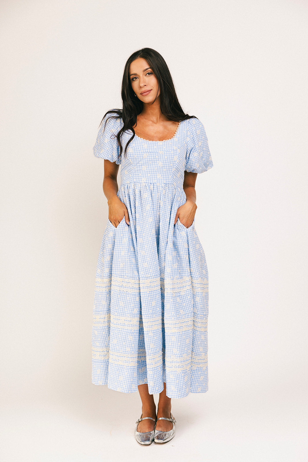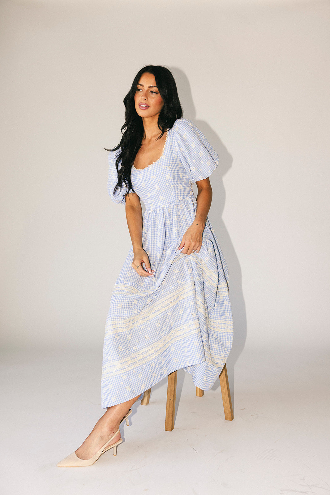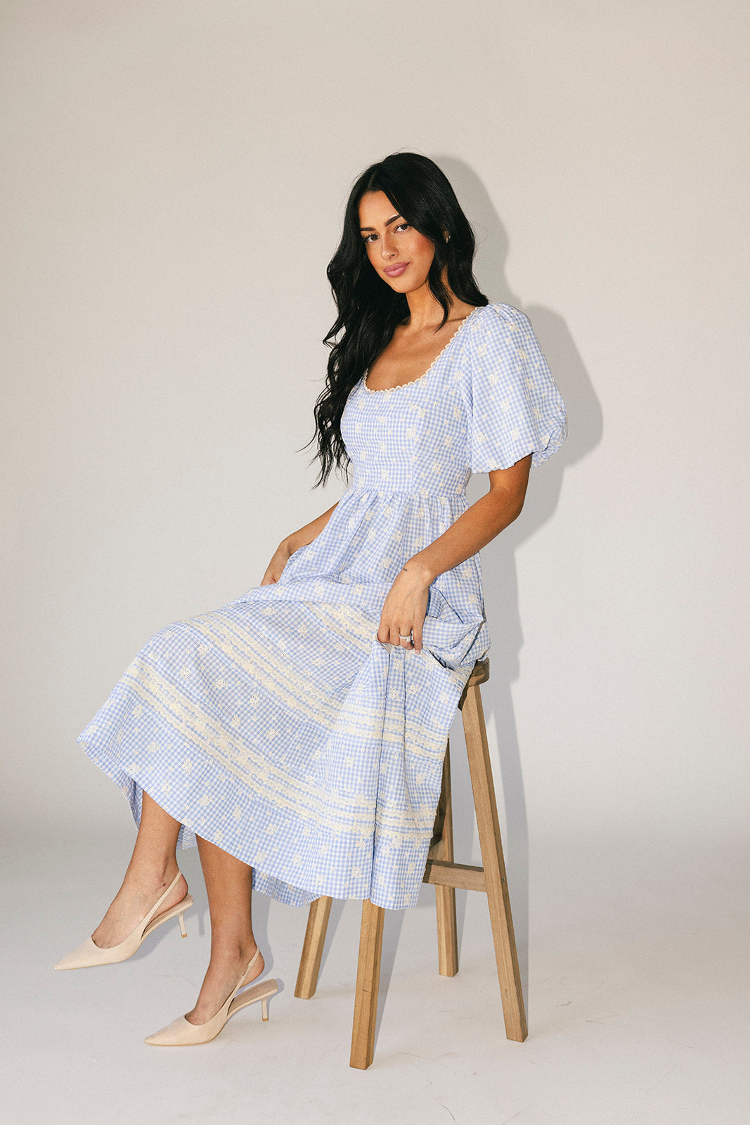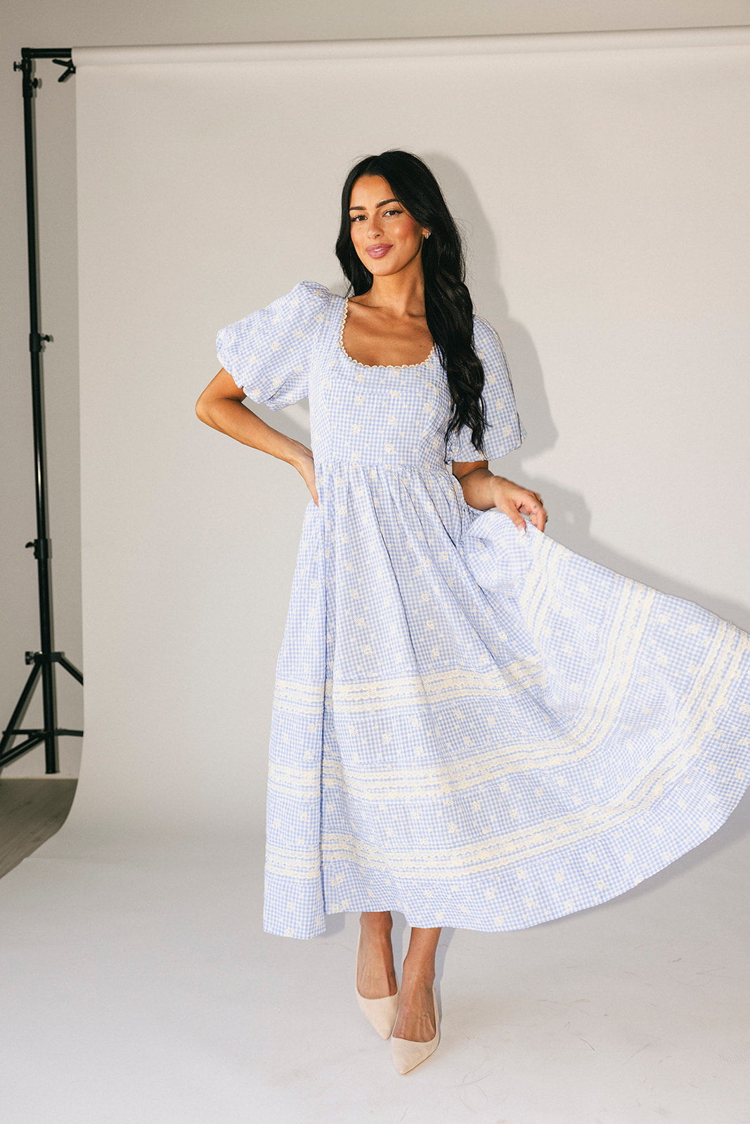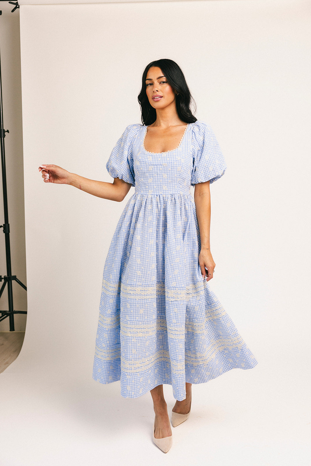 Söt + feminin, denna babyblå midiklänning med puffärmar ger tidlös romantik med en chic twist. Dess vintageinspirerade silhuett har en spetskjol med flera lager och broderade blomdetaljer. Den perfekta klänningen för bröllop, babyshowers, brunchdejter och mer därtill.
