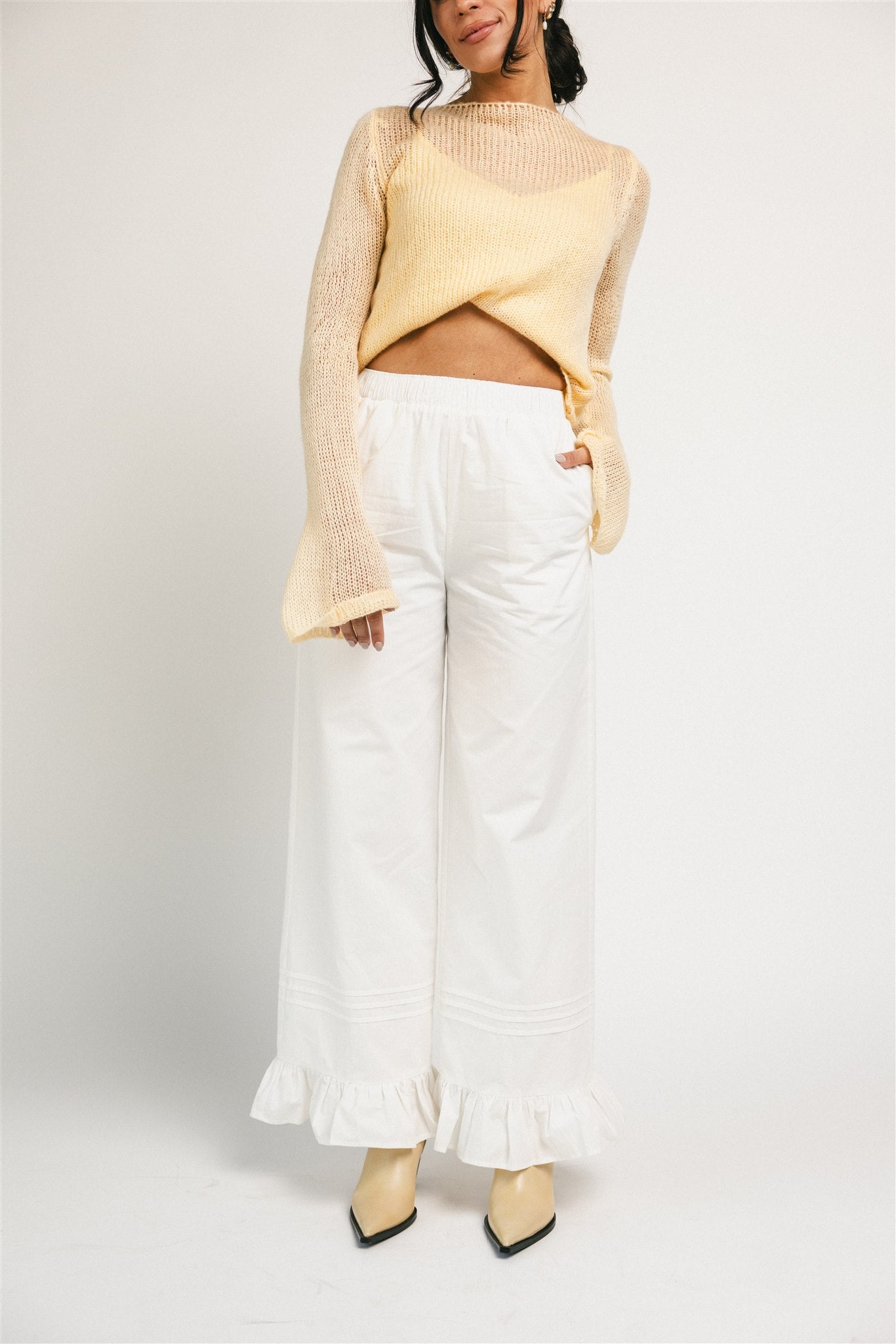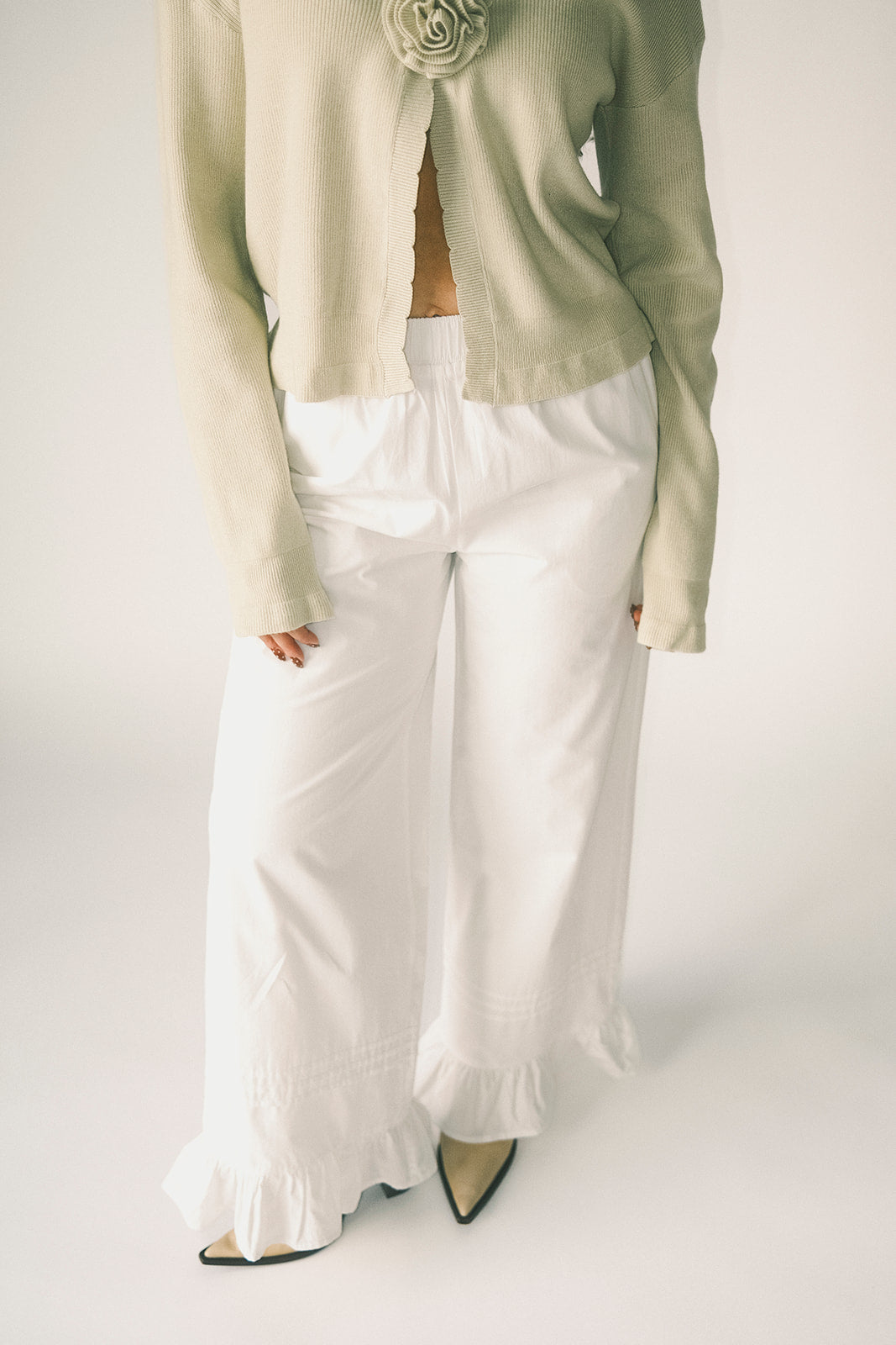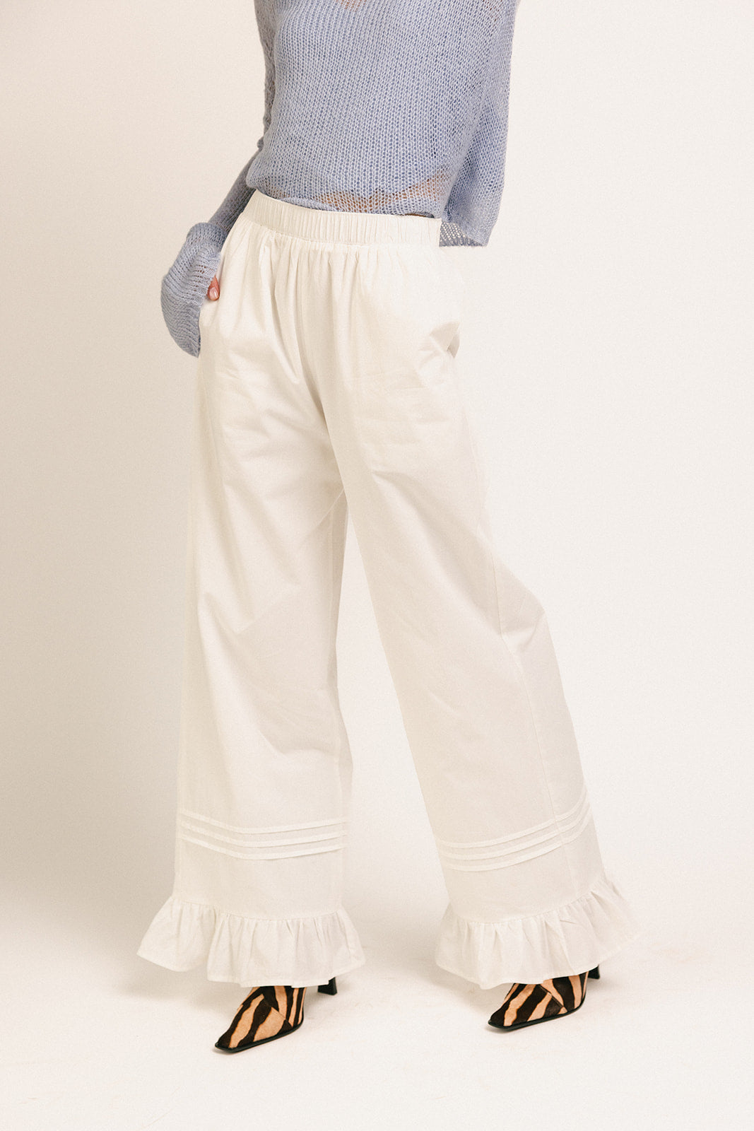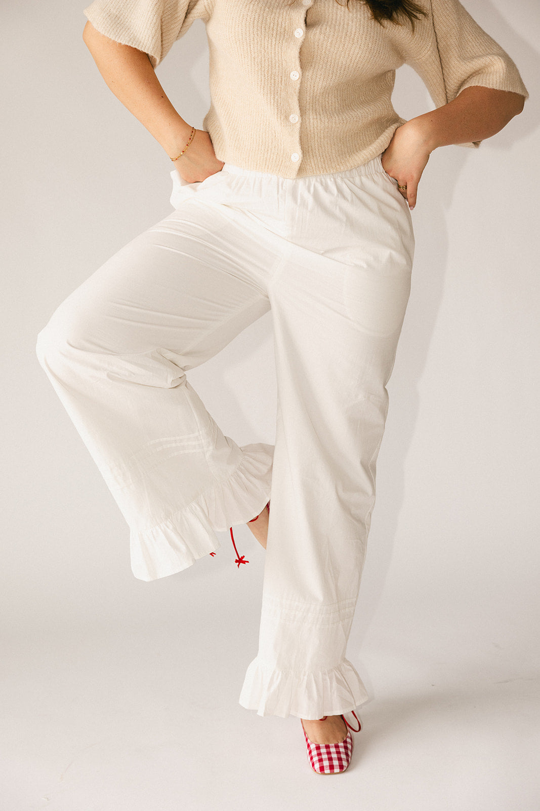 Där coolt möter komfort; dessa vita byxor med vida ben är gjorda för att kläs upp eller avslappnat för varje säsong och situation. Med en luftig silhuett och eleganta volangdetaljer i fållen ger de en antydan av sötma och stil till vilken outfit som helst. Vi älskar att matcha dem med tröjor, linnen, t-shirts och i princip allt vi kan.