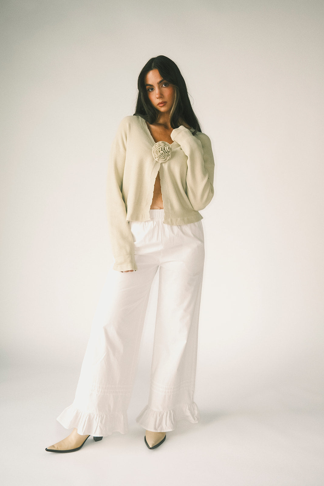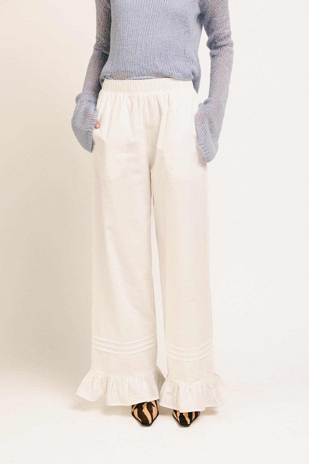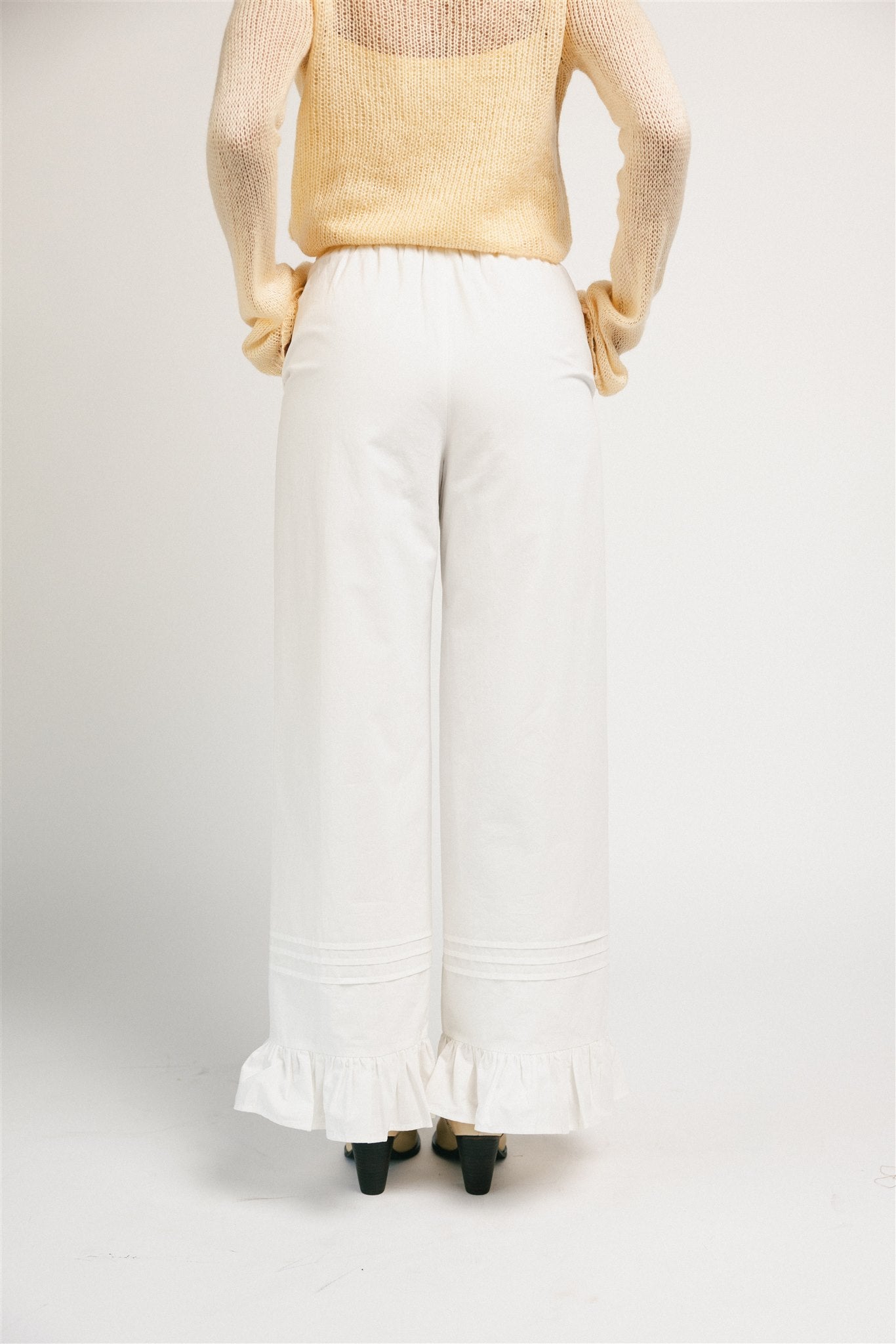 Där coolt möter komfort; dessa vita byxor med vida ben är gjorda för att kläs upp eller avslappnat för varje säsong och situation. Med en luftig silhuett och eleganta volangdetaljer i fållen ger de en antydan av sötma och stil till vilken outfit som helst. Vi älskar att matcha dem med tröjor, linnen, t-shirts och i princip allt vi kan.