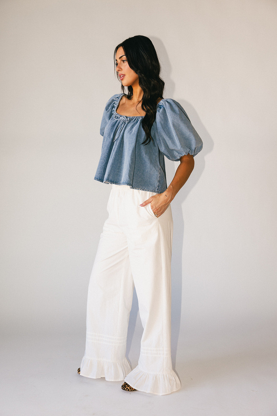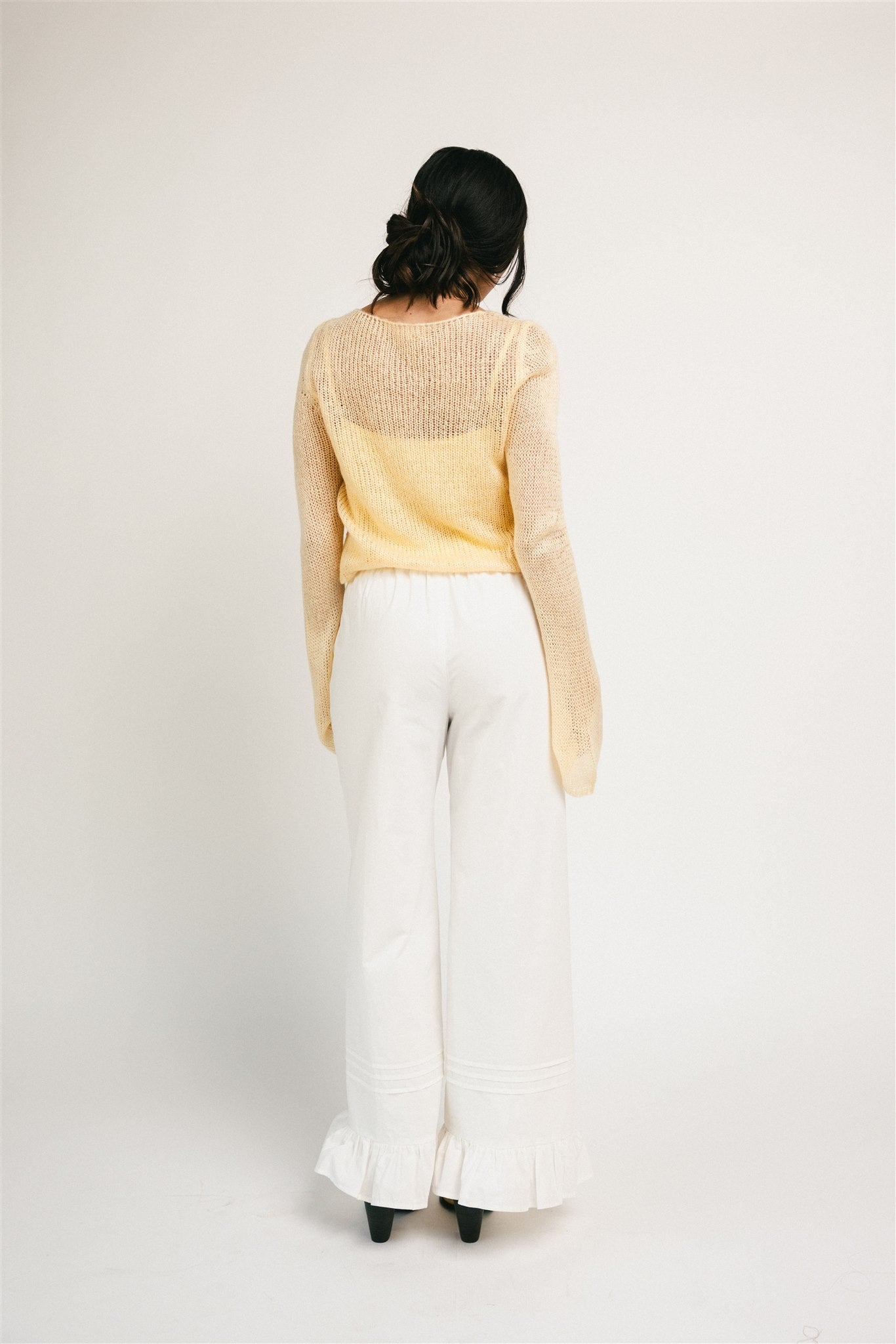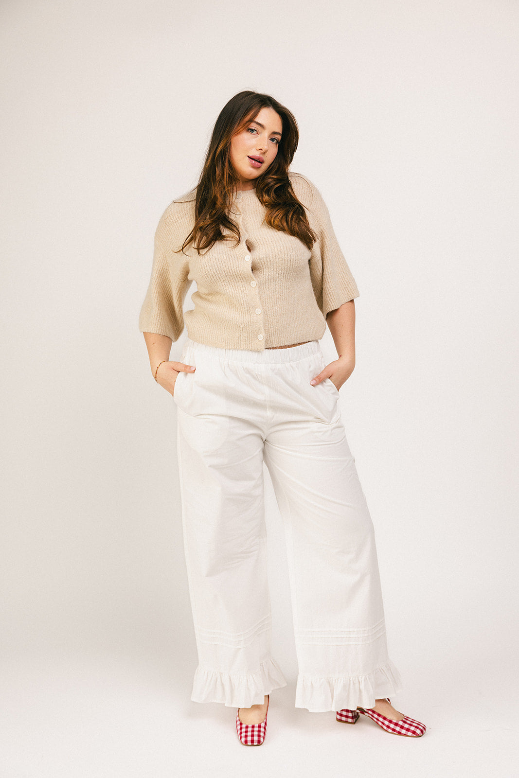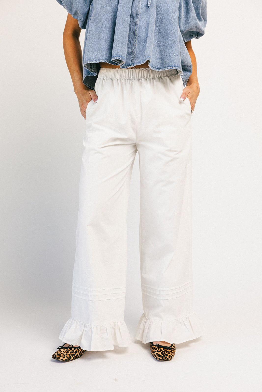 Där coolt möter komfort; dessa vita byxor med vida ben är gjorda för att kläs upp eller avslappnat för varje säsong och situation. Med en luftig silhuett och eleganta volangdetaljer i fållen ger de en antydan av sötma och stil till vilken outfit som helst. Vi älskar att matcha dem med tröjor, linnen, t-shirts och i princip allt vi kan.